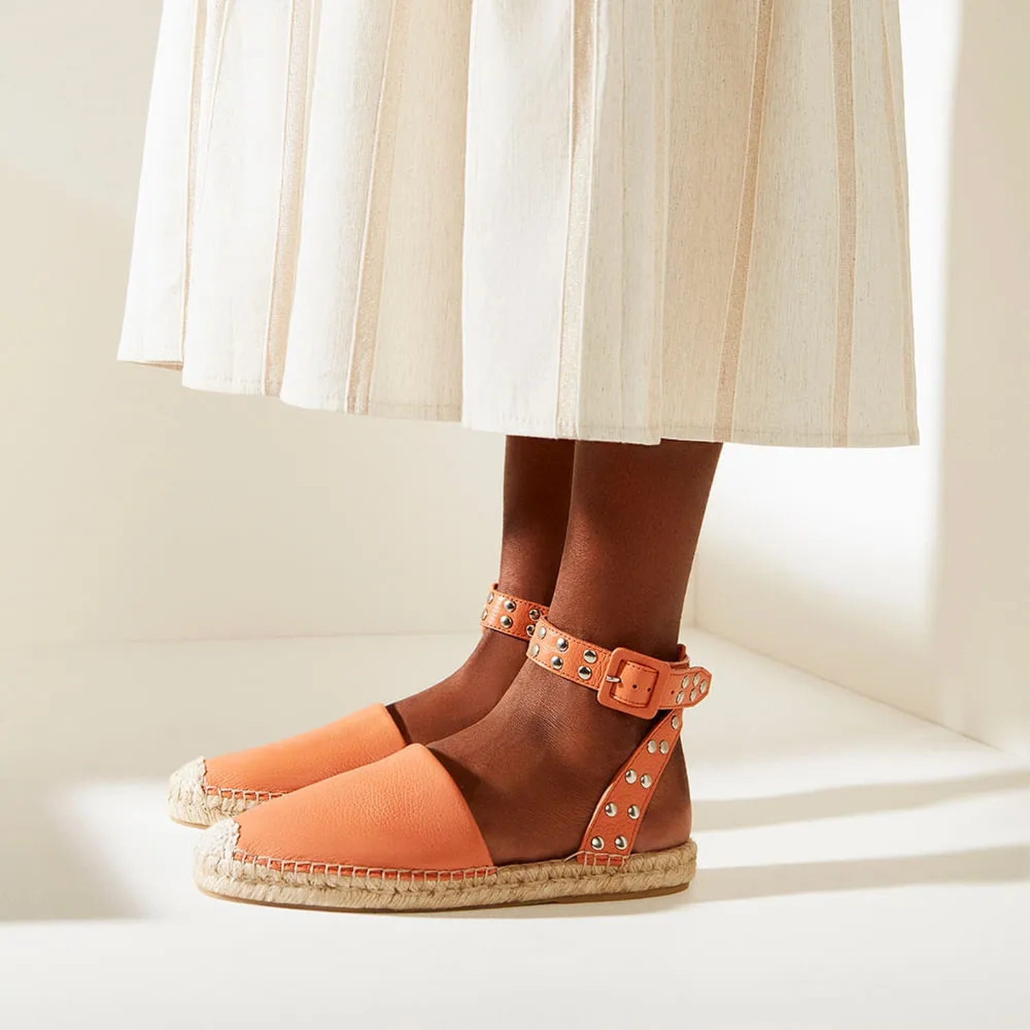 A Alpargata Ava é confeccionada com mix de materiais. Sua construção conta com cabedal em couro, seu fechamento é feito por tira com aplicação de tachas que confere atitude à peça e conta ainda com detalhe da fivela forrada. Destaque para o solado de borracha que agrega conforto ao caminhar e para palmilha feita em corda. Um modelo que une conforto e identidade de moda sendo uma das principais apostas da Summer Collection 22' Paula Torres, pois reafirma a assinatura vanguardista da marca.