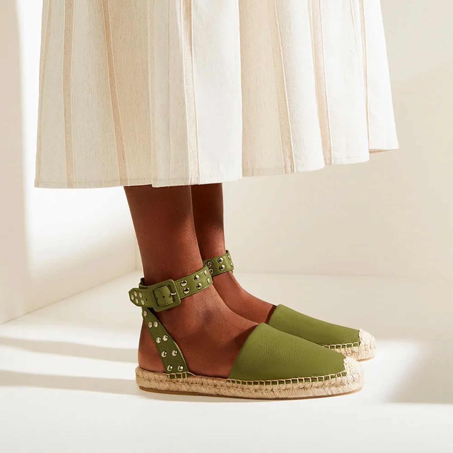 A Alpargata Ava é confeccionada com mix de materiais. Sua construção conta com cabedal em couro, seu fechamento é feito por tira com aplicação de tachas que confere atitude à peça e conta ainda com detalhe da fivela forrada. Destaque para o solado de borracha que agrega conforto ao caminhar e para palmilha feita em corda. Um modelo que une conforto e identidade de moda sendo uma das principais apostas da Summer Collection 22' Paula Torres, pois reafirma a assinatura vanguardista da marca.