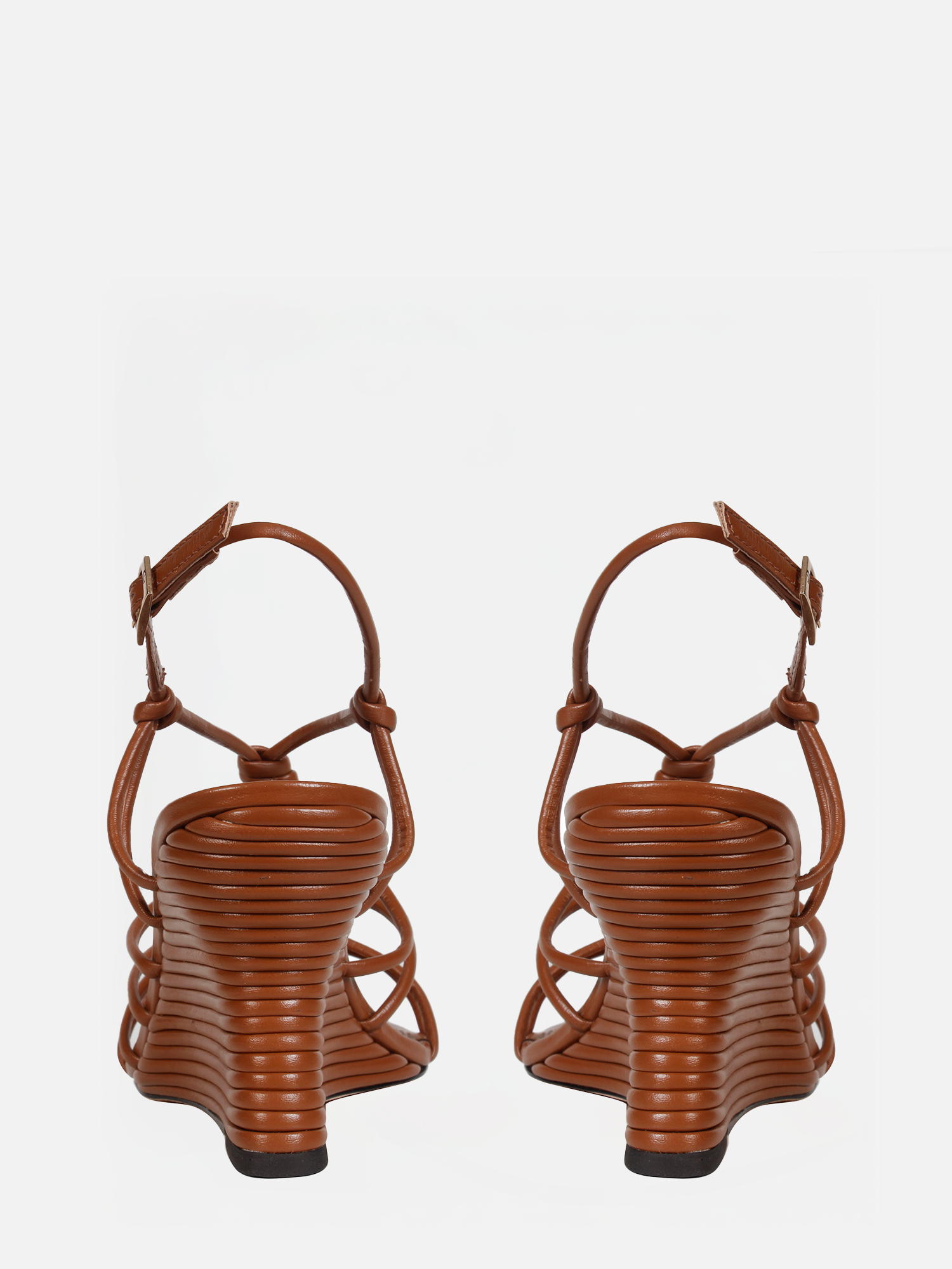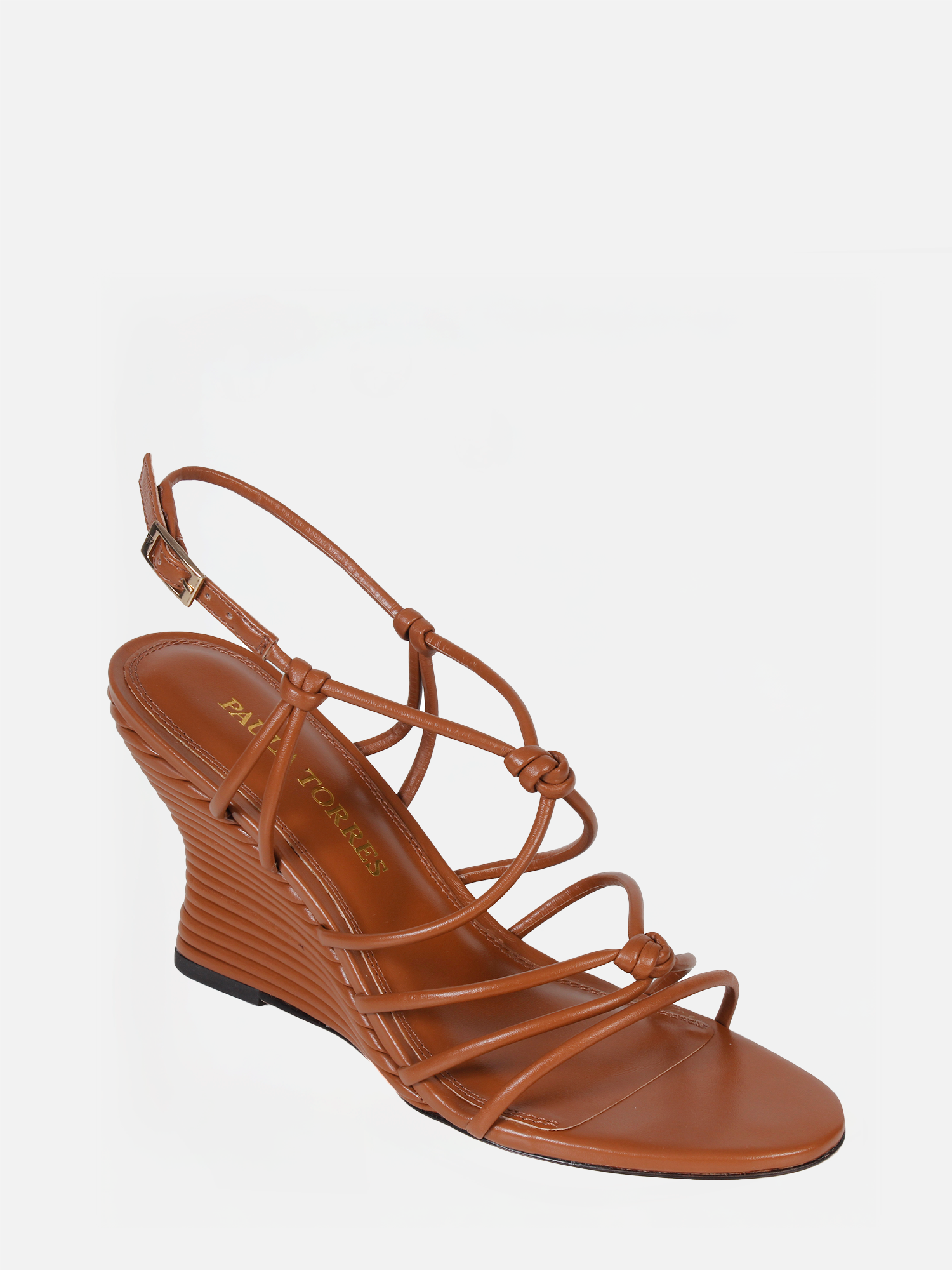 A Anabela Kendal é produzida em couro. O design do modelo inclui tiras finas sobre o peito do pé que formam discretos nós, já no calcanhar o ajuste é feito por meio de uma fivela lateral, garantindo um encaixe seguro e confortável. Além disso, o salto sinuoso é destacado por tiras de couro que formam um canelado, adicionando um detalhe estiloso e único à peça.