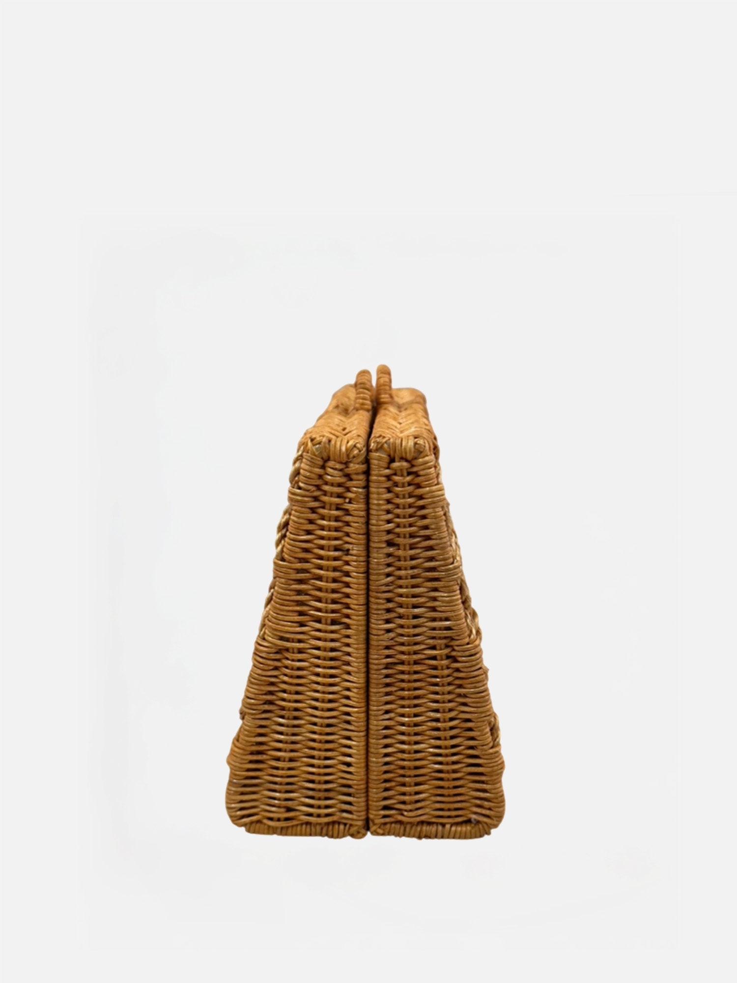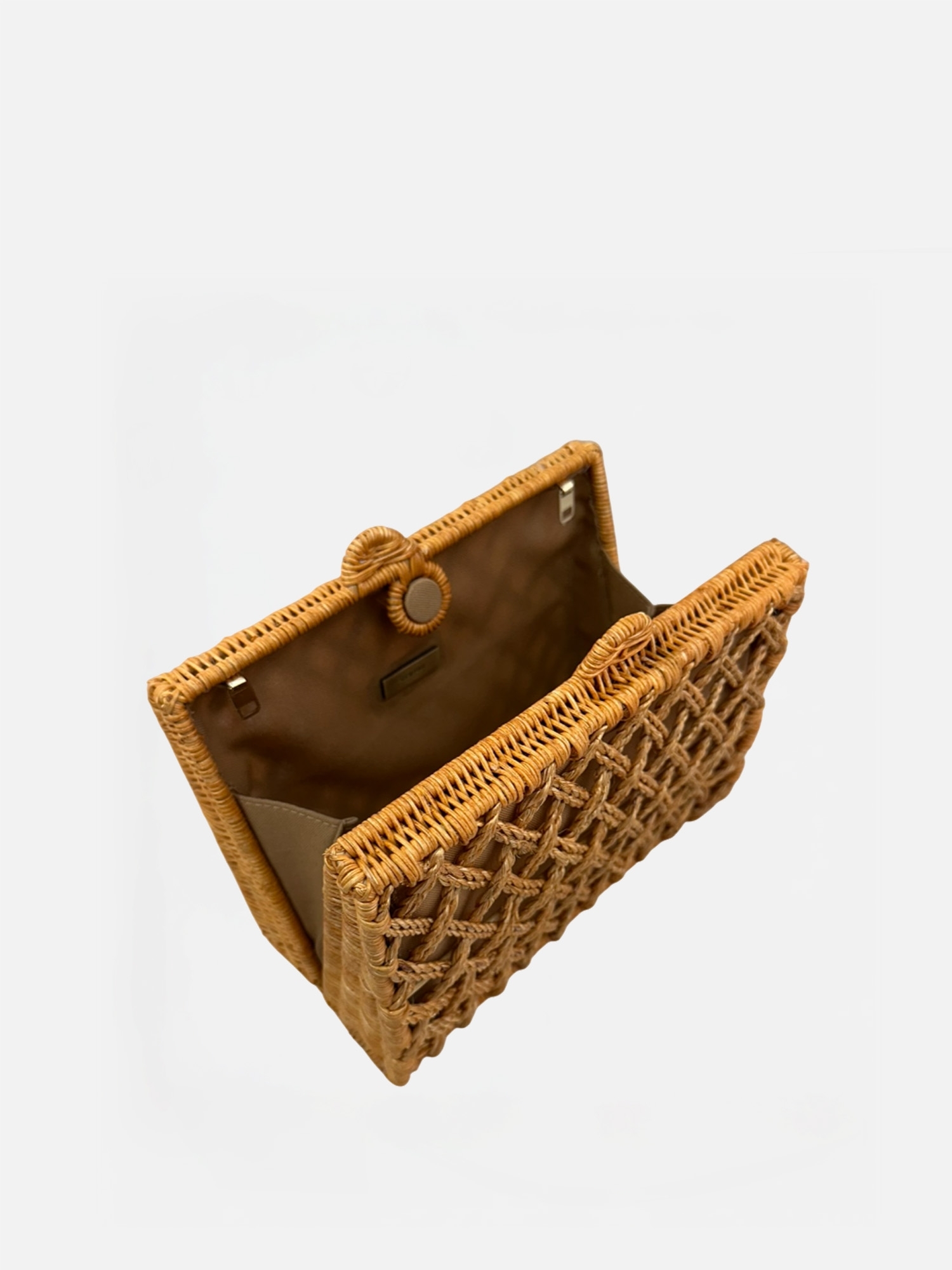 Bolsa clutch estruturada, confeccionada em vime e palha trançada artesanalmente, com padrão entrelaçado que confere um visual natural e elegante. Possui estrutura rígida, acabamento cuidadosamente trabalhado e fecho superior com magnético. Internamente, conta com um forro em tecido, garantindo praticidade e proteção aos seus pertences. Perfeita para compor looks de verão, passeios ao ar livre ou eventos à beira-mar, une o charme rústico e sofisticado do trabalho artesanal característico da parceria entre Serpui e Paula Torres.