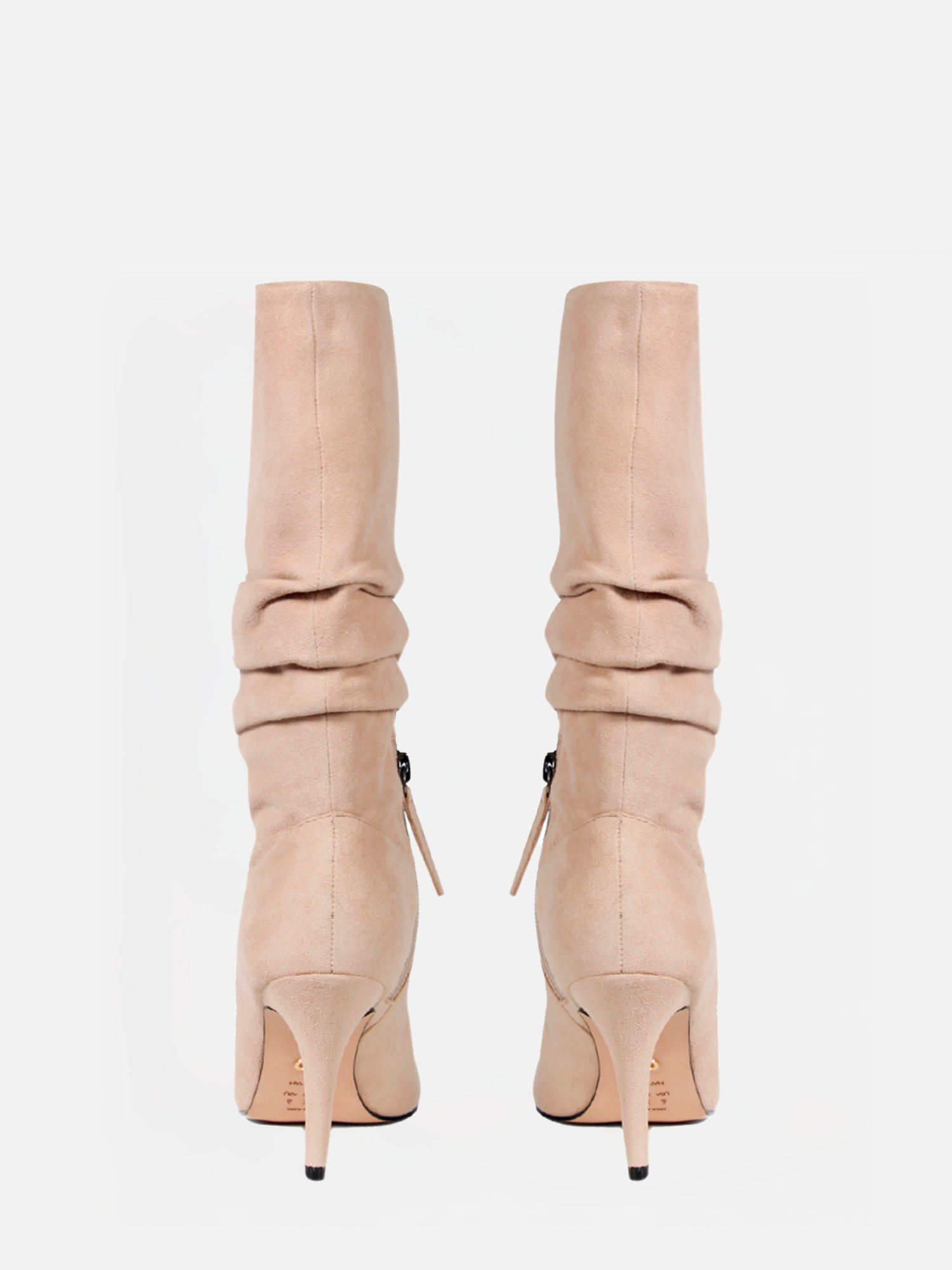 A Bota Carmel é confeccionada em couro. O modelo do tipo slouch que foi um sucesso na década de 80, chega com personalidade e é uma das apostas da Winter Collection 22 " Paula Torres. A construção delicada conta com efeito franzido no cano, salto médio e fechamento com zíper lateral.