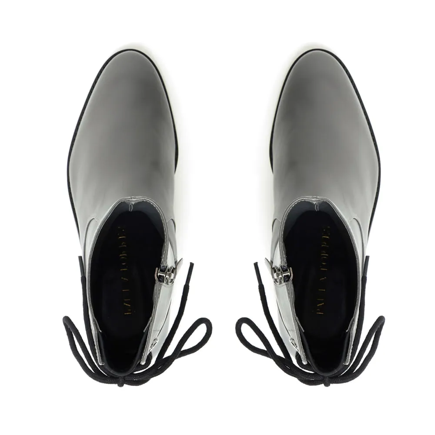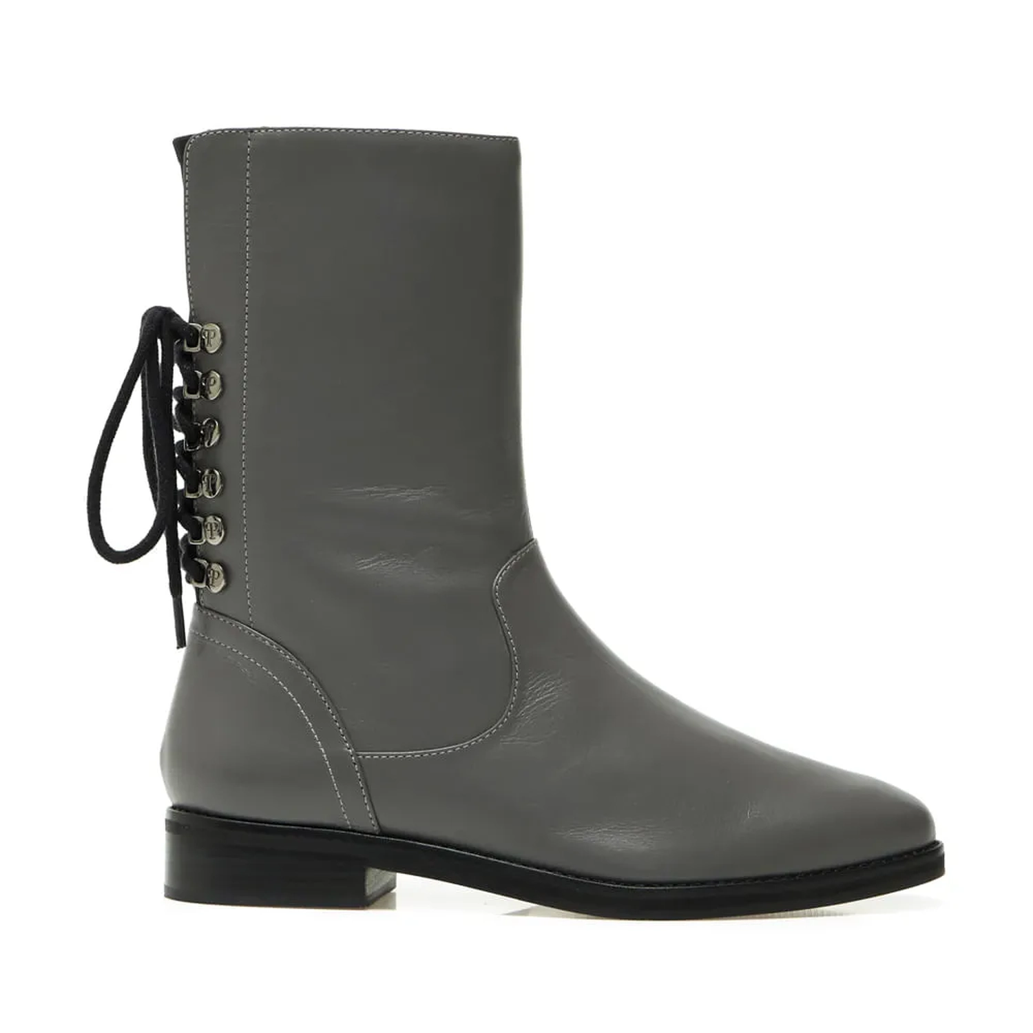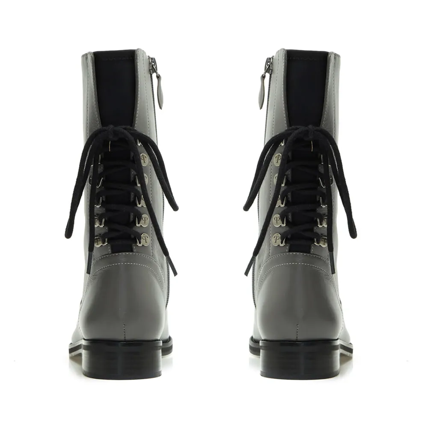A Bota Genebra é confeccionada em couro. Modelagem em cano médio no estilo coturno, bico levemente arrendodado, salto baixo e detalhes de recorte em todo cabedal. Como protagonista a amarração com passantes em metal com o logo da marca e aplicação de neoprene na parte trasseira da peça.