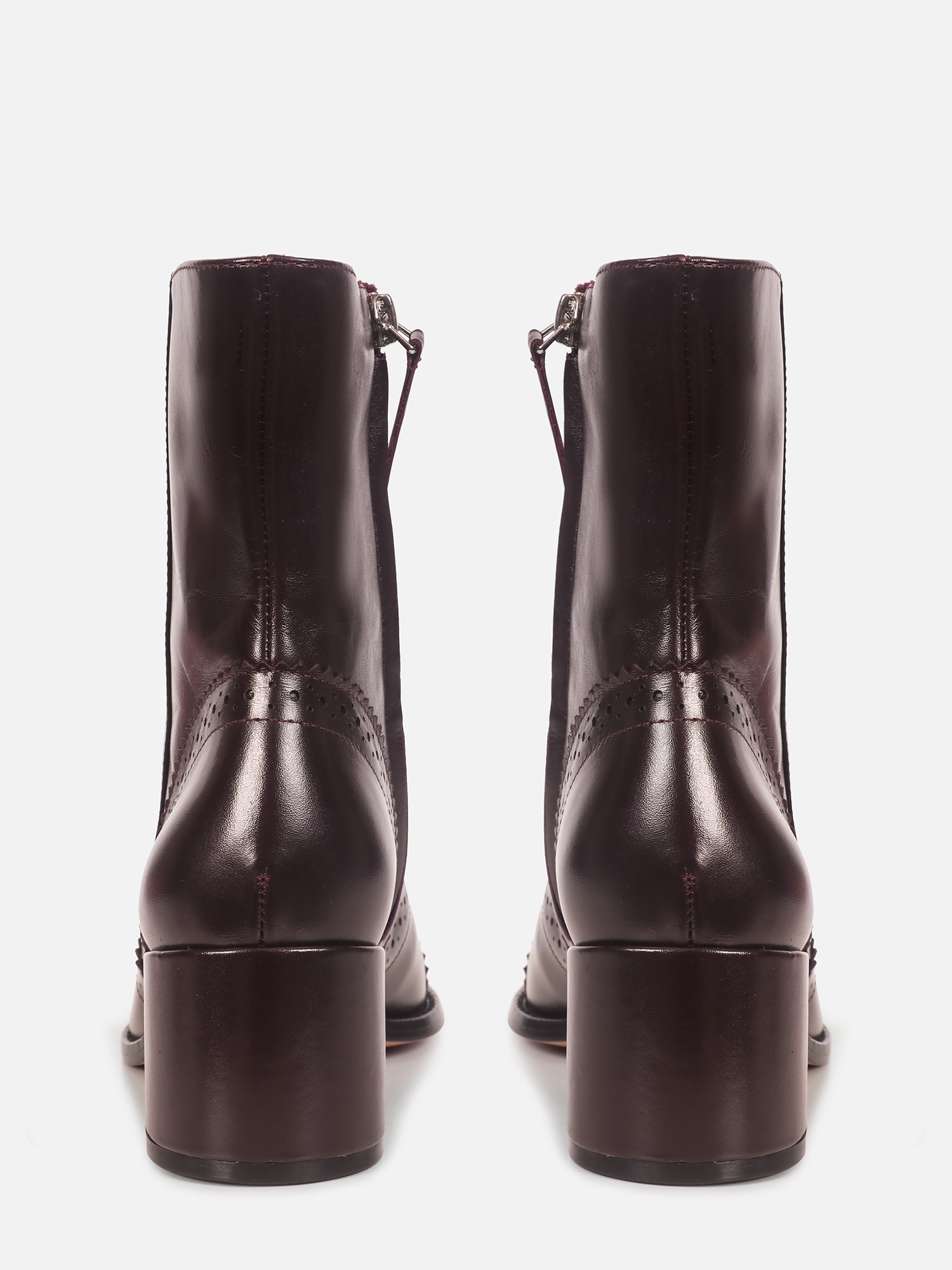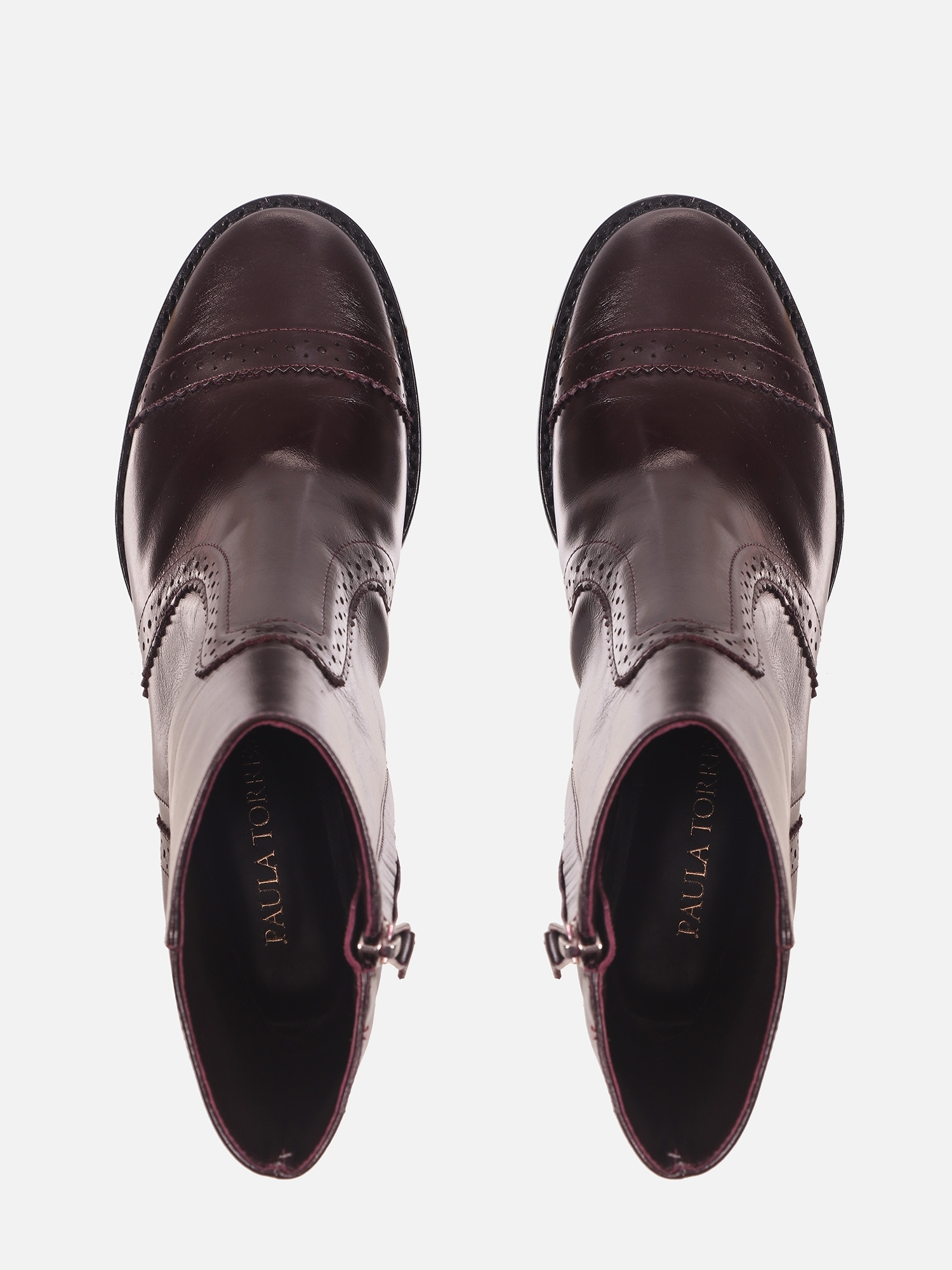 A Bota Giu é produzida em couro, trazendo um visual sofisticado e marcante com acabamento brilhoso. O modelo de cano curto apresenta recortes clássicos e detalhes perfurados no cabedal, conhecidos como brogues, que valorizam o design e adicionam personalidade ao produto. Conta com salto médio grosso, que garante conforto e estabilidade no uso diário, fechamento interno por zíper e solado de couro, que confere acabamento premium, maior durabilidade e melhor respirabilidade, elevando a qualidade do produto.