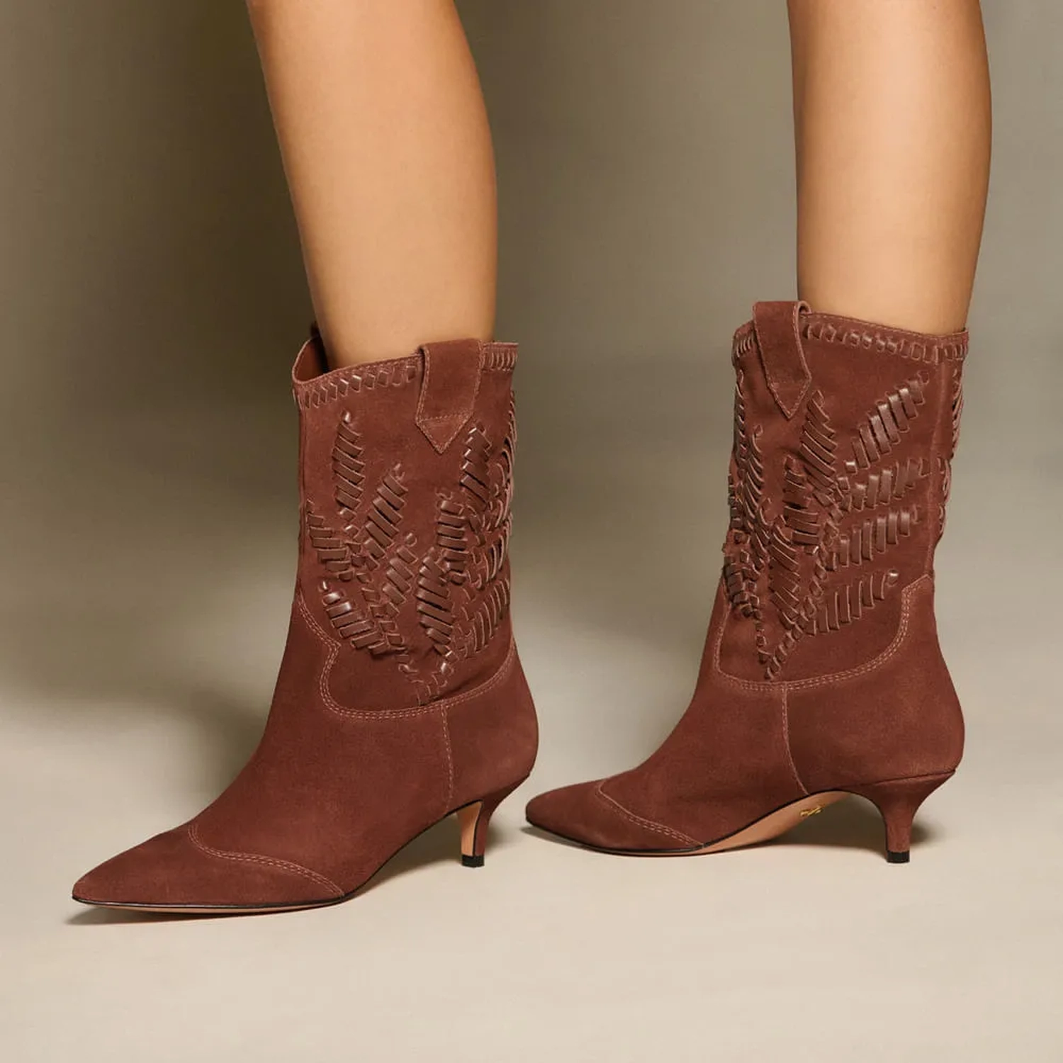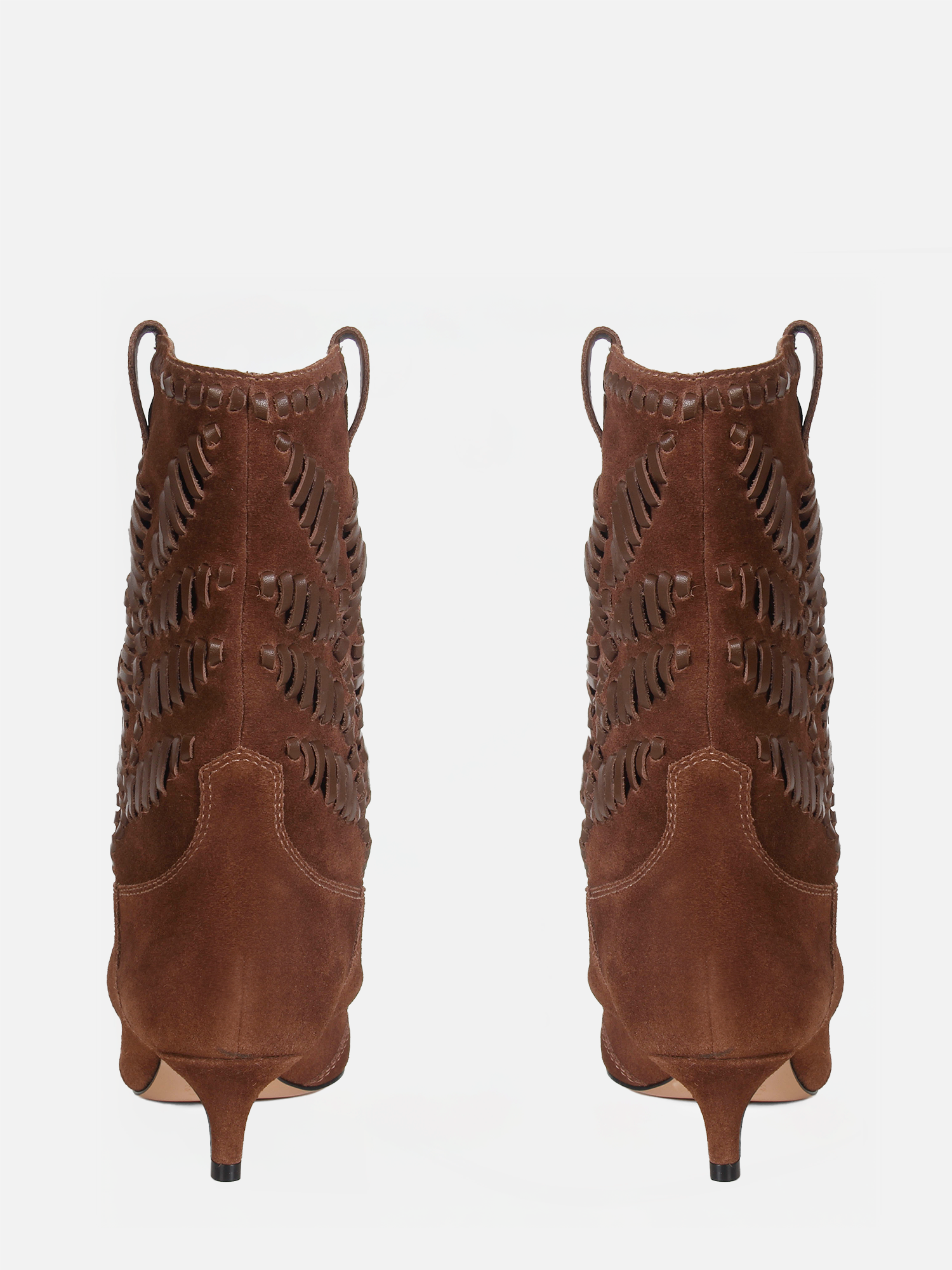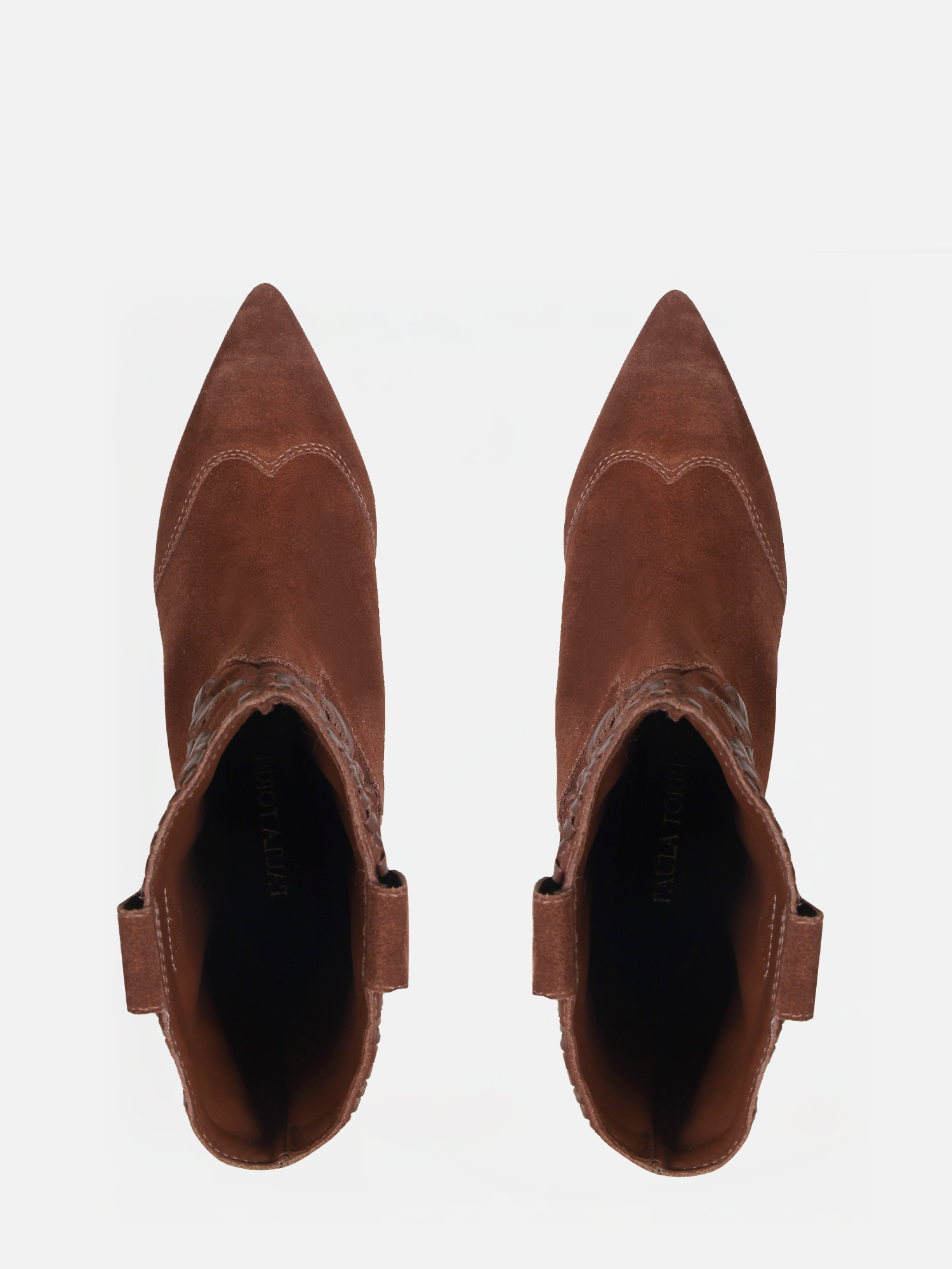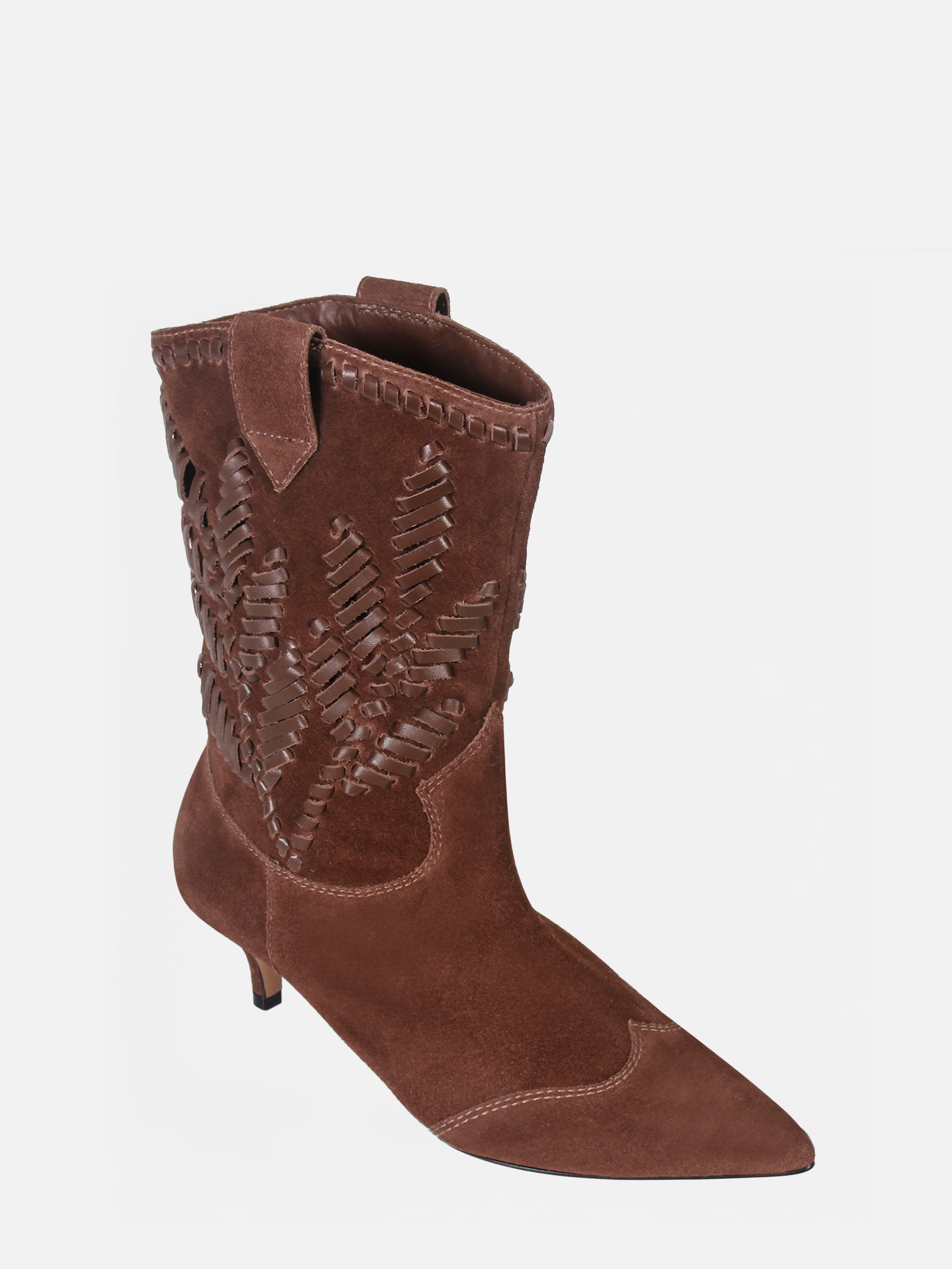A Bota Helo é confeccionada em couro. O modelo, inspirado no estilo western, apresenta bico fino alongado e salto baixo e fino. O cano de altura média é adornado por enfiados em couro, formando belíssimas folhas na lateral do cano, acrescentando um toque único à peça. O solado em couro assegura durabilidade e um acabamento refinado.