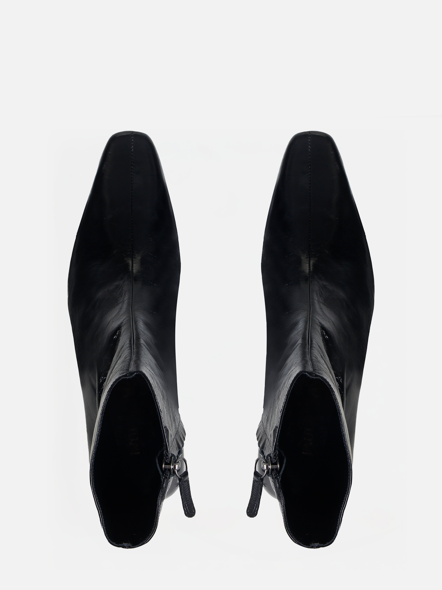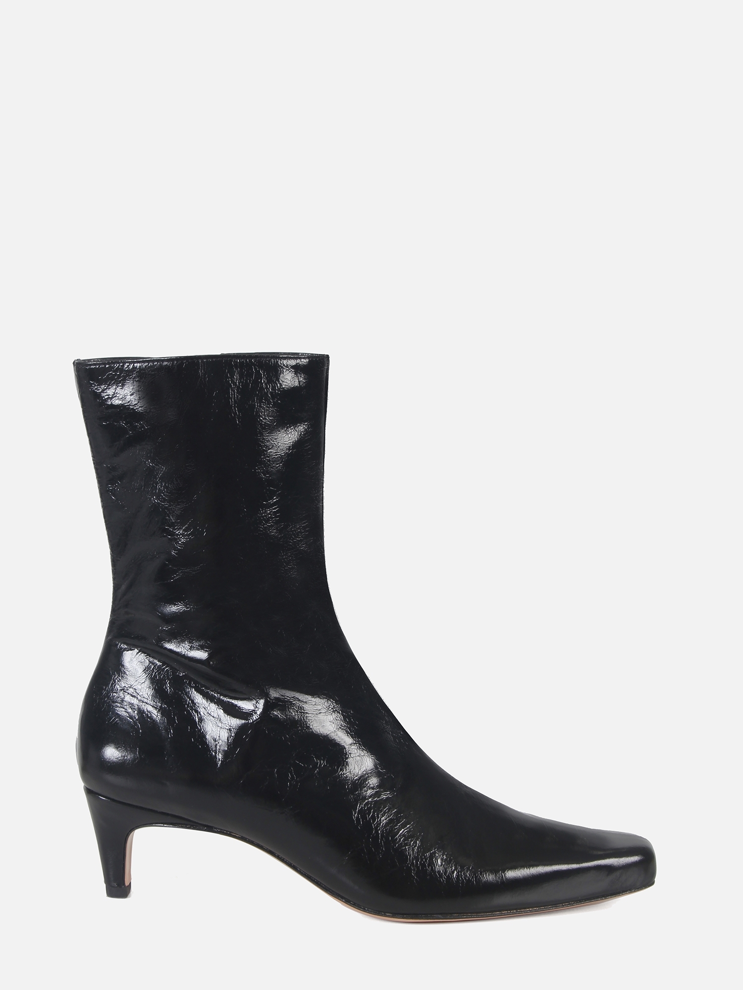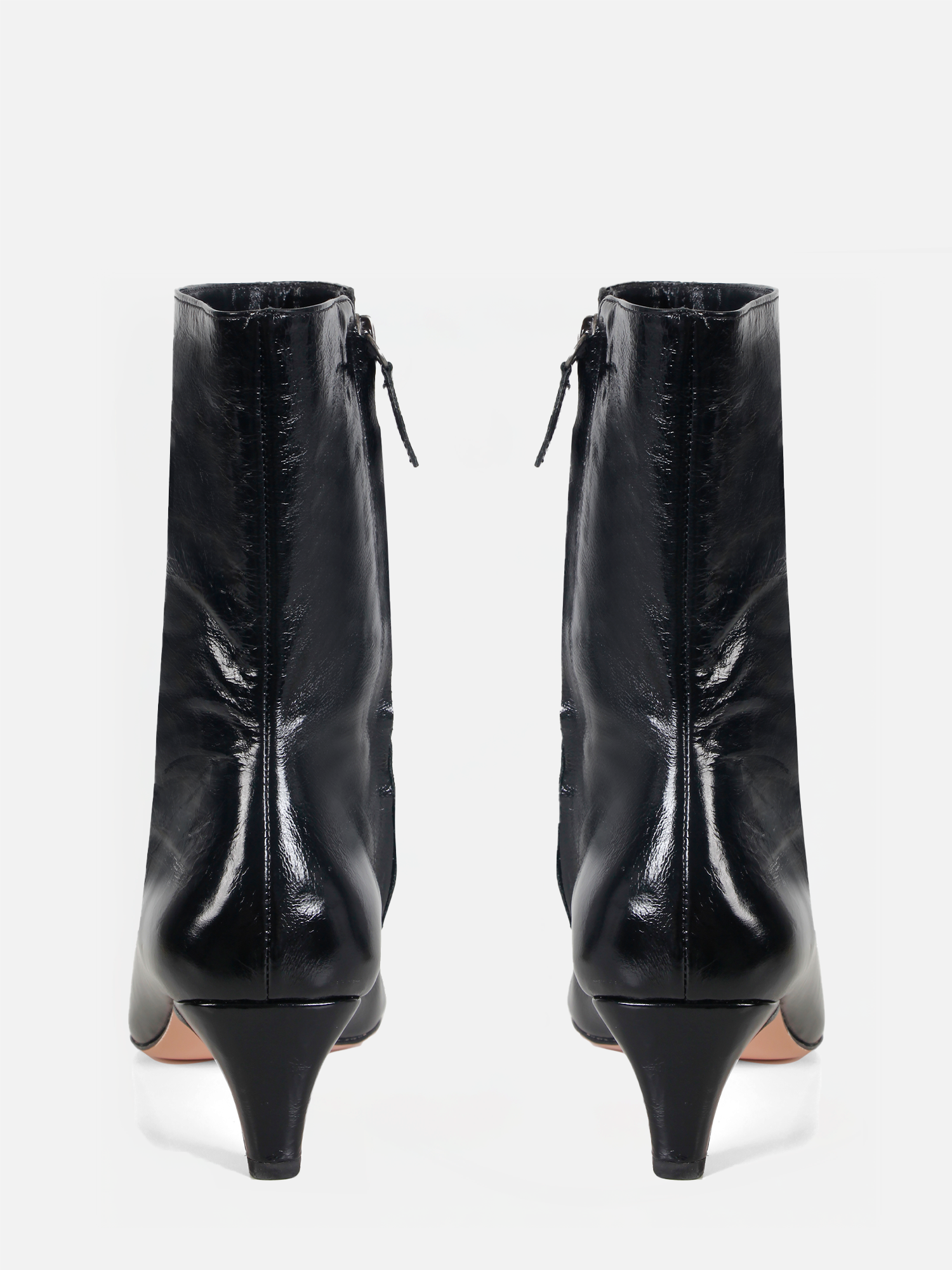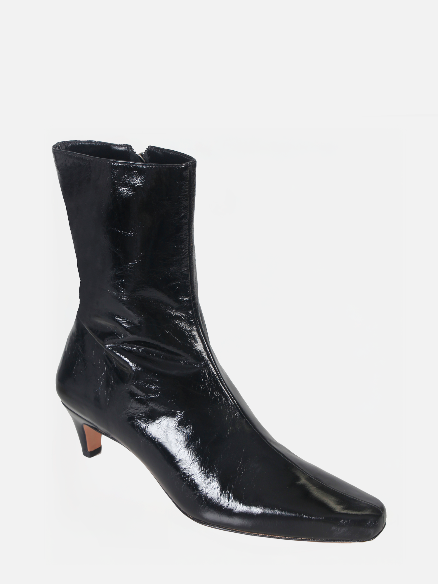 A Bota Julia é confeccionada em couro macio com um toque de brilho, agregando elegância ao design. O modelo apresenta bico alongado quadrado e cano médio ajustado à perna. O fechamento é feito por zíper lateral, enquanto o solado em couro garante durabilidade e sofisticação.