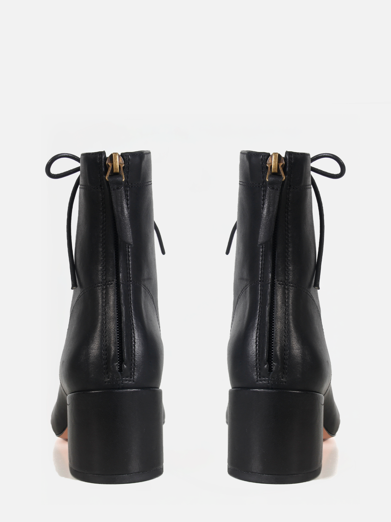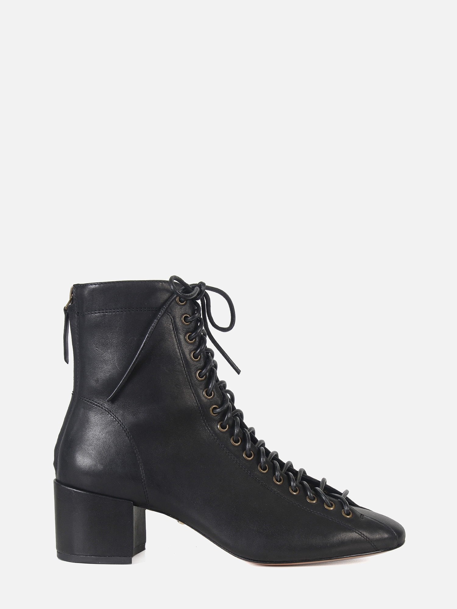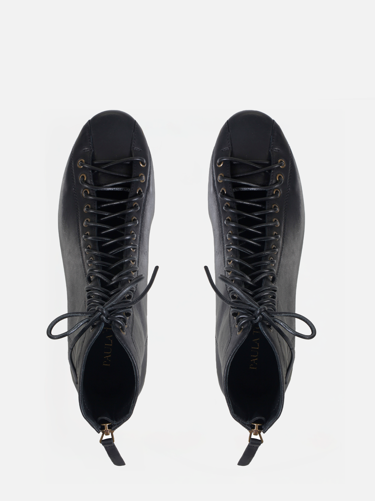 A Bota Lola é confeccionada em couro. Com salto bloco de altura média, bico arredondado e cano médio, destaca-se pela amarração frontal em couro, que passa por ilhós ao longo de toda a extensão, garantindo um ajuste preciso ao pé e tornozelo. Para maior praticidade, conta com um zíper na parte traseira, facilitando o calce. O solado em couro reforça a durabilidade e sofisticação do modelo.