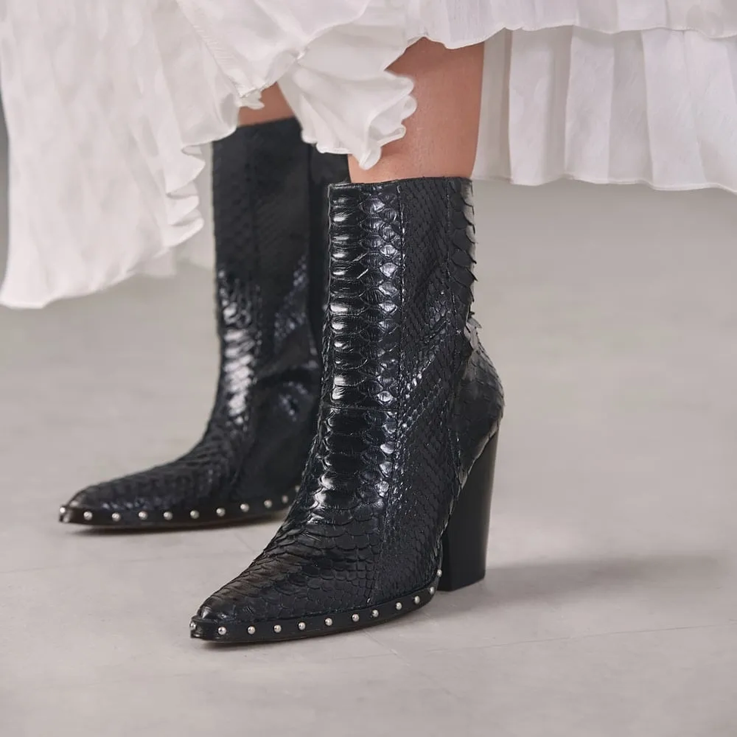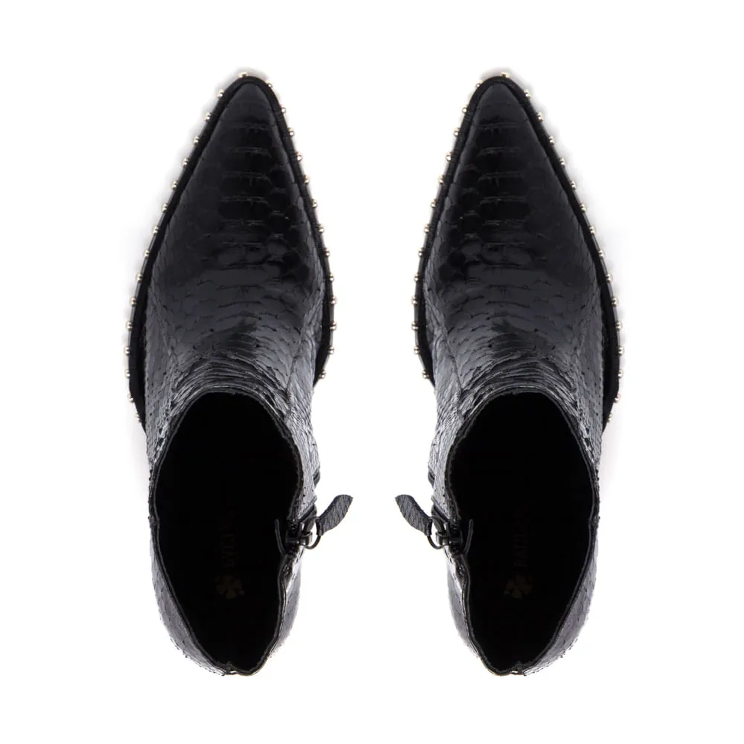 Bota exclusiva que é uma verdadeira jóia nos pés. De couro phyton, tachas na lateral, bico fino e muito estilo e sofisticação. Coleção cápsula com poucas unidades, garanta a sua. Cor: Preto