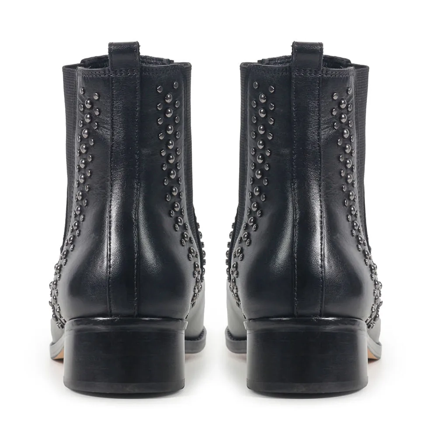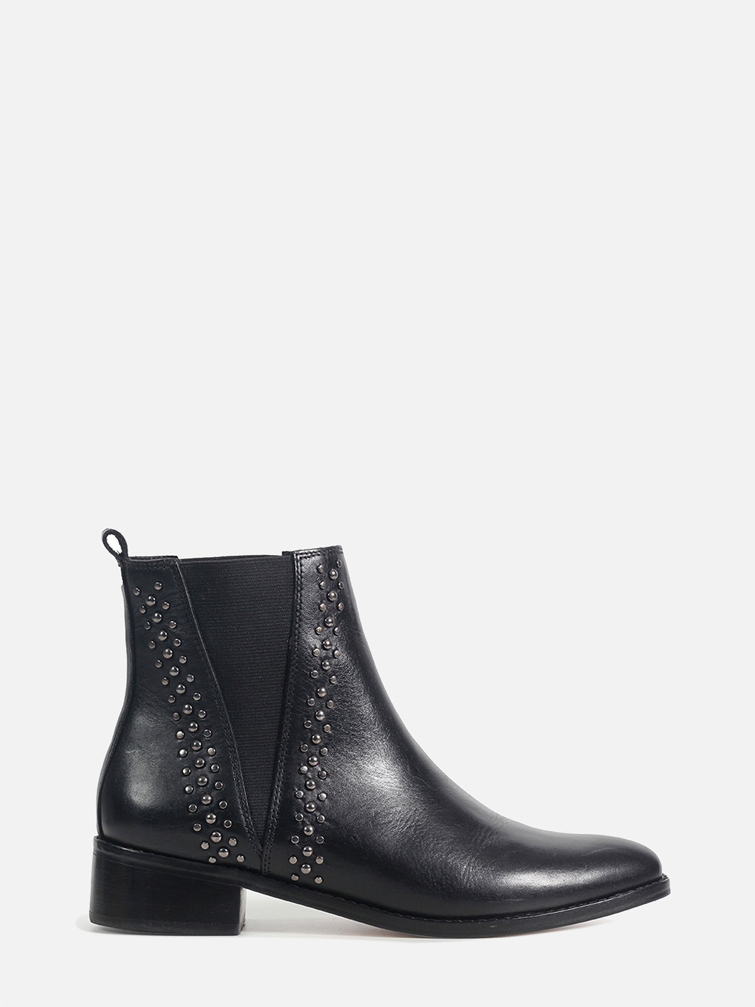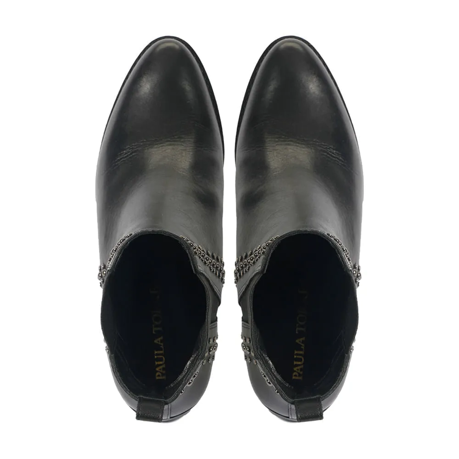 A Bota Madri é confeccionada em napa. O modelo conta com salto baixo bloco e bico redondo. Possui vira em couro preto e detalhe para o elástico preto em V, contornado por rebites.