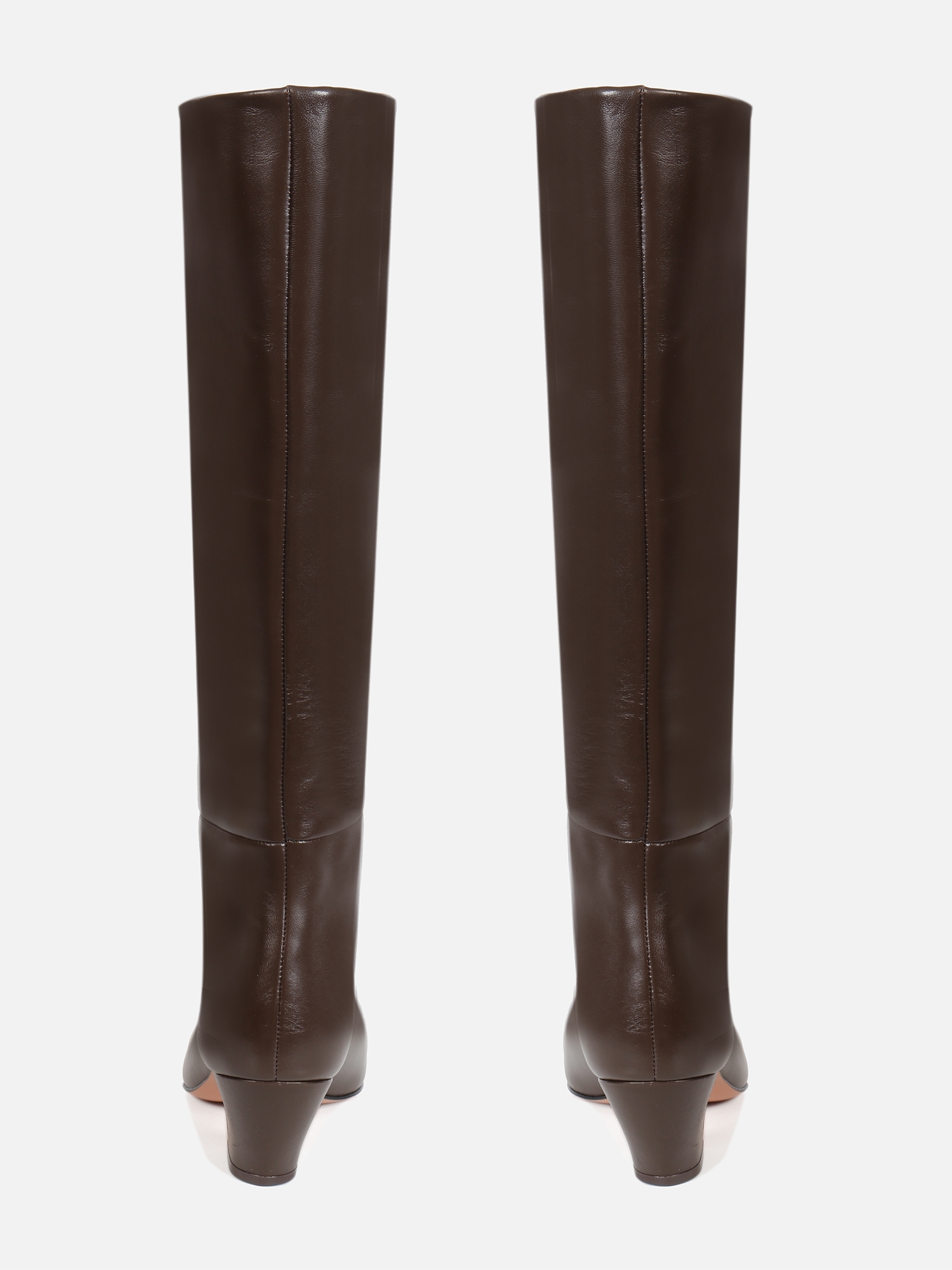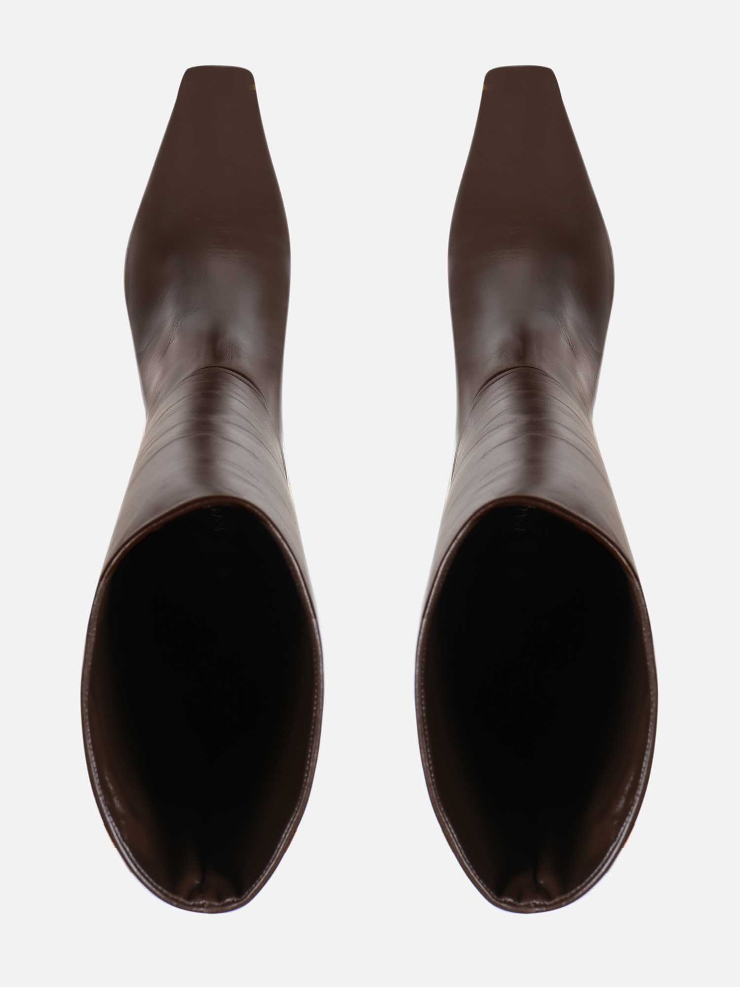 A Bota Marici é confeccionada em couro, trazendo textura macia e acabamento sofisticado ao modelo. Com bico levemente quadrado e cano alto estruturado, a peça transmite elegância contemporânea e presença marcante na composição. O salto médio grosso adiciona modernidade ao design, equilibrando estilo e conforto. O solado em couro reforça a qualidade e o cuidado nos acabamentos, garantindo estabilidade e um caminhar seguro.