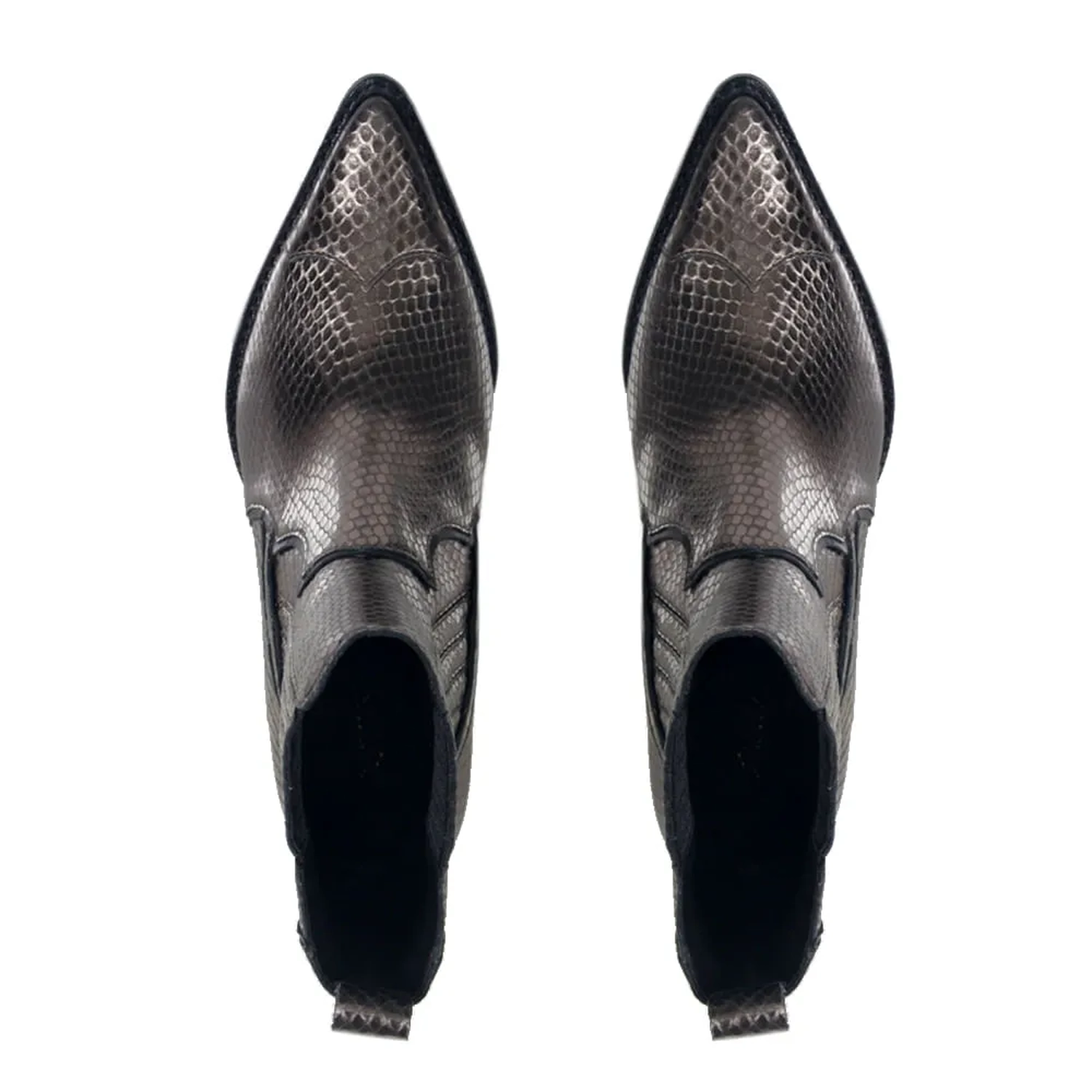 Inspirada no estilo Western, a Bota Parma Aço apresenta um estilo despojado e autêntico Paula Torres. Confeccionada em couro em mini lezard metalizado, a modelagem em bico fino e salto robusto, conferem conforto e estilo à peça. O prespontado dá um toque especial ao modelo, tornando-o ainda mais autêntico. Muito estilo e conforto, traduzindo o DNA da marca.
