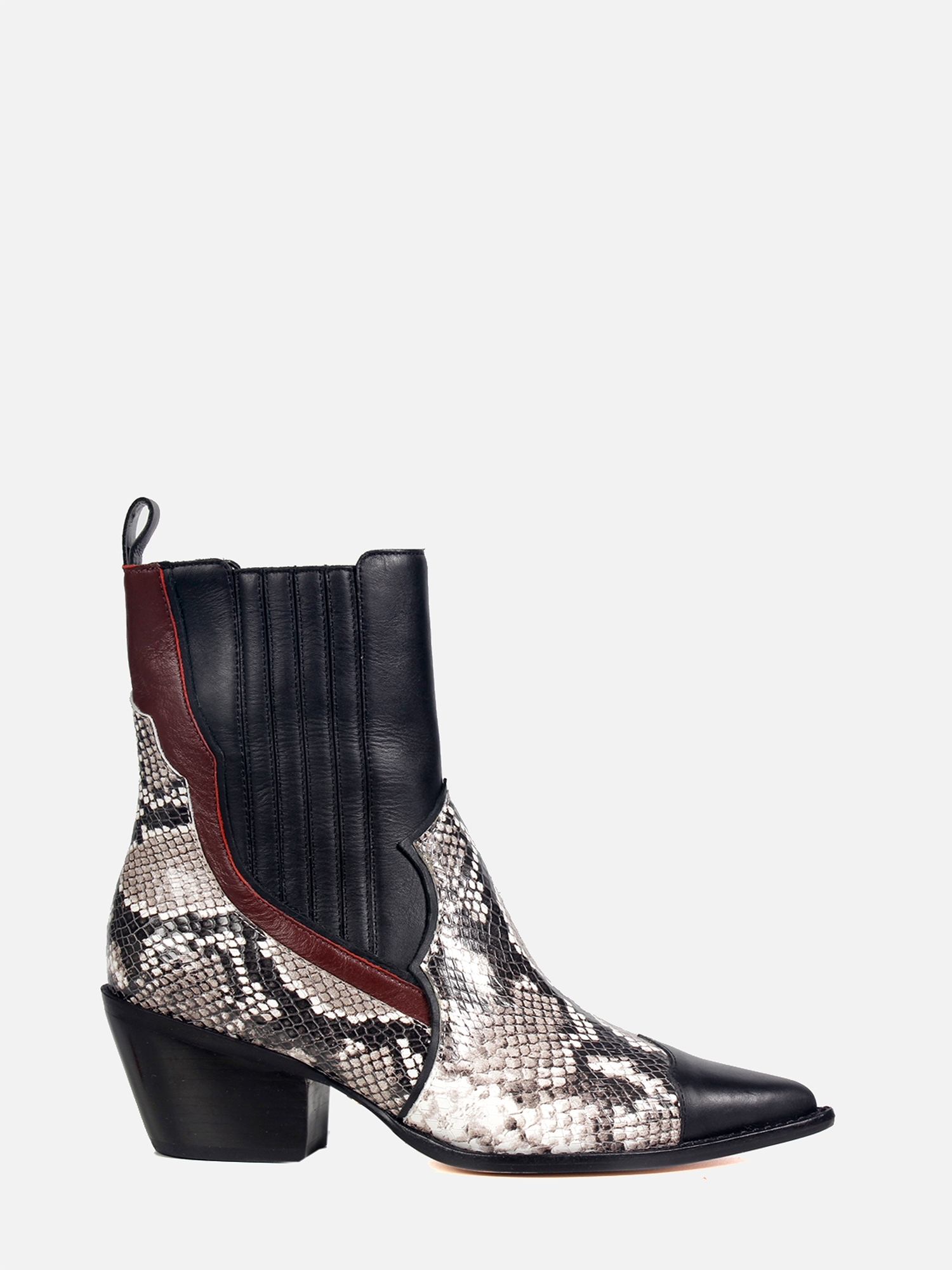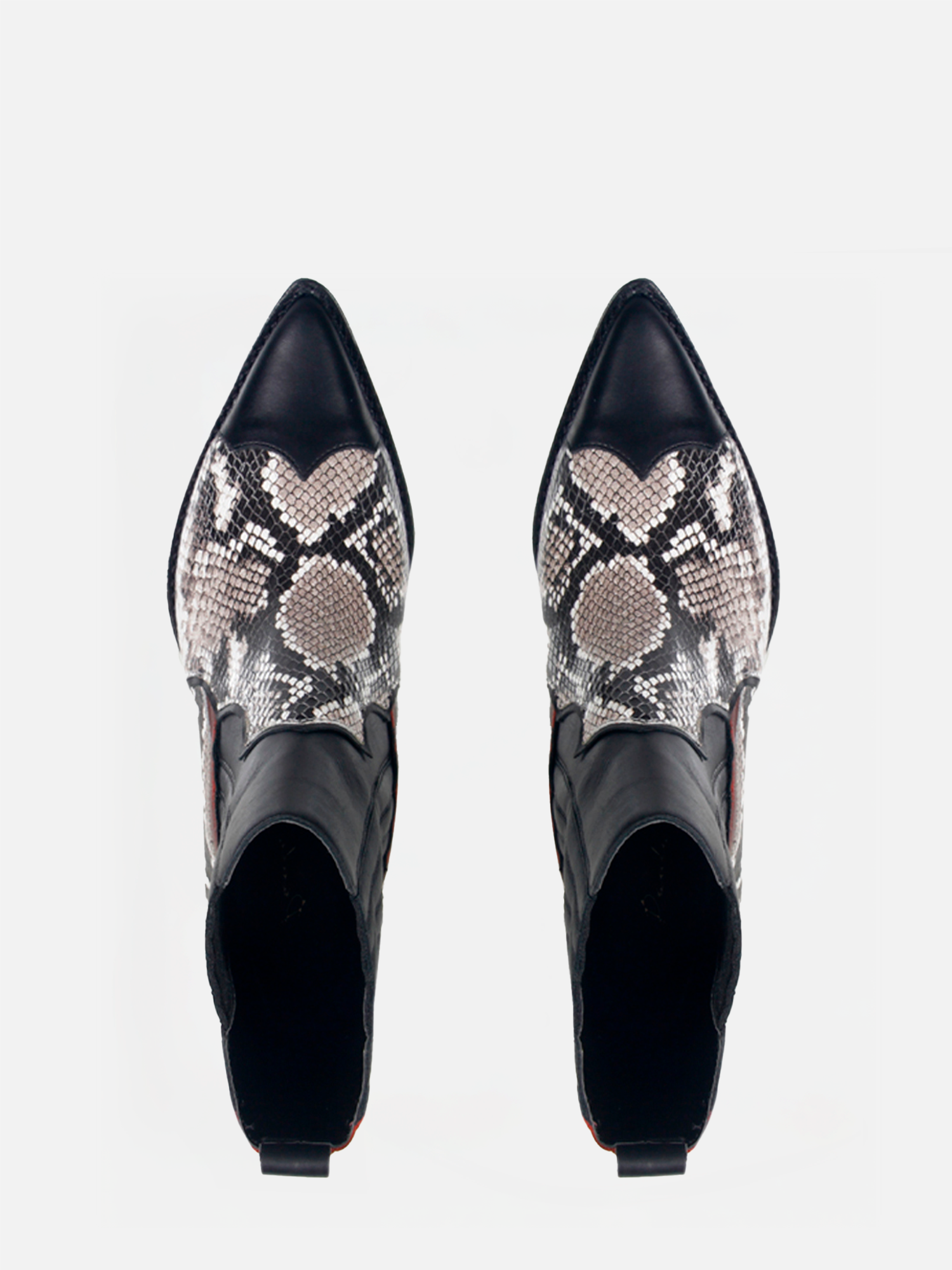 Inspirada no estilo Western, a Bota Parma Animal Print apresenta um estilo despojado e autêntico Paula Torres. Confeccionada em couro na cor preta e estampado, a modelagem em bico fino e salto robusto, conferem conforto e estilo à peça. O prespontado dá um toque especial ao modelo, tornando-o ainda mais autêntico. Muito estilo e conforto, traduzindo o DNA da marca.