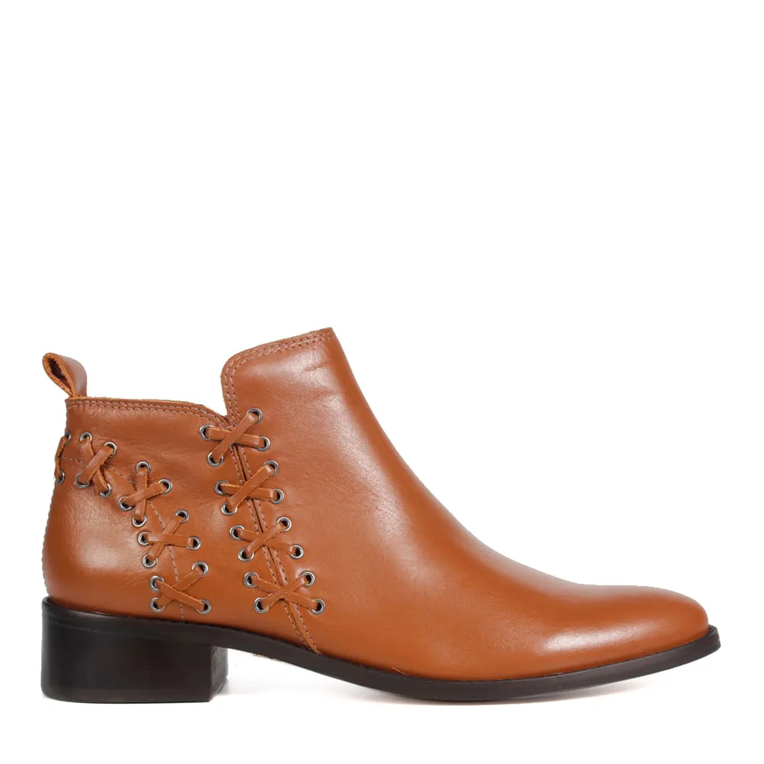 A Bota Ravena é confeccionada em couro. O modelo é construído em cano curto e conta com fechamento lateral por zíper. O grande destaque da peça está no acabamento, que apresenta ilhoses para o entrelaçamento de tiras em couro, formando um desenho que vai da base lateral circulando todo o calcanhar, conferindo assim charme e delicadeza ao modelo. Uma construção clássica revisitada que ganha sofisticação, identidade e charme através do DNA autoral Paula Torres.