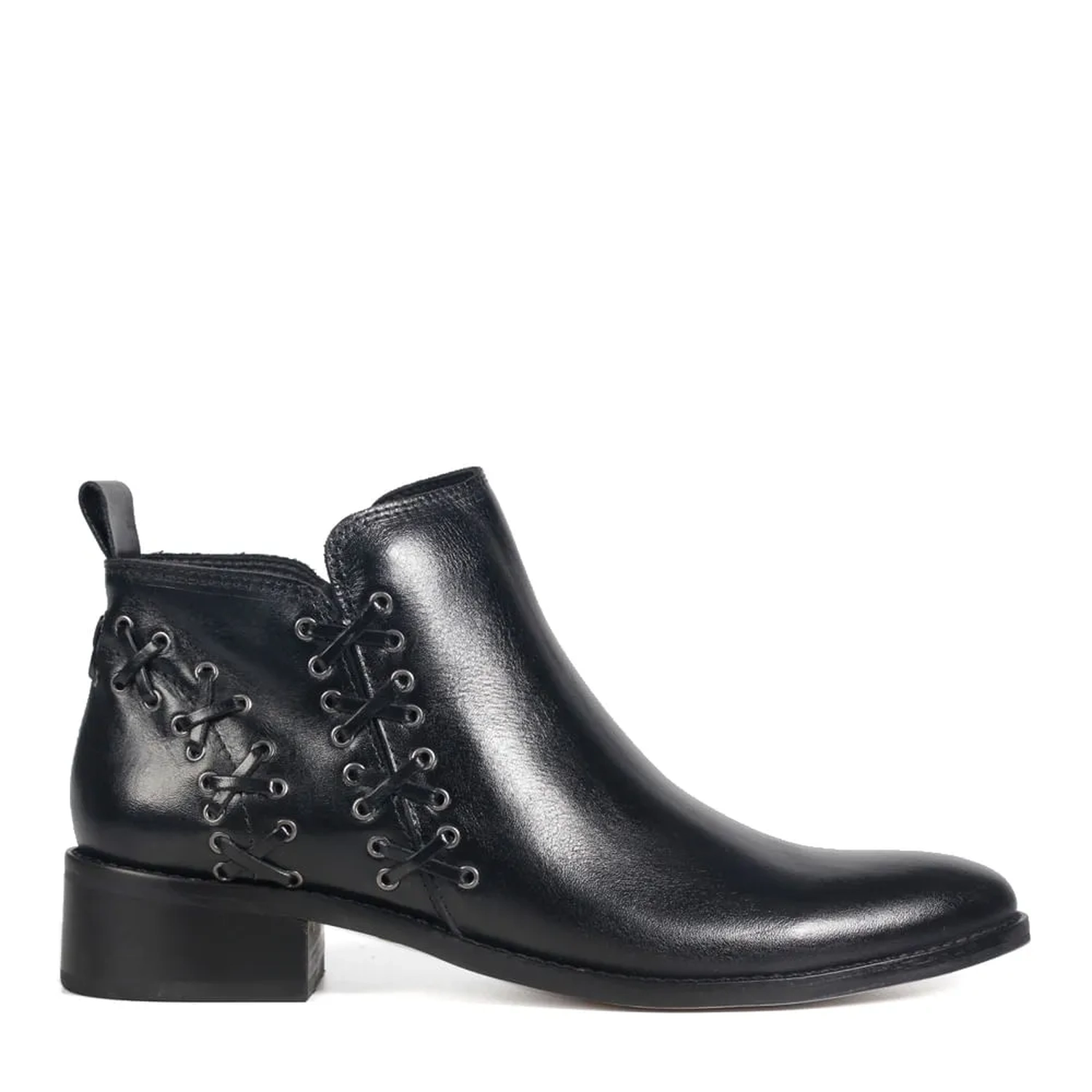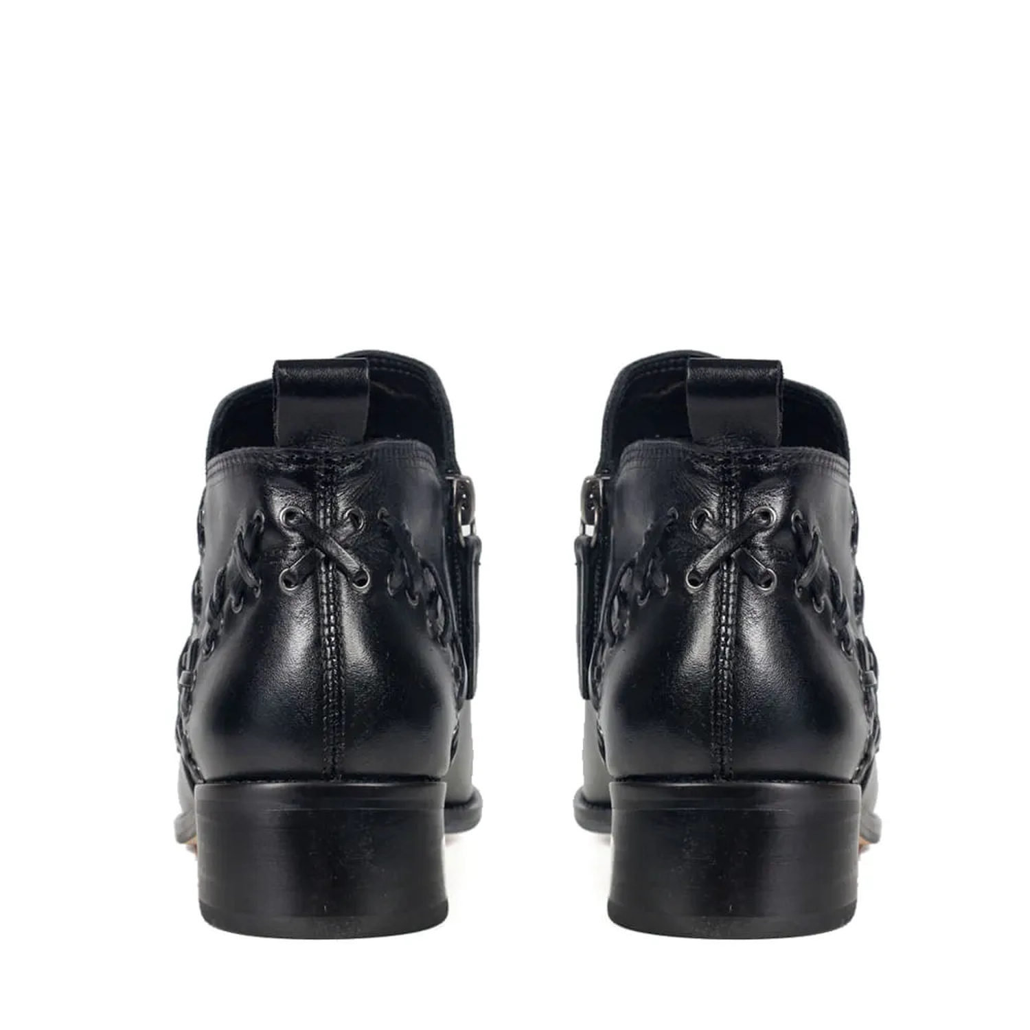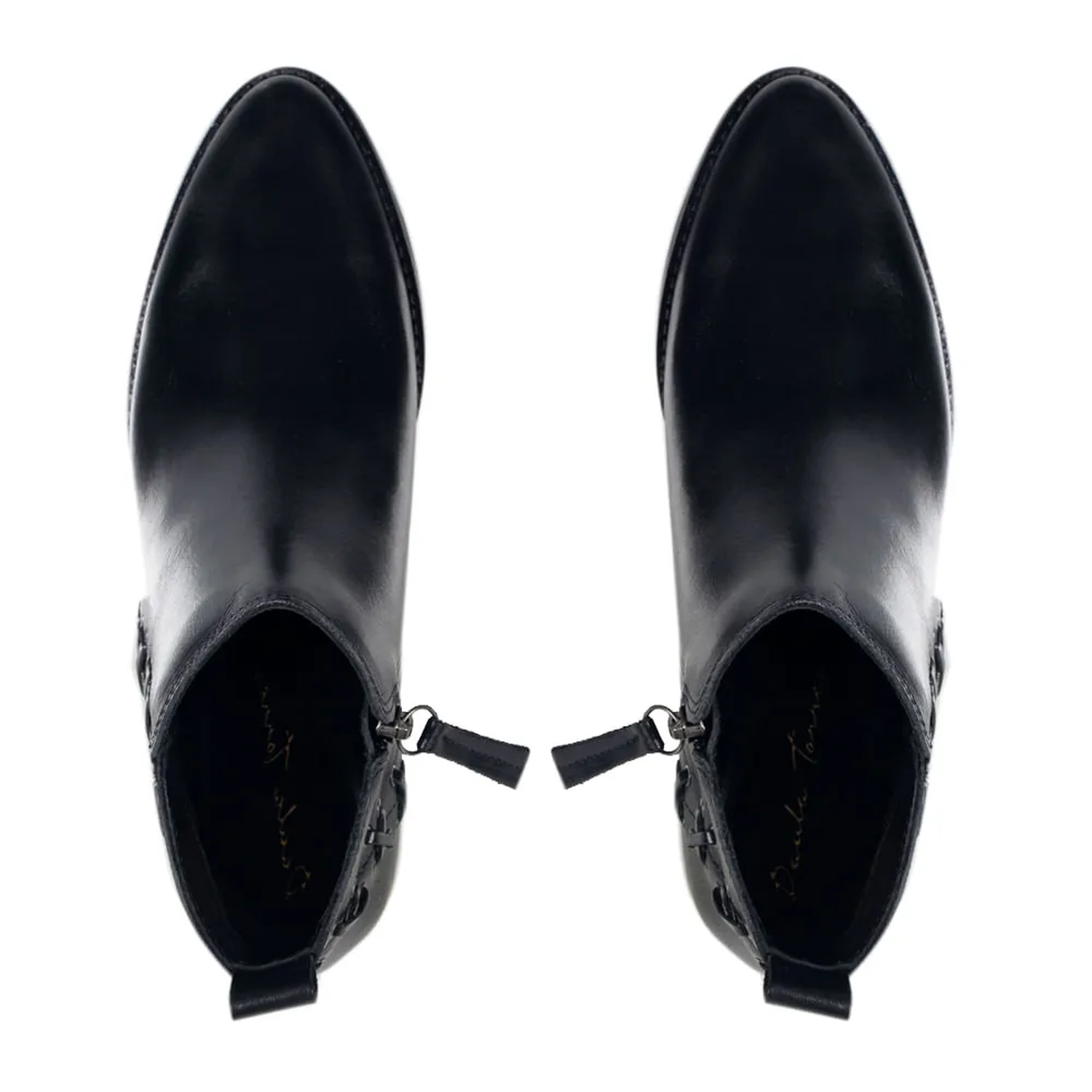A Bota Ravena é confeccionada em couro. O modelo é construído em cano curto e conta com fechamento lateral por zíper. O grande destaque da peça está no acabamento, que apresenta ilhoses para o entrelaçamento de tiras em couro, formando um desenho que vai da base lateral circulando todo o calcanhar, conferindo assim charme e delicadeza ao modelo. Uma construção clássica revisitada que ganha sofisticação, identidade e charme através do DNA autoral Paula Torres.
