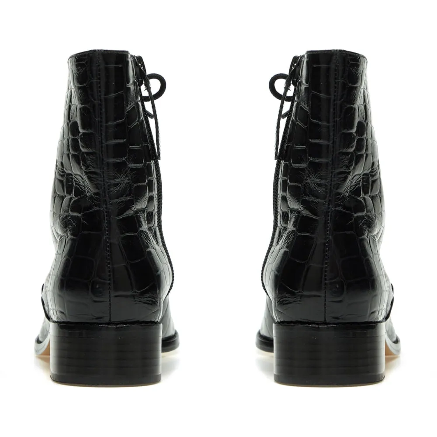 A Bota Roma é produzida em couro com estampa croco. O modelo possui bico alongado e cadarço frontal ajustável, para facilitar o calce, zíper lateral. No cabedal trabalho de pesponto manual, trazendo forte a identidade handmade da marca.