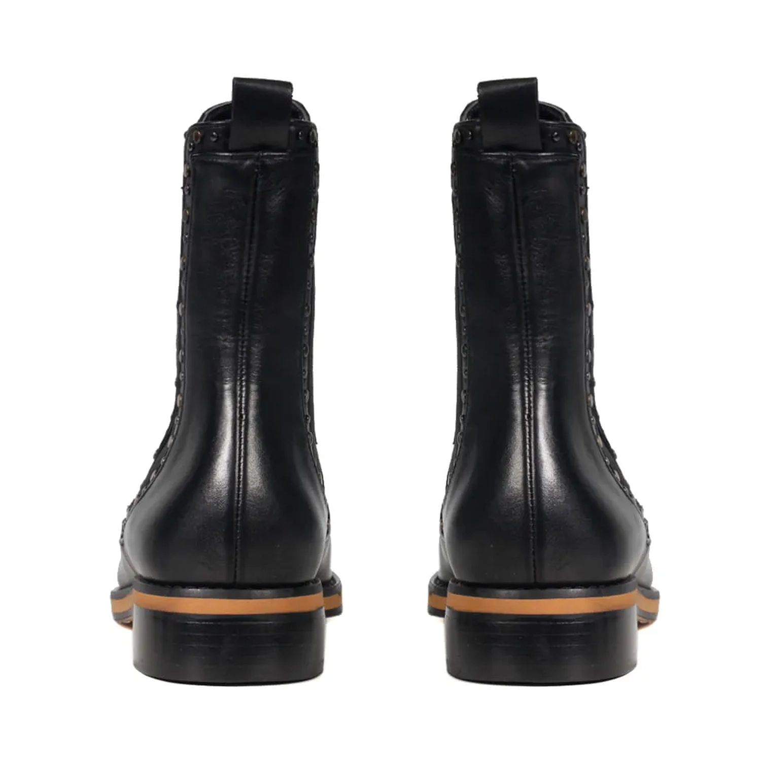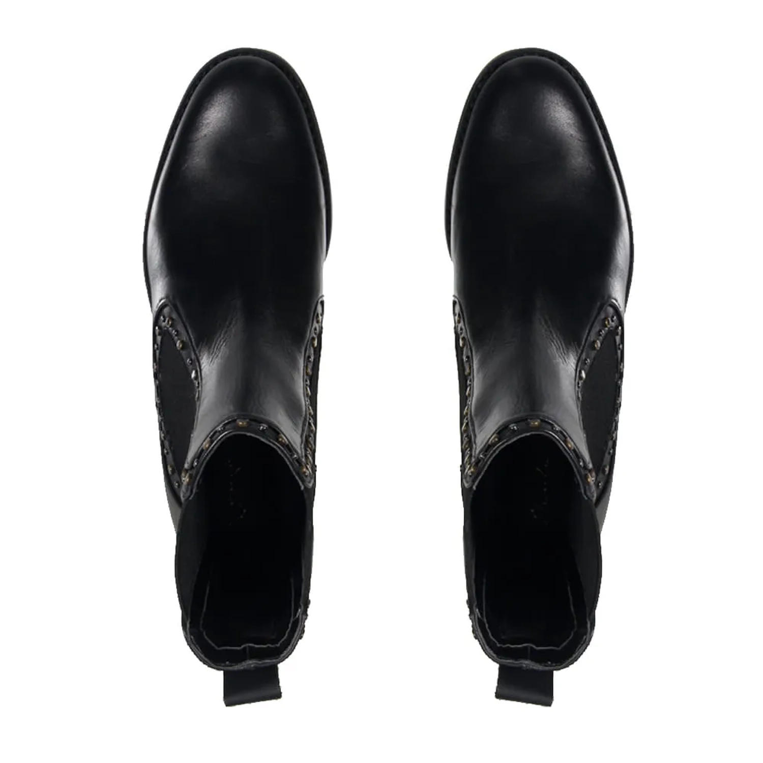 A Bota Talin é confeccionada em couro. De modelagem clássica, a peça possui como diferencial os rebites (intercalados em ouro envelhecido e metalizados) contornando o elástico e a superfície do cano da bota. Outro destaque do modelo é o solado bicolor, o arremate perfeito para bota.