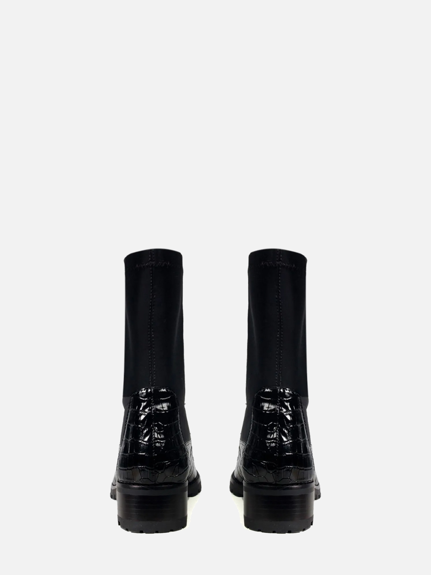 A Bota Veneza Croco é produzida com tecido com elasticidade, conhecido como neoprene. O modelo tem bico redondo alongado e sola tratorada emborrachada. Na base, uma faixa em verniz com estampa croco na mesma cor. O salto baixo é forrado em fachete de couro.