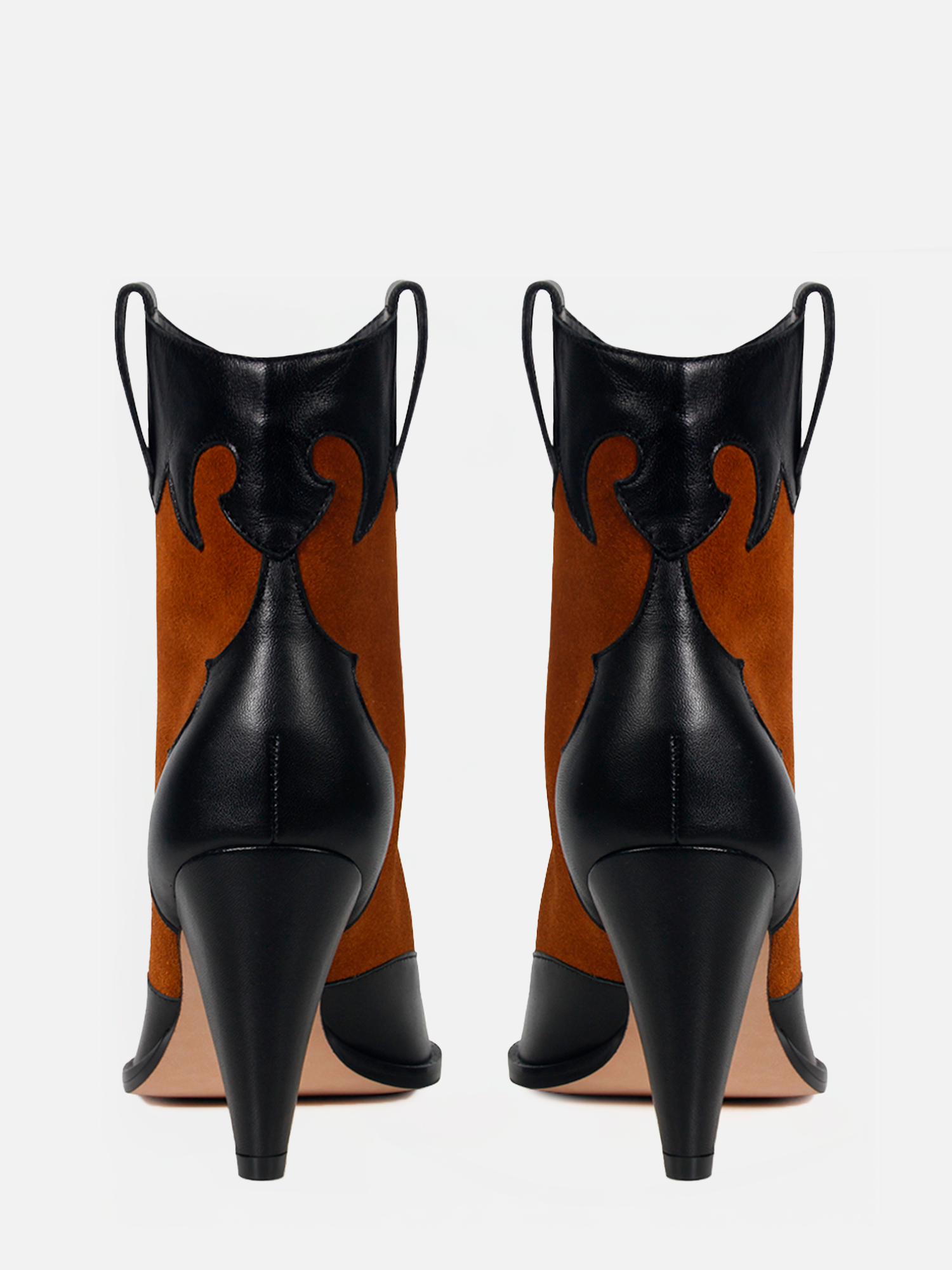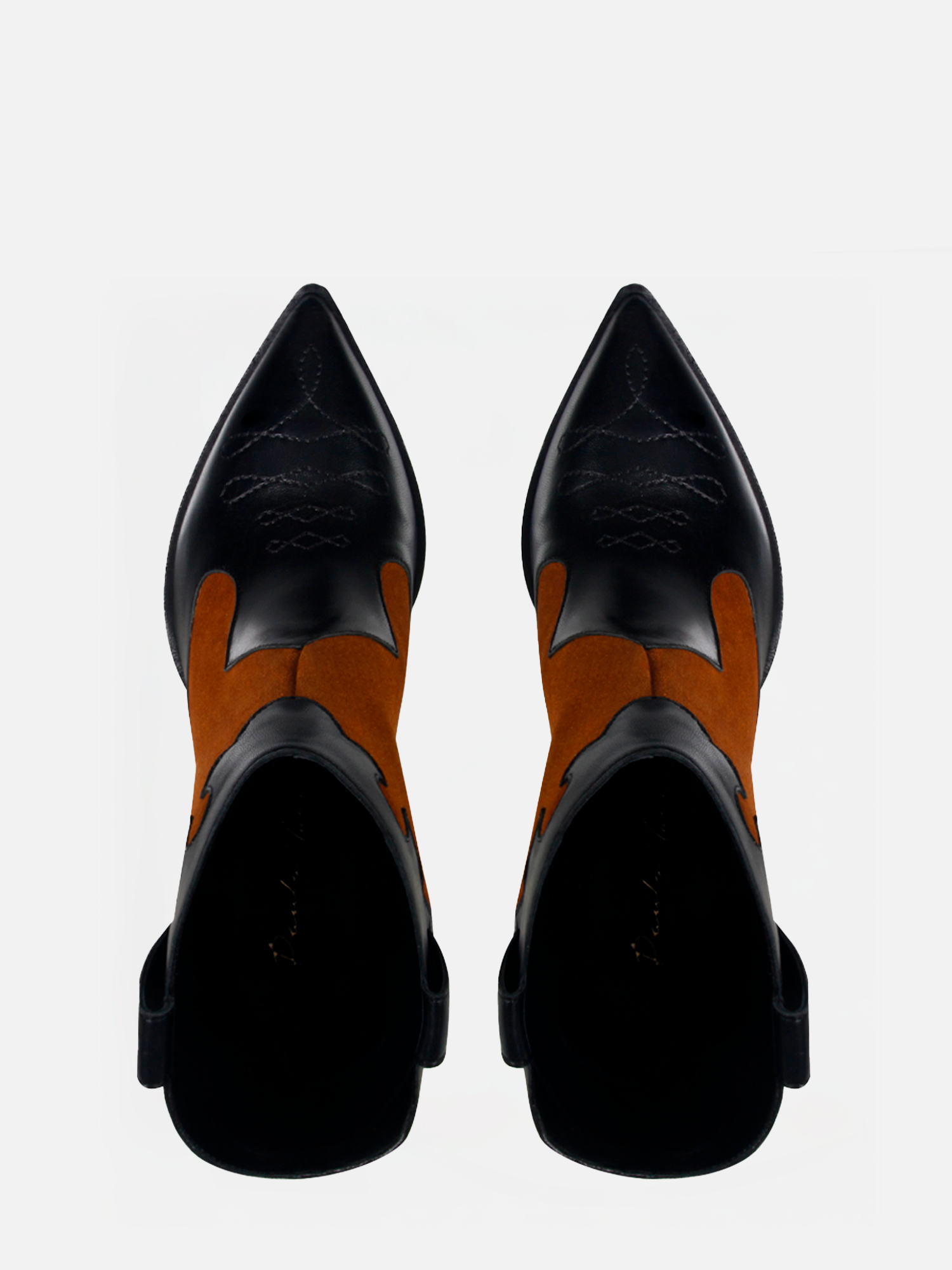 A Bota Zurique é confeccionada em couro. Modelagem em bico fino e salto cone, possui detalhes pespontados no cabedal, remetendo ao estilo Western. A combinação de texturas do couro liso e o desenho exclusivo Paula Torres em camurça na cor caramelo, confere uma estética única à peça, transmitindo o DNA handmade da marca.