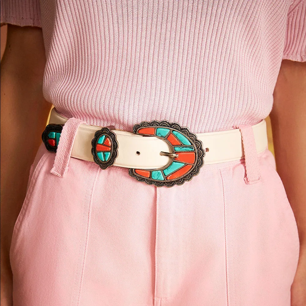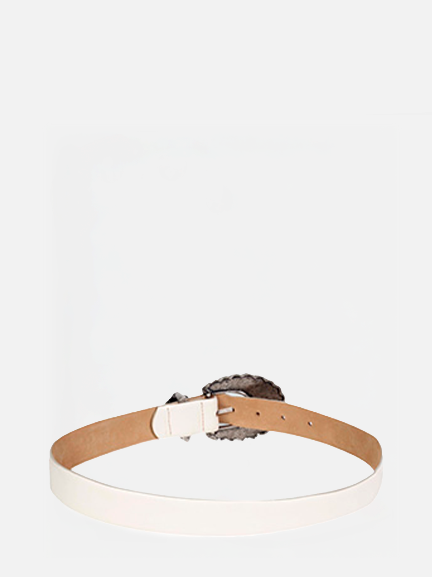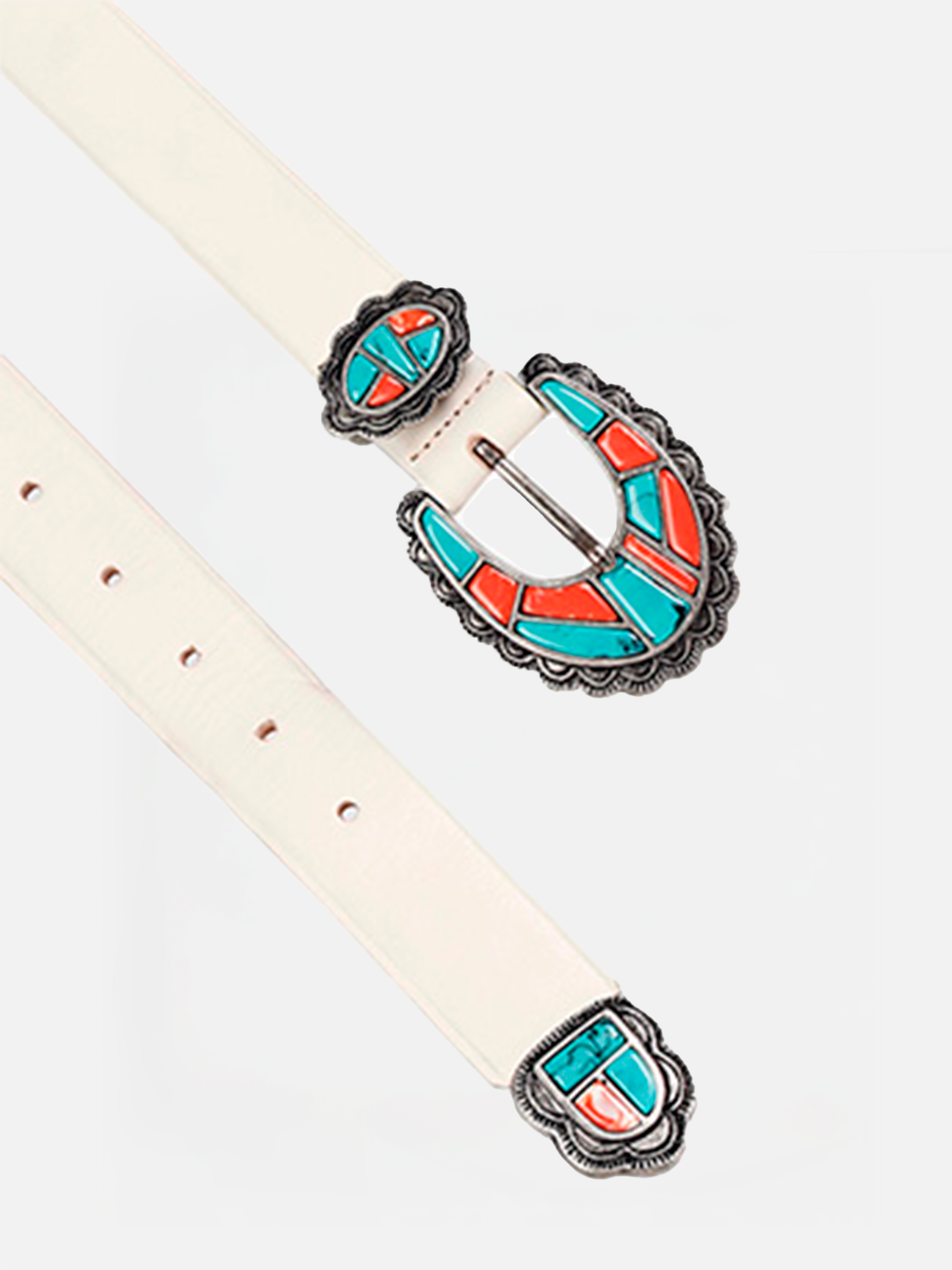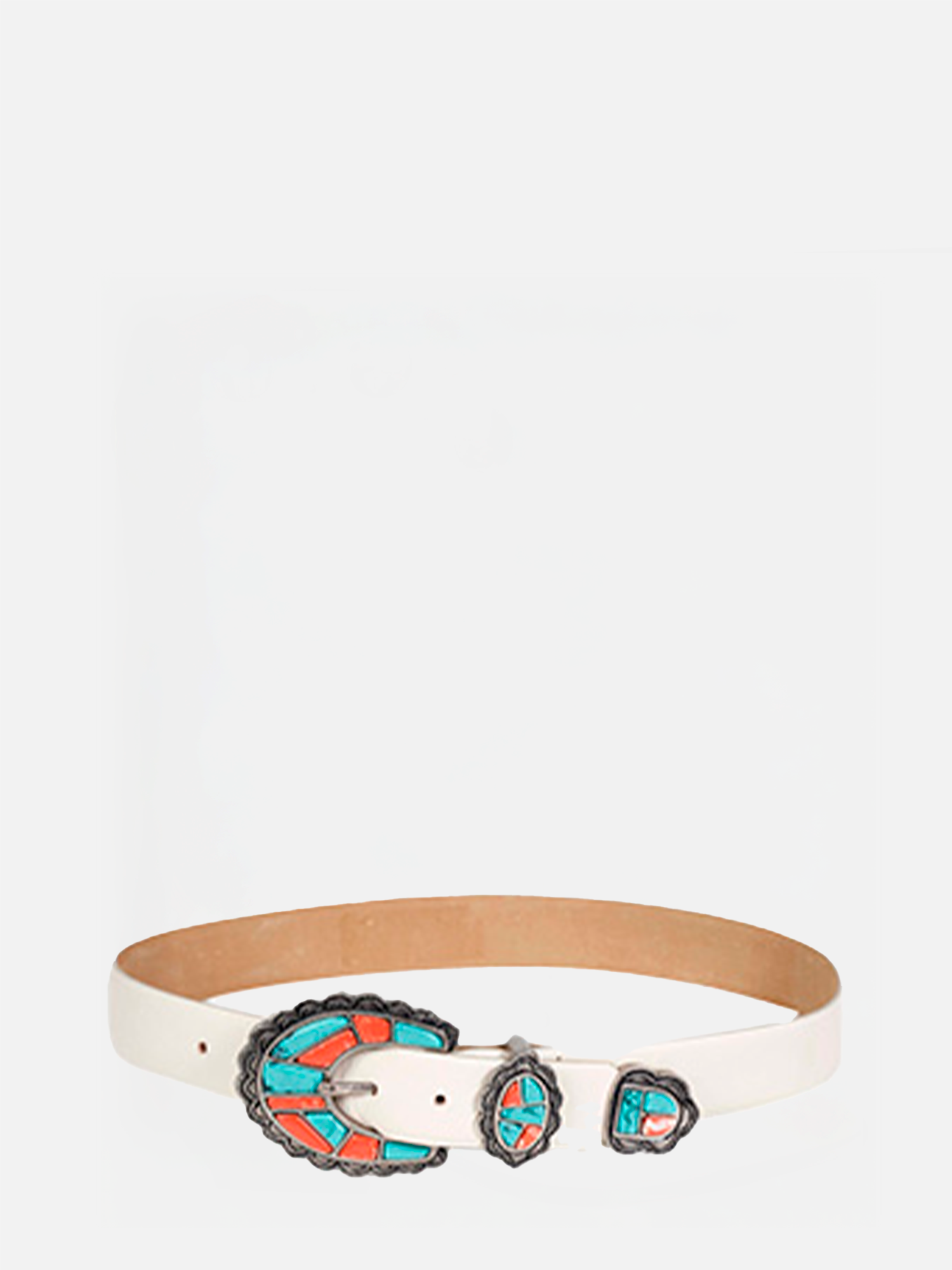 O Cinto Agatha é produzido em couro. A peça possui espessura média, fivela, passante e ponteira metálicas e fechamento ajustável em cinco níveis. O diferencial são as aplicações metálicas com as extremidades onduladas e o desenho com traços assimétricos, oferecendo charme à peça que traduz de maneira única o DNA handmade da marca.