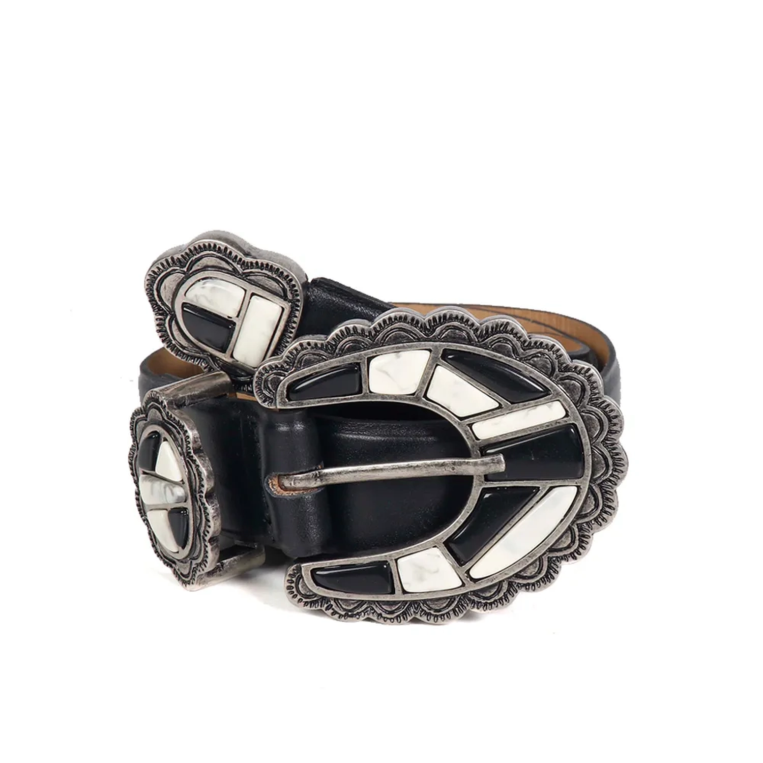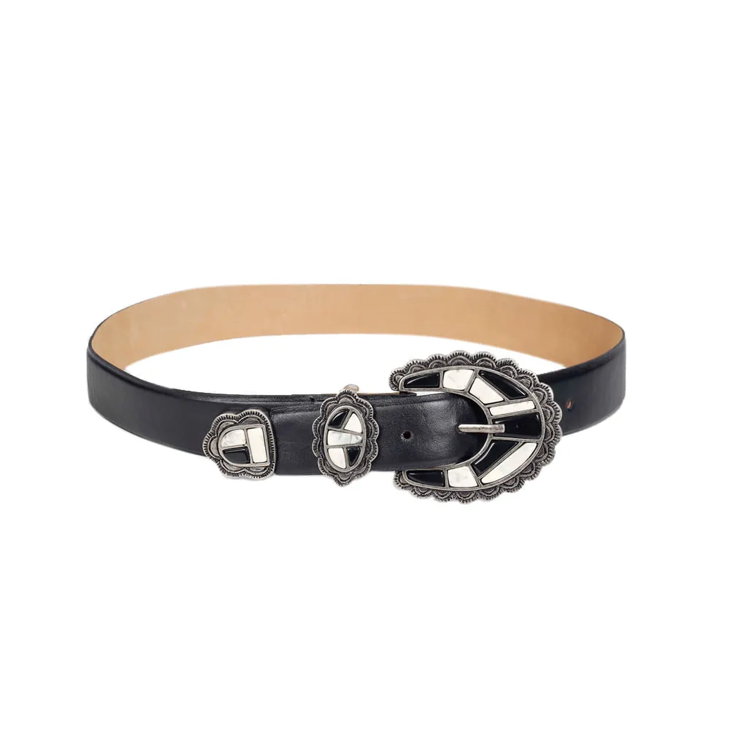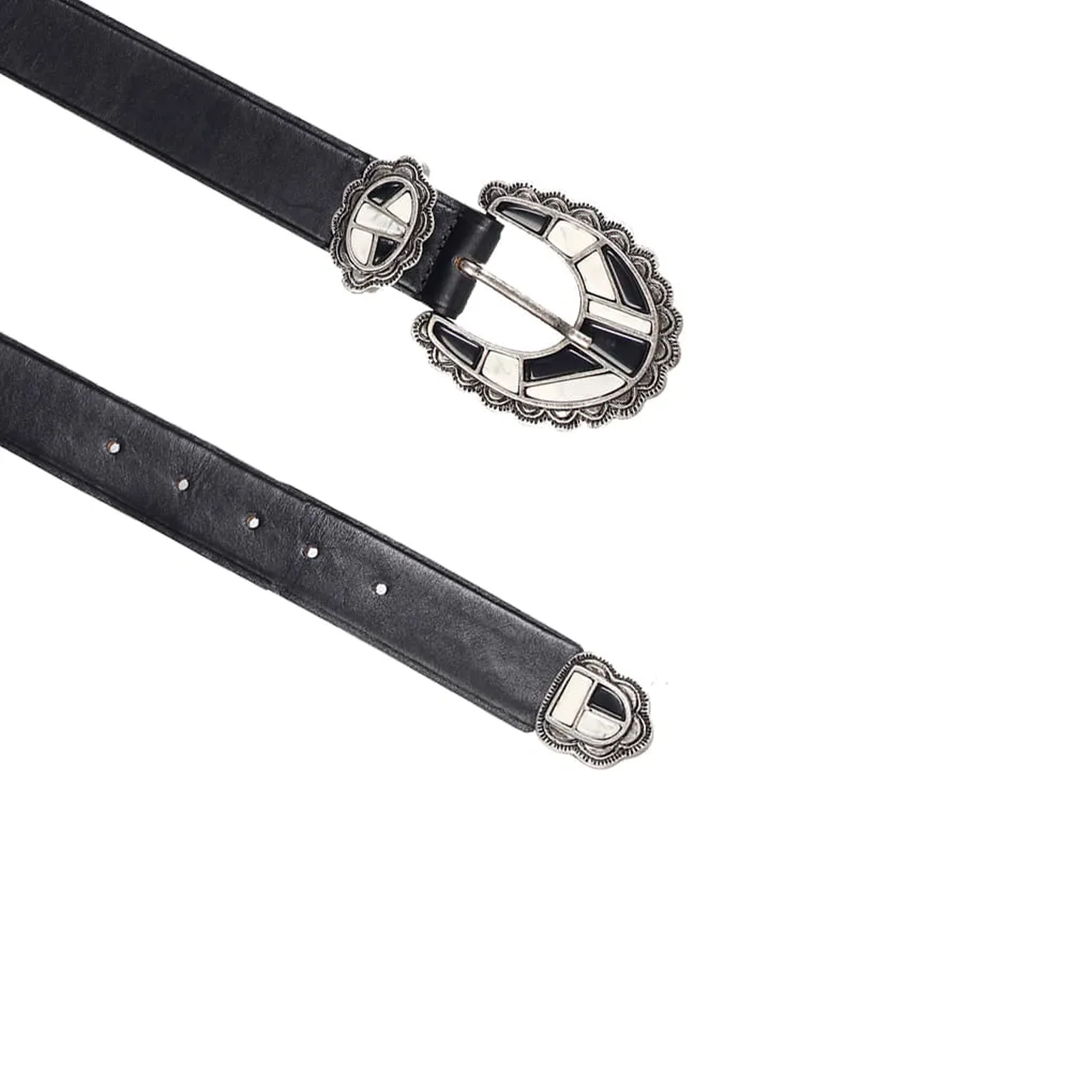 O Cinto Agatha é produzido em couro. A peça possui espessura média, fivela, passante e ponteira metálicas e fechamento ajustável em cinco níveis. O diferencial são as aplicações metálicas com as extremidades onduladas e o desenho com traços assimétricos, oferecendo charme à peça que traduz de maneira única o DNA handmade da marca.