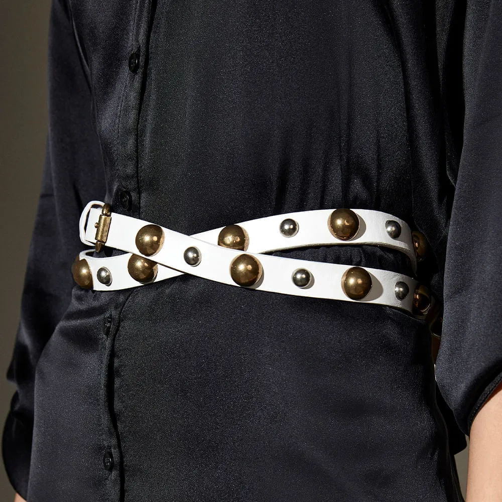 O Cinto Boston é um acessório moderno e sofisticado. Confeccionado em napa de alta qualidade, o cinto apresenta um cabedal adornado com metais esféricos que alternam de tamanho e cor, criando um efeito visual único e impactante. Os metais esféricos são detalhes que conferem personalidade e estilo ao cinto, transformando-o em um acessório marcante e versátil.