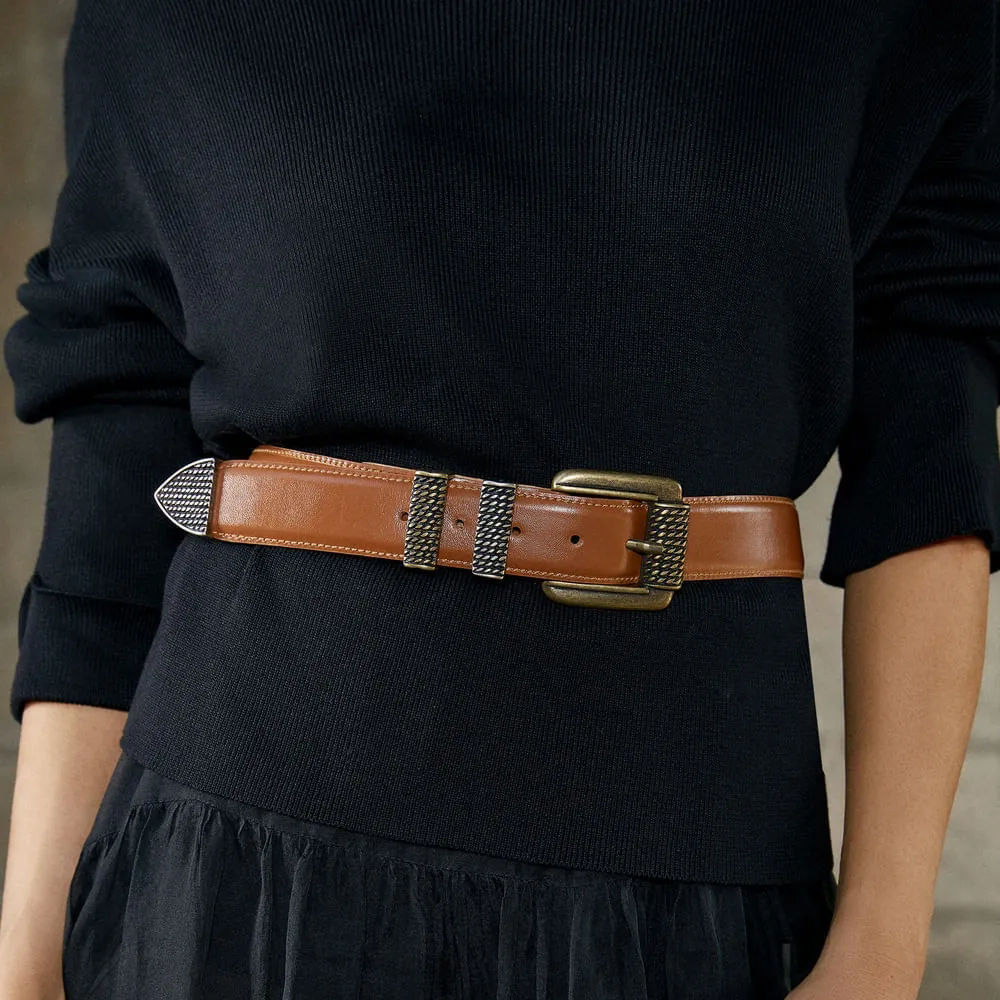 O Cinto Cleo é um acessório estiloso. Confeccionado em couro napa, ele oferece durabilidade, ideal para o uso diário. O destaque deste modelo fica por conta da referência no estilo western com suas ferragens, que confere um toque de personalidade e exclusividade ao acessório. Além disso, o Cinto conta com ponteira e passantes frontal em metal trabalhado, que adicionam um toque de sofisticação e requinte ao acessório.