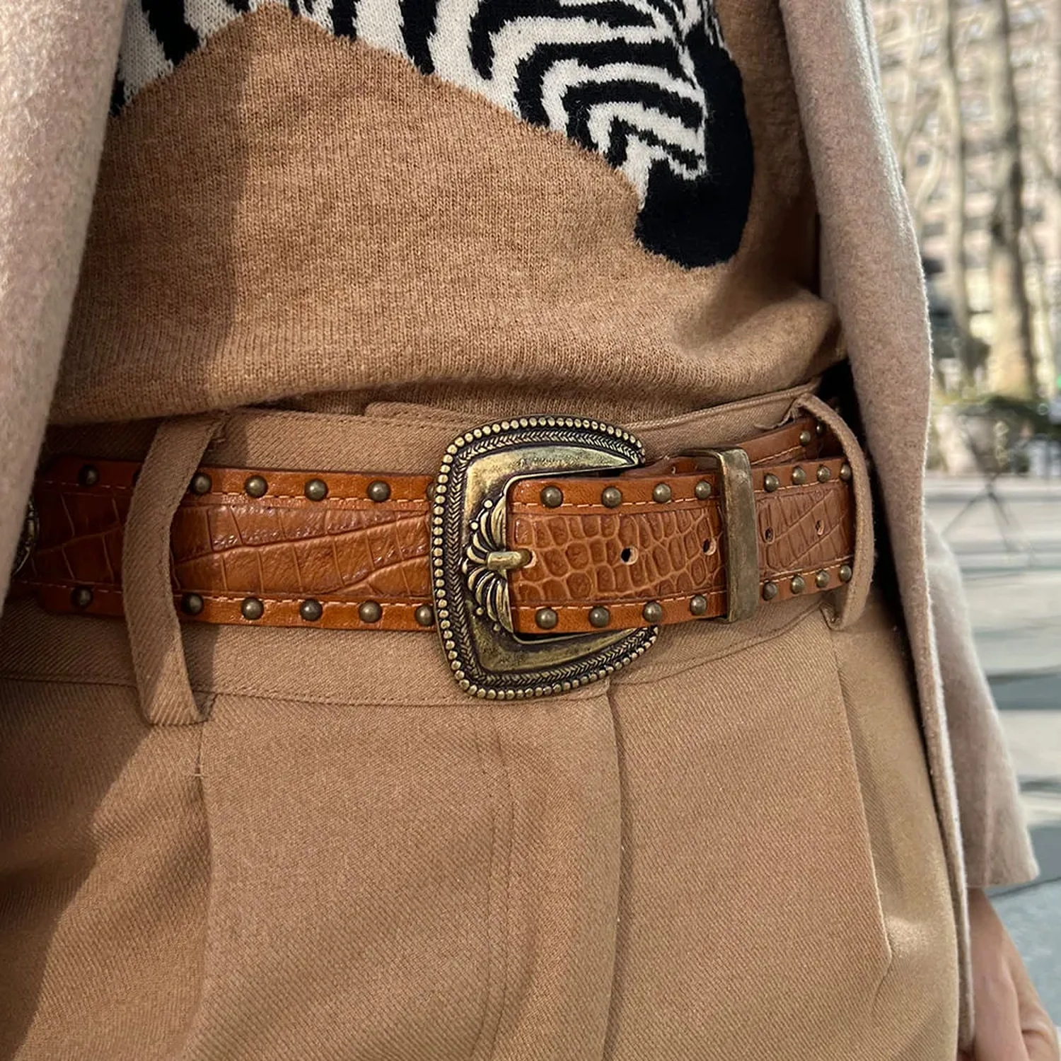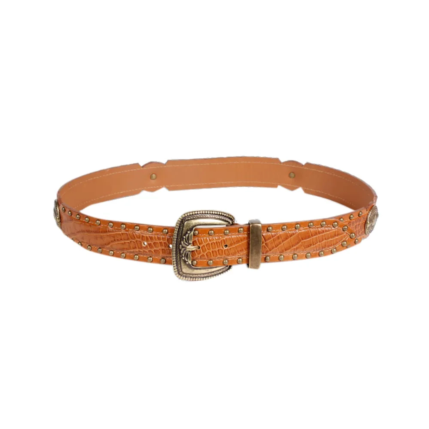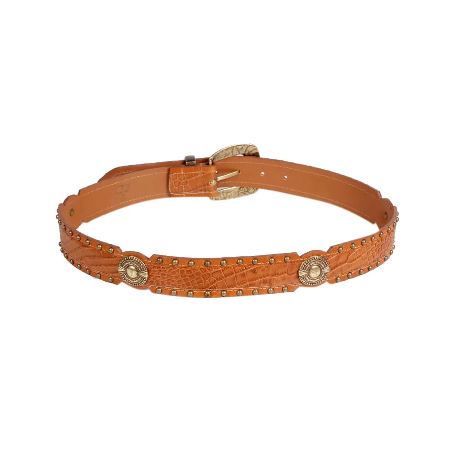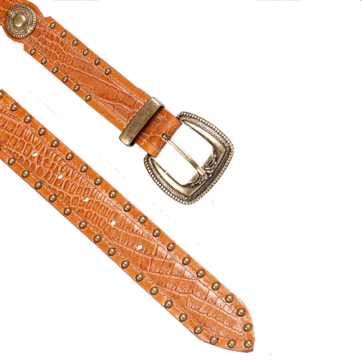 O Cinto Dublin é produzido em couro. A peça possui espessura média, fivela metálica estilizada que remete ao estilo Western, passante metalizado fixo, acabamento pespontado e fechamento ajustável em cinco níveis. O diferencial são as quatro aplicações circulares laterais, o interior estampado e os hotfix em ouro velho, oferecendo charme à peça que traduz de maneira estilosa o DNA handmade da marca. Largura do cinto: 3.60 CM MEDIDAS/TAMANHO - P: 80CM - M: 85CM - G: 90CM