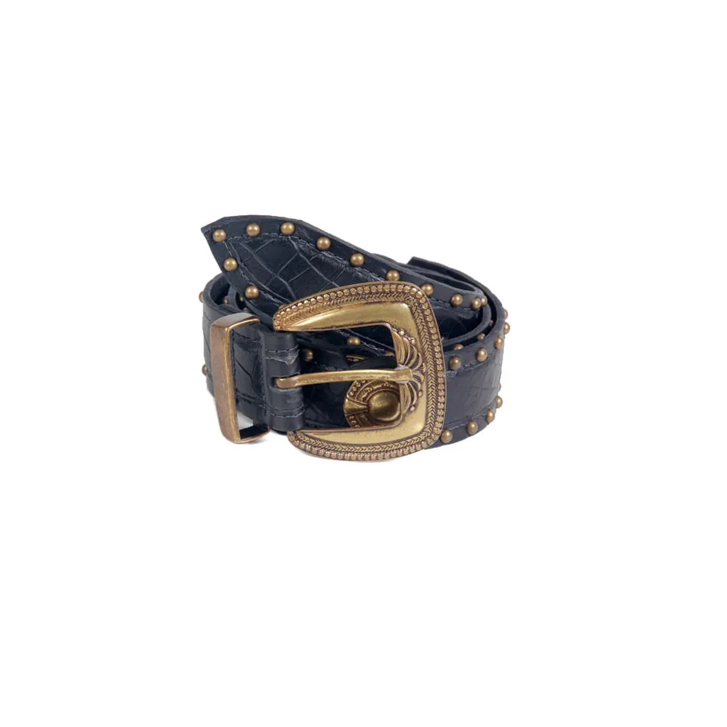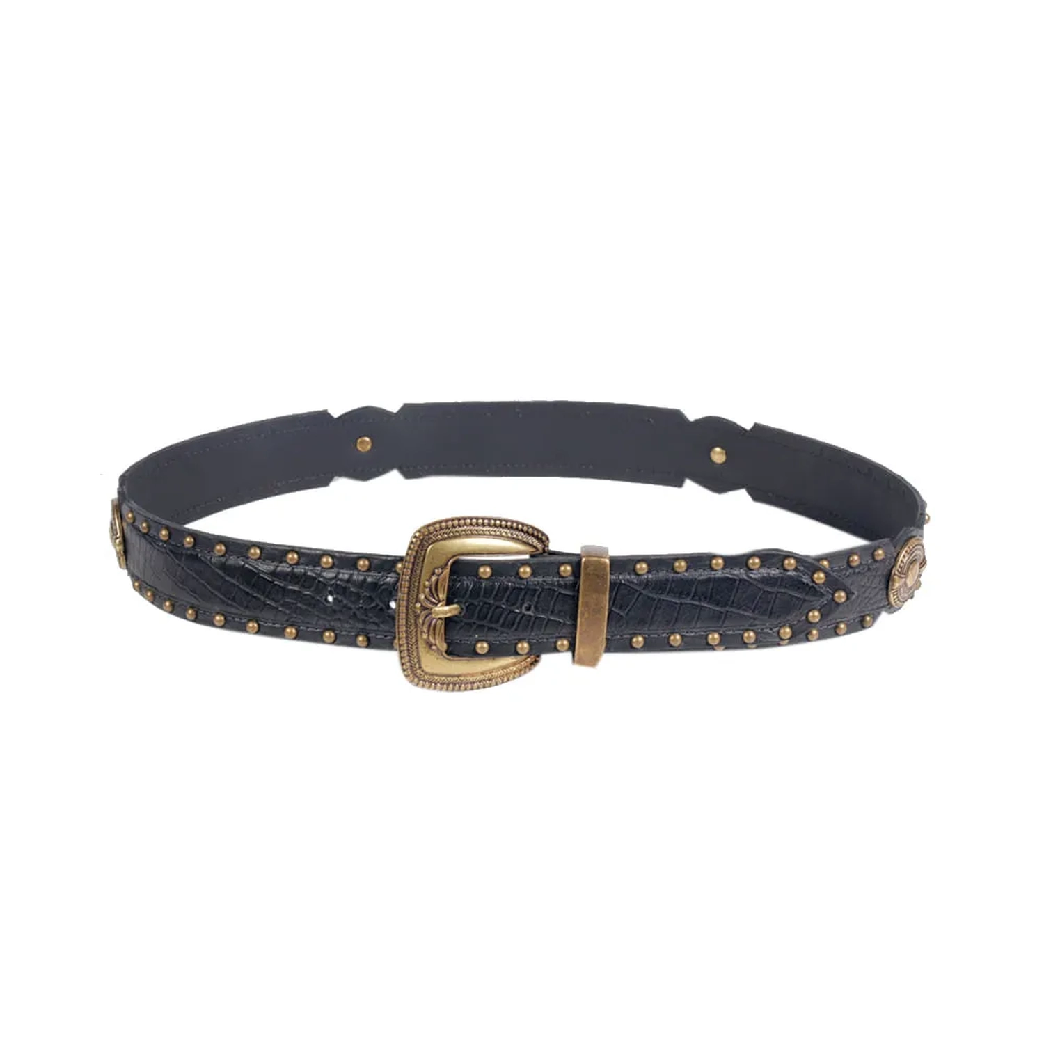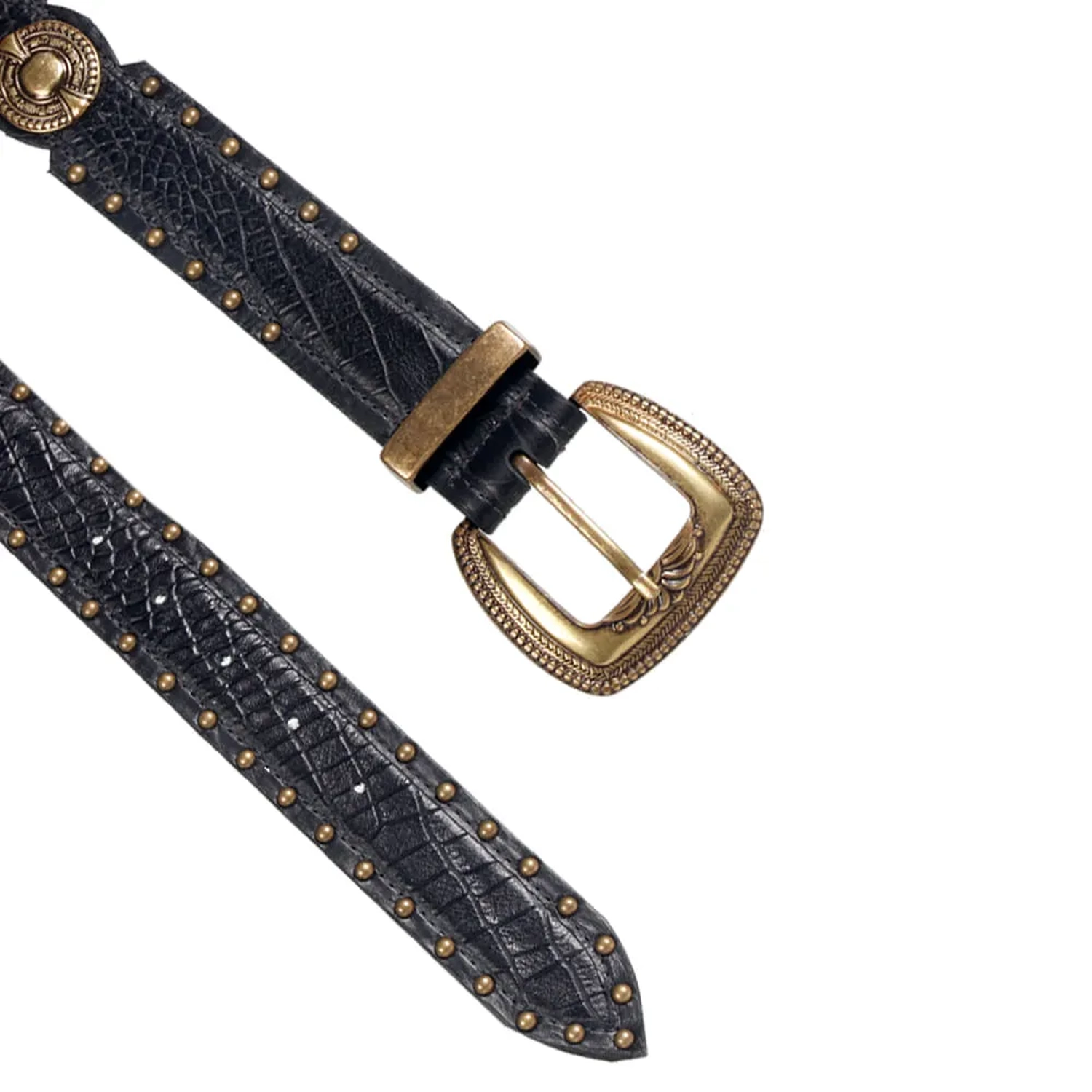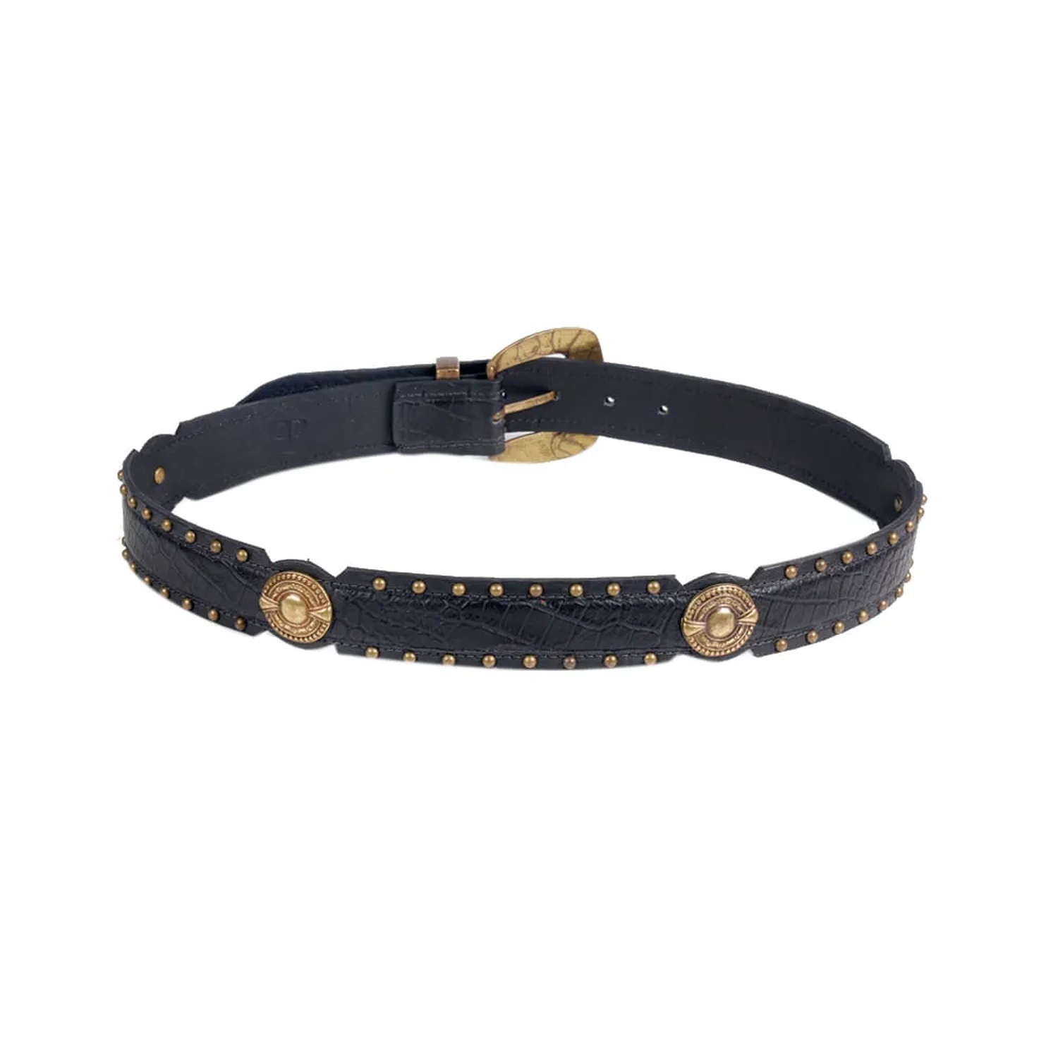 O Cinto Dublin é produzido em couro. A peça possui espessura média, fivela metálica estilizada que remete ao estilo Western, passante metalizado fixo, acabamento pespontado e fechamento ajustável em cinco níveis. O diferencial são as quatro aplicações circulares laterais, o interior estampado e os hotfix em ouro velho, oferecendo charme à peça que traduz de maneira estilosa o DNA handmade da marca.