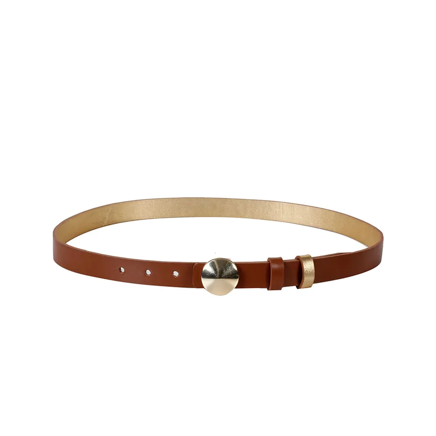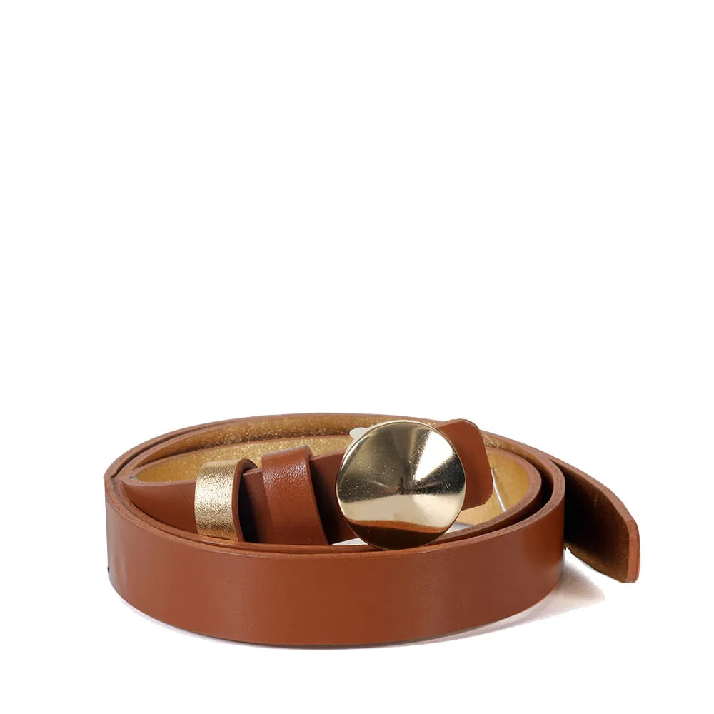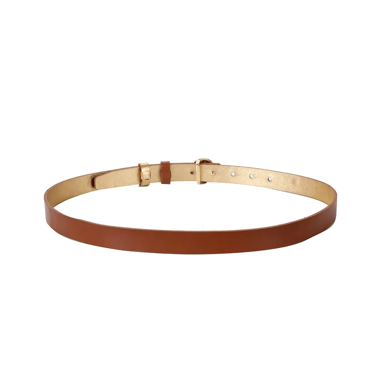 O Cinto Fran é produzido em couro. A peça de modelo dupla face, nas cores caramelo e dourado, possui uma fivela aplicada, onde girando-a, você tem a face de outra cor e consegue realizar o fechamento com o botão que estampa o DNA Paula Torres. Ele também possui espessura média e passantes. O diferencial são a proposta de design contemporâneo dos detalhes metálicos, oferecendo estilo à peça que traduz de maneira sofisticada o que é a marca.
