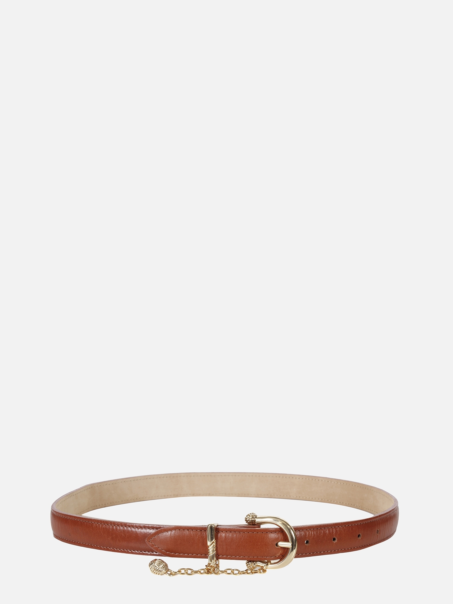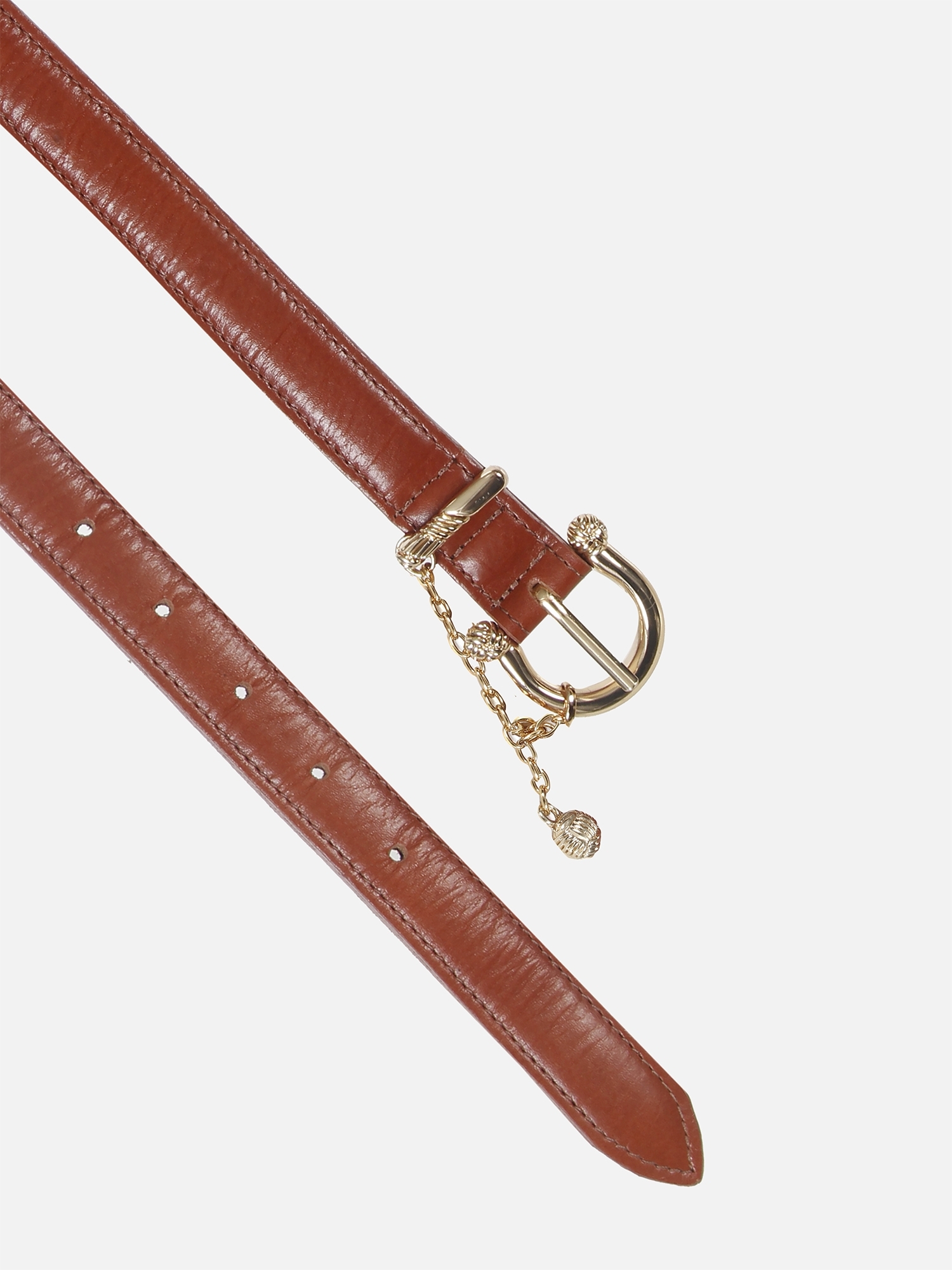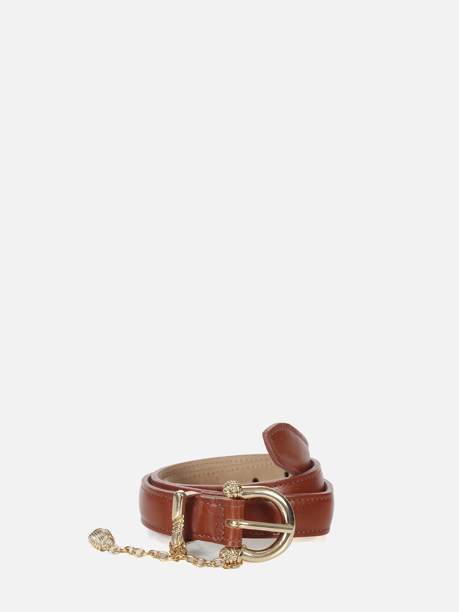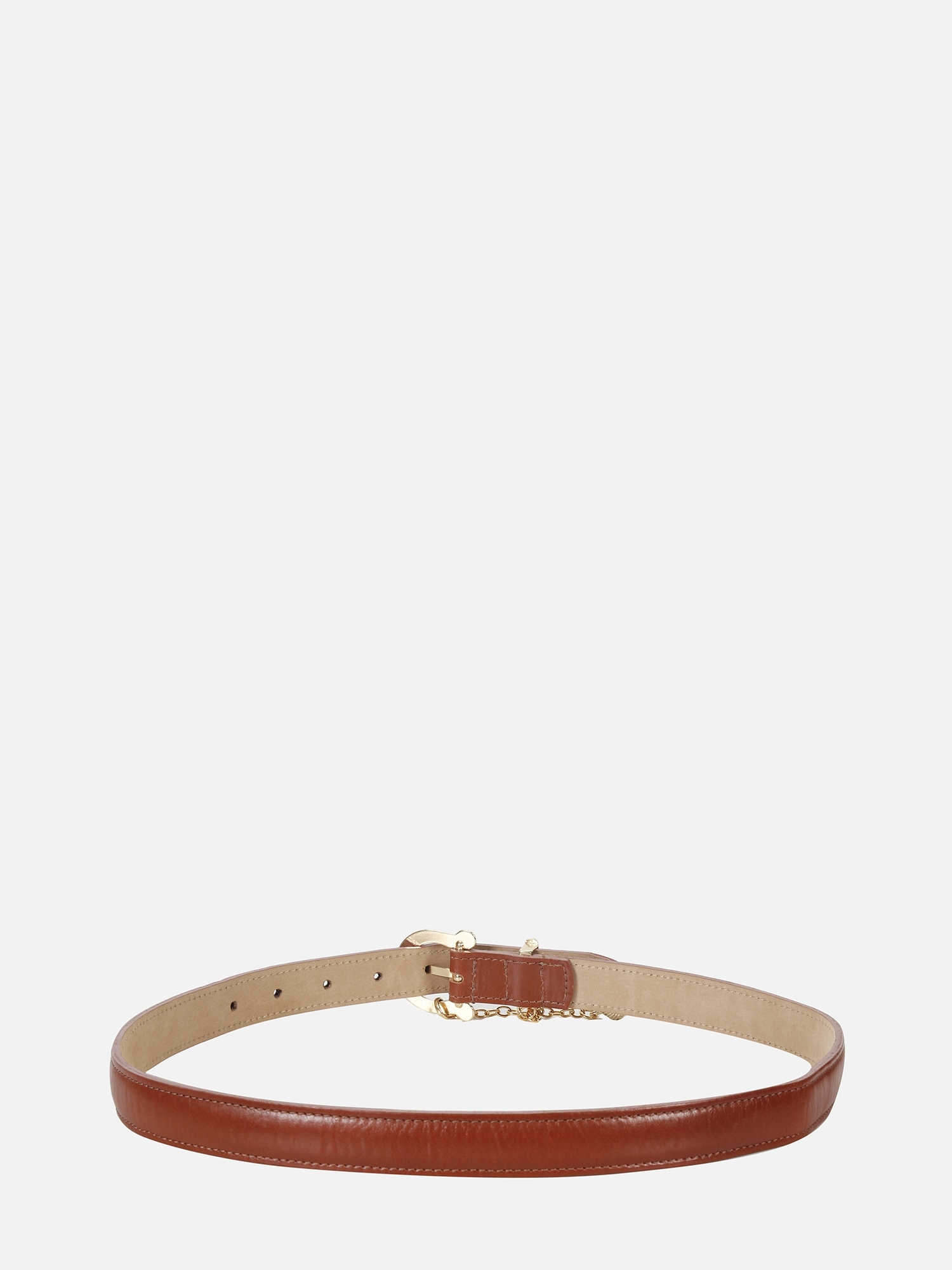 Cinto de couro na cor savana com fivela dourada e corrente decorativa. O acessório combina elegância e modernidade, sendo ideal para valorizar produções casuais ou sofisticadas com um toque de estilo refinado.