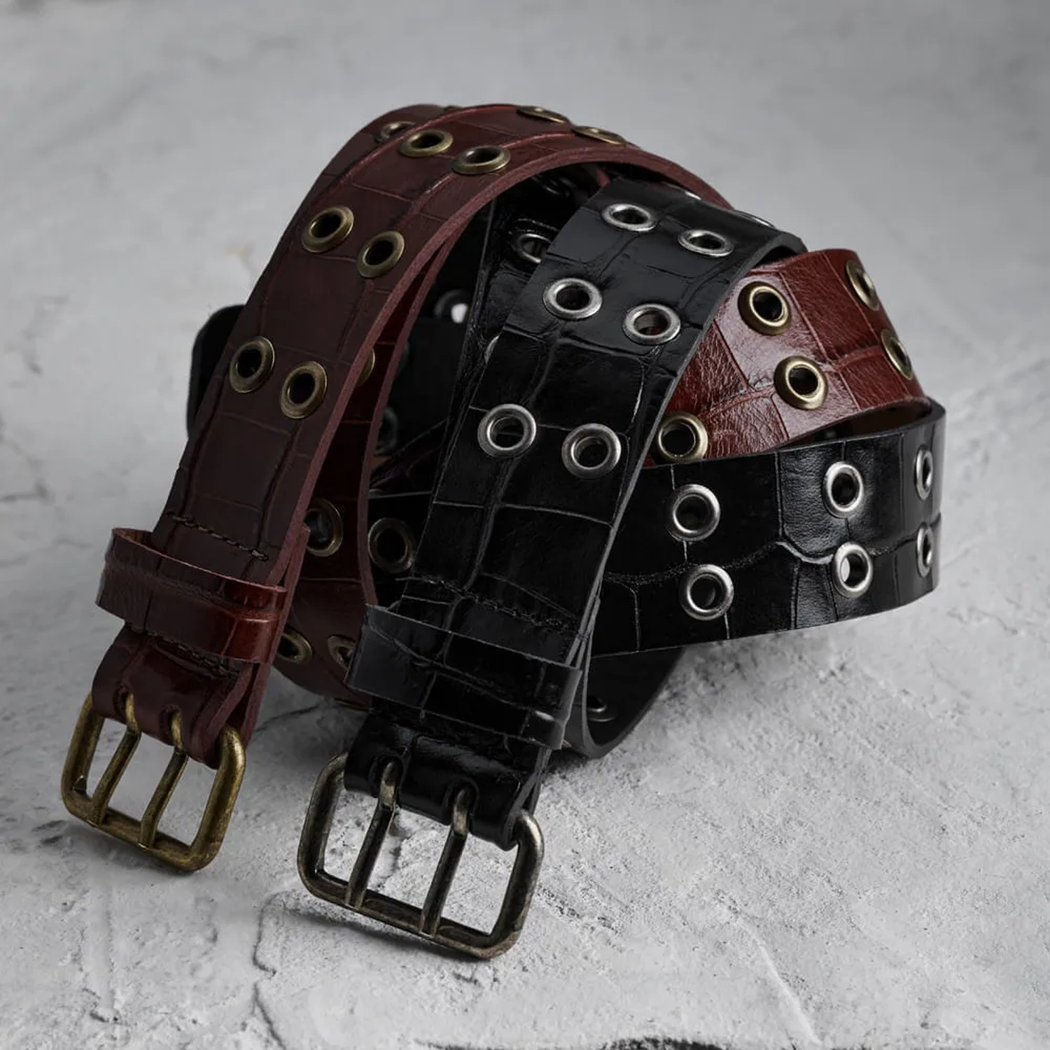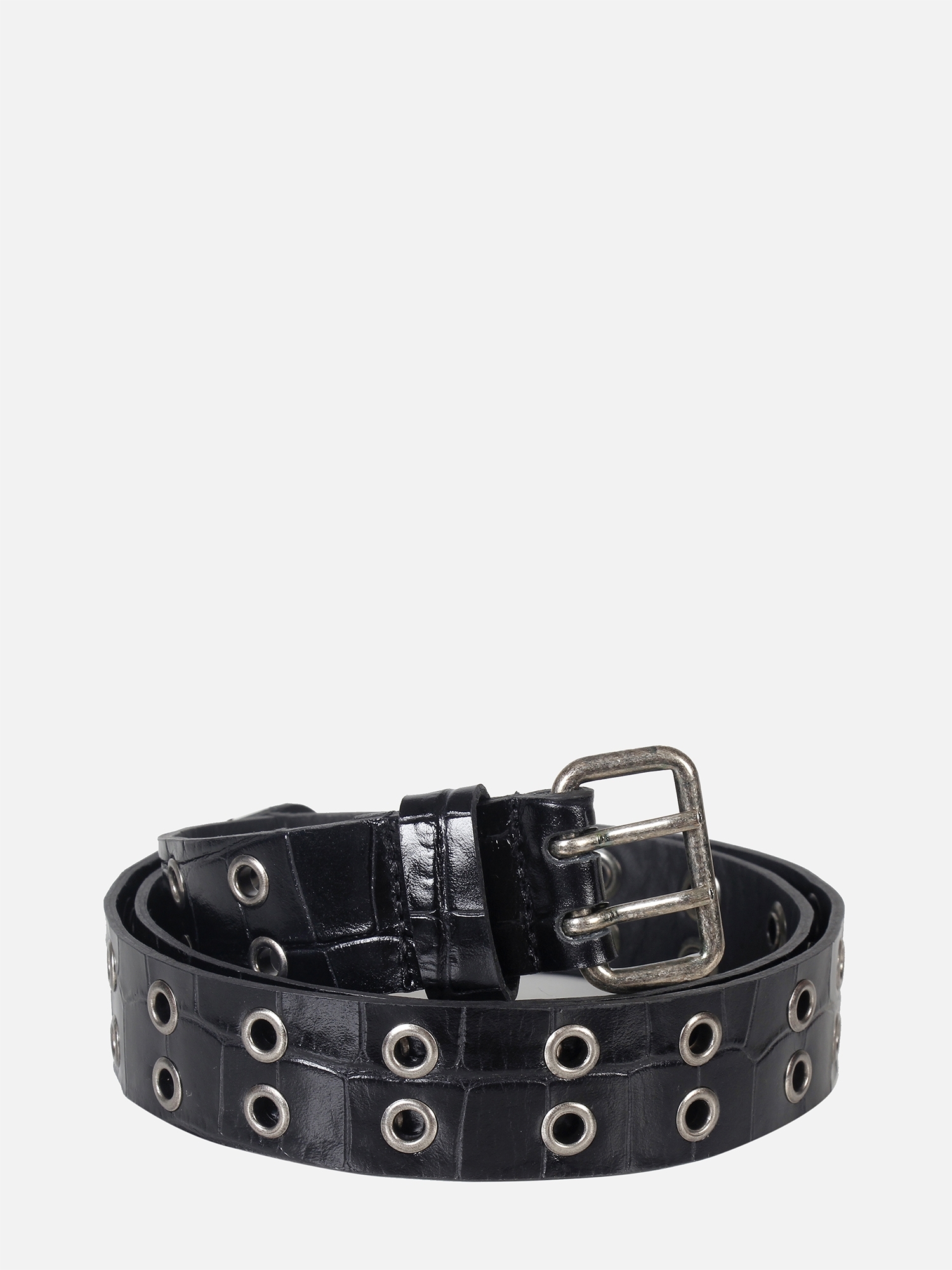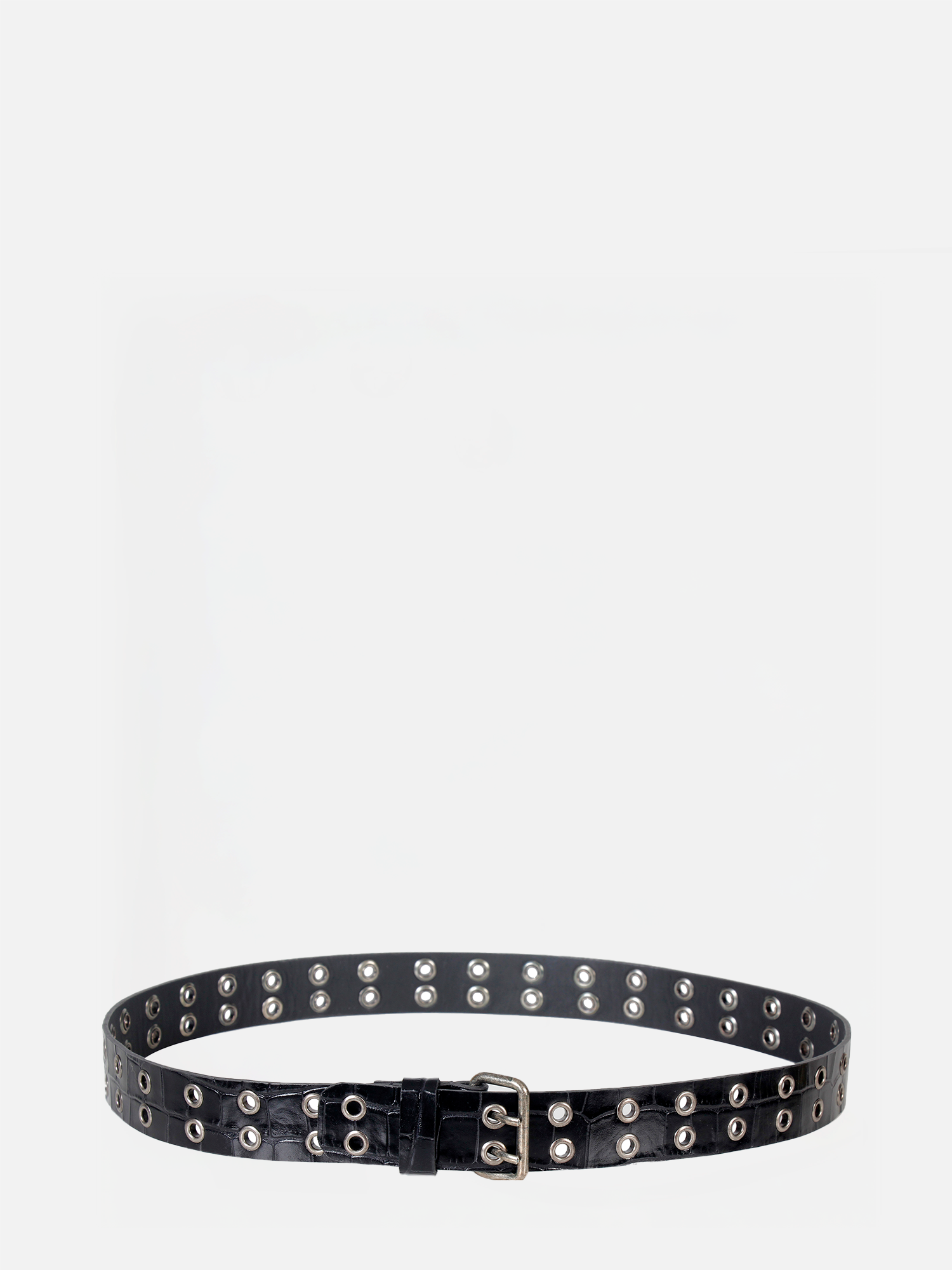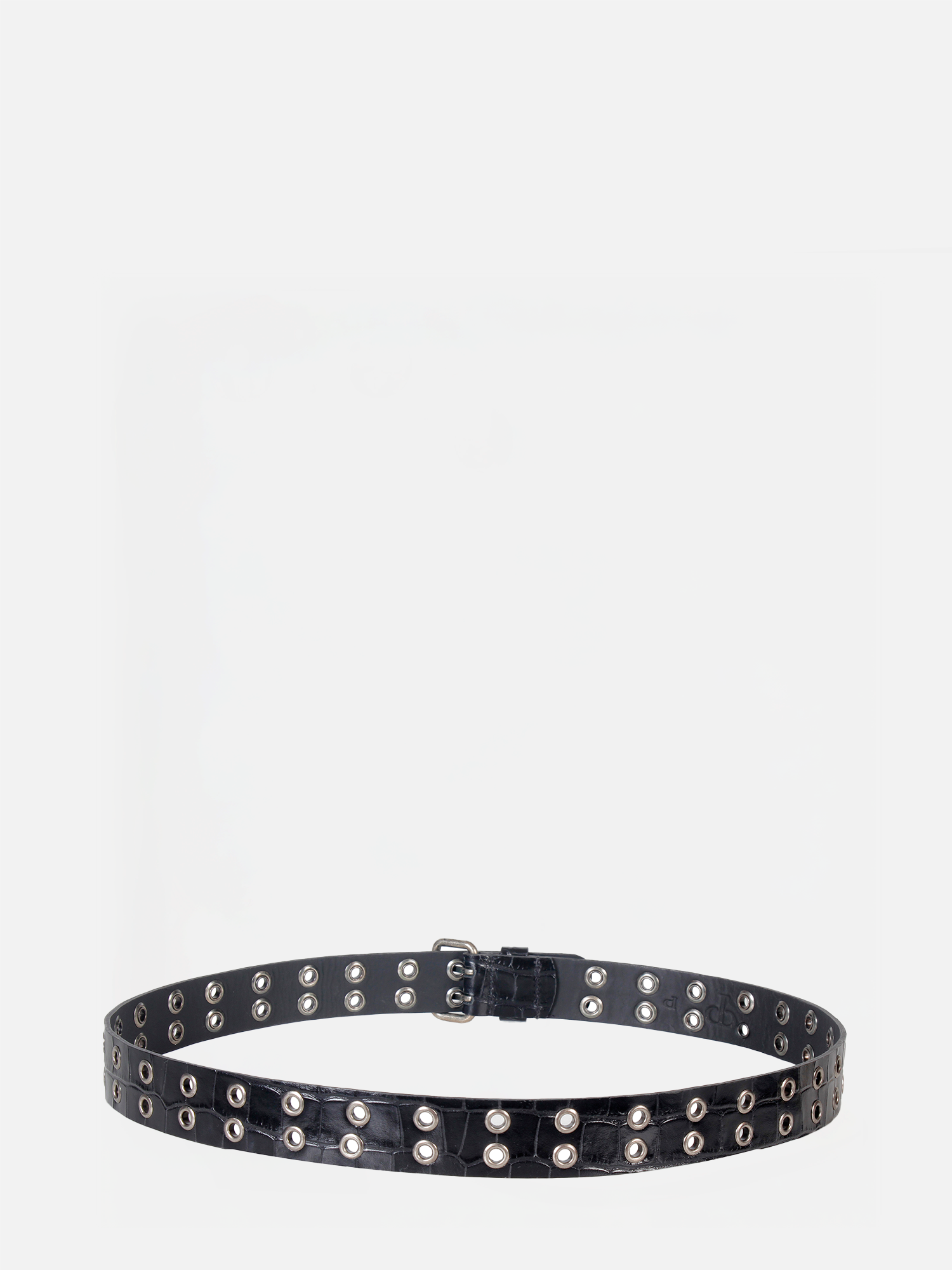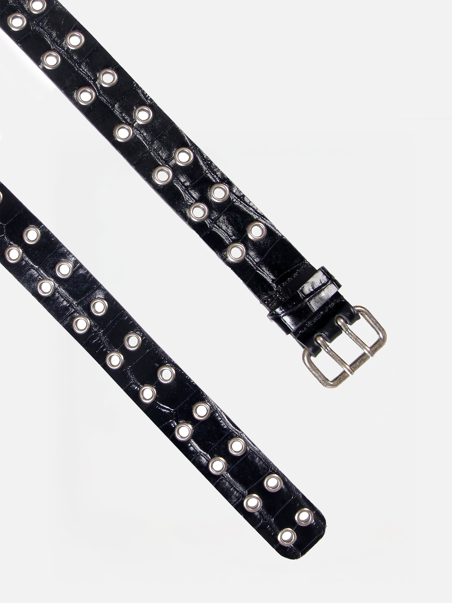 O Cinto Suri é produzido em couro com estampa croco. O destaque fica por conta da aplicação simétrica de ilhoses metálicos ao longo de toda a extensão da peça, criando um visual gráfico e moderno. A dupla em metal prateado reforça o estilo rocker-chic, enquanto os acabamentos de alta qualidade garantem durabilidade e sofisticação.