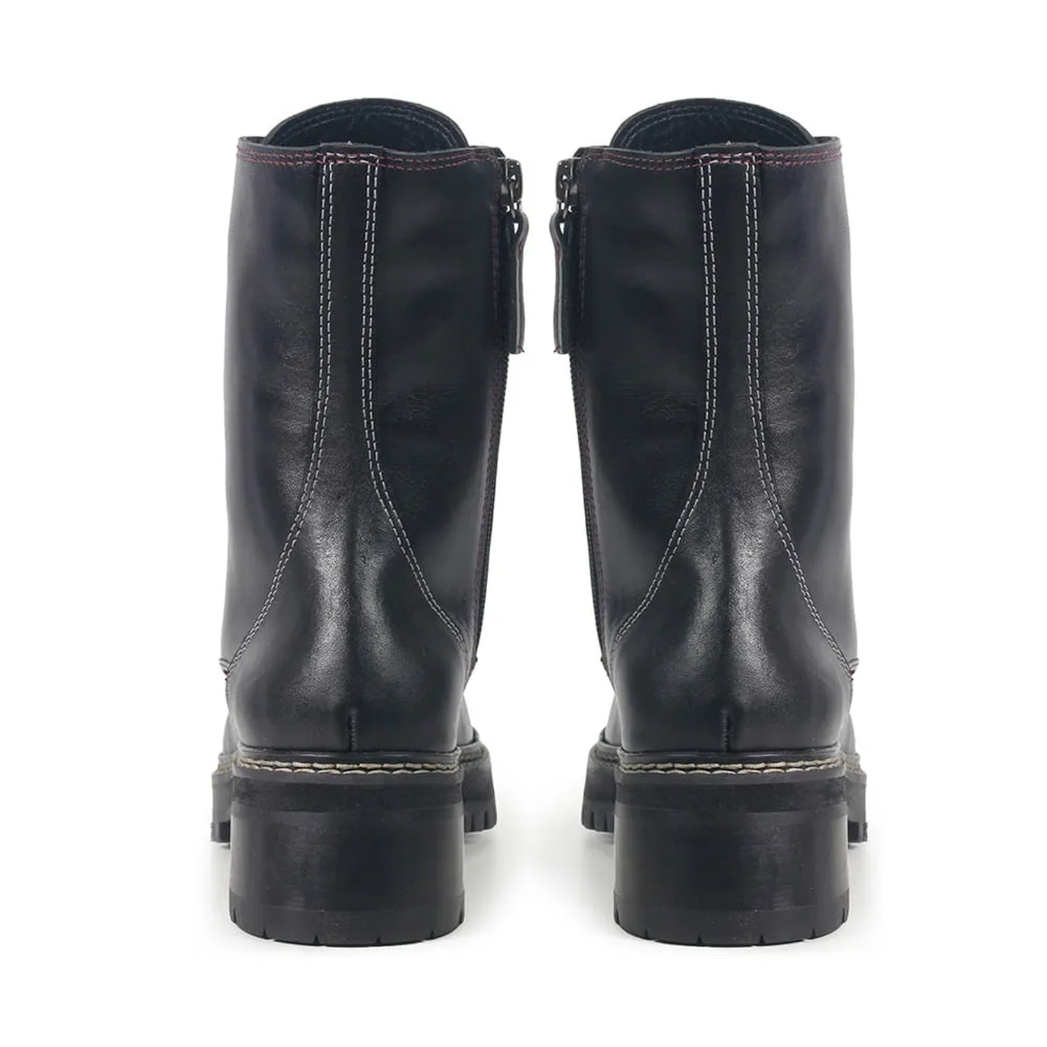 O Coturno Atlanta é confeccionado em couro napa. O modelo conta com salto baixo bloco tratorado e bico amendoado. Possui a vira em couro com pespondo duplo contrastante. Seu cabedal possui pespontos coloridos, azul na parte do bico, vermelho nas laterias e branco no calcanhar e na lingueta. Fechamento feito por zíper lateral.