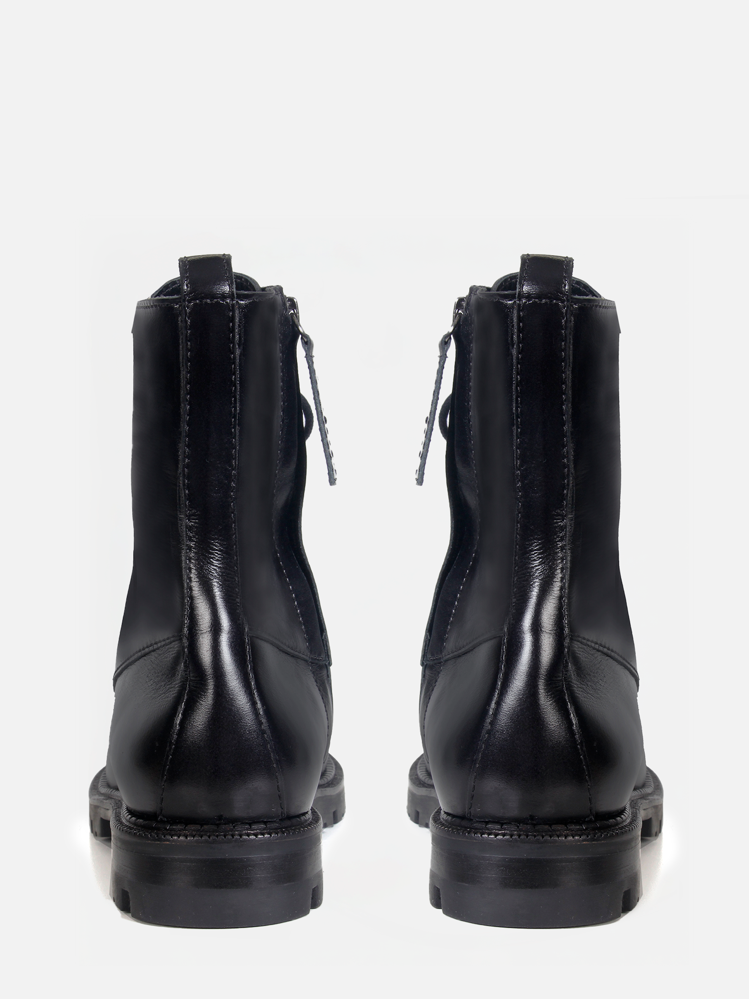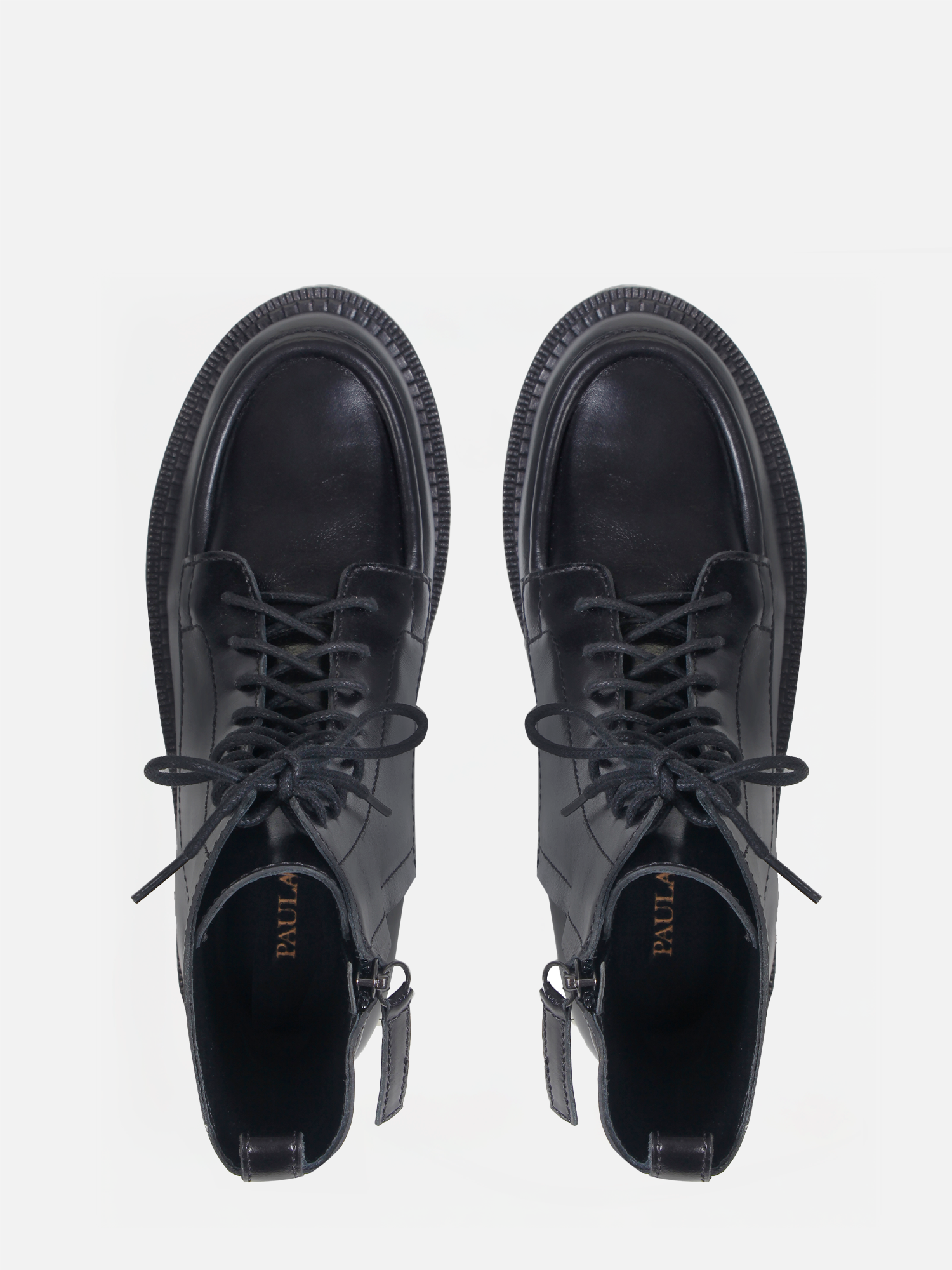 O Coturno Lana é confeccionado em couro, combinando estilo e robustez. O modelo possui cano médio e bico redondo, destacado por uma nervura em couro que segue o contorno frontal, agregando um toque de personalidade. O fechamento é feito por amarração frontal, enquanto o solado tratorado em borracha garante aderência e durabilidade, ideal para um visual moderno e funcional.