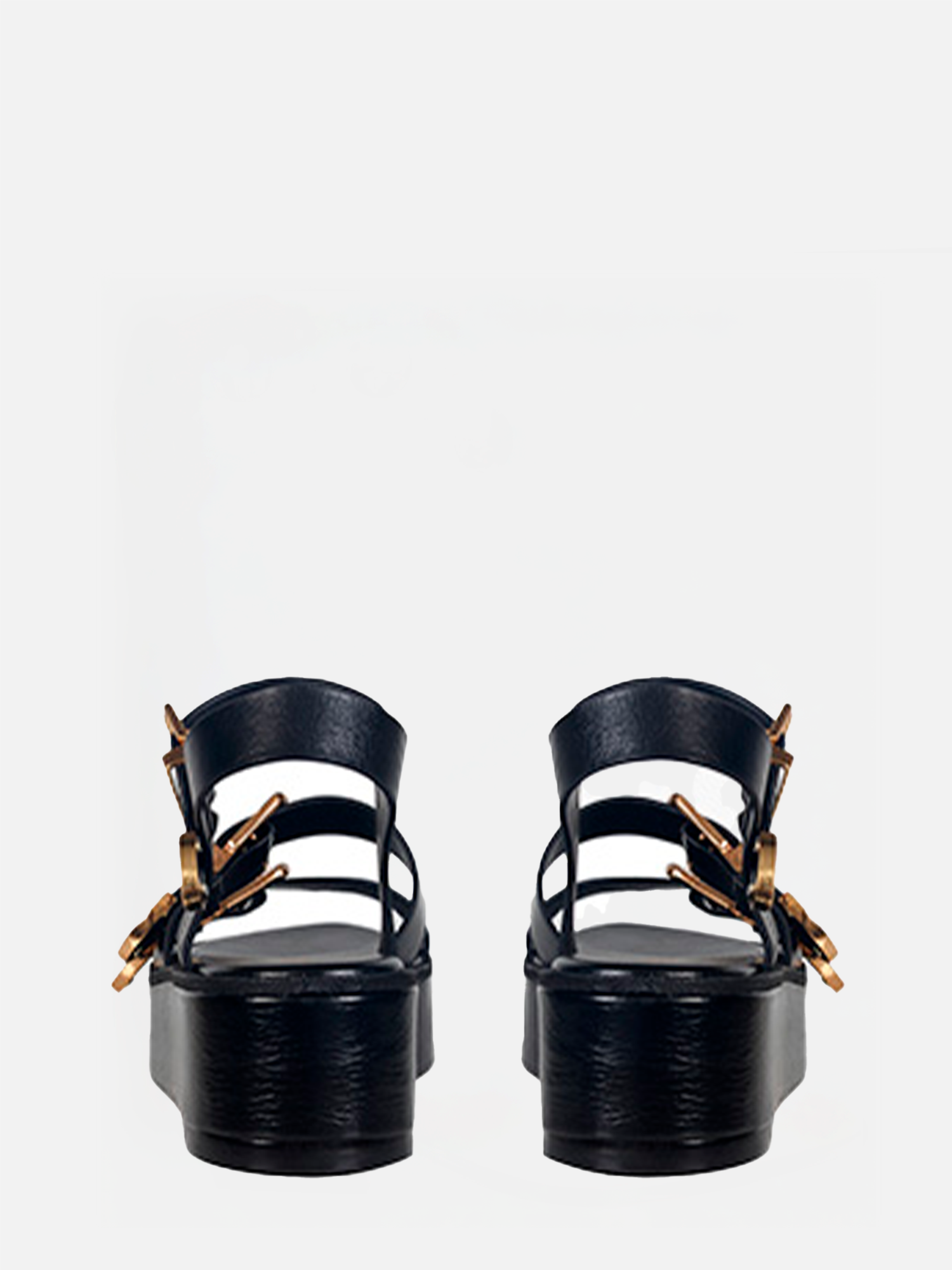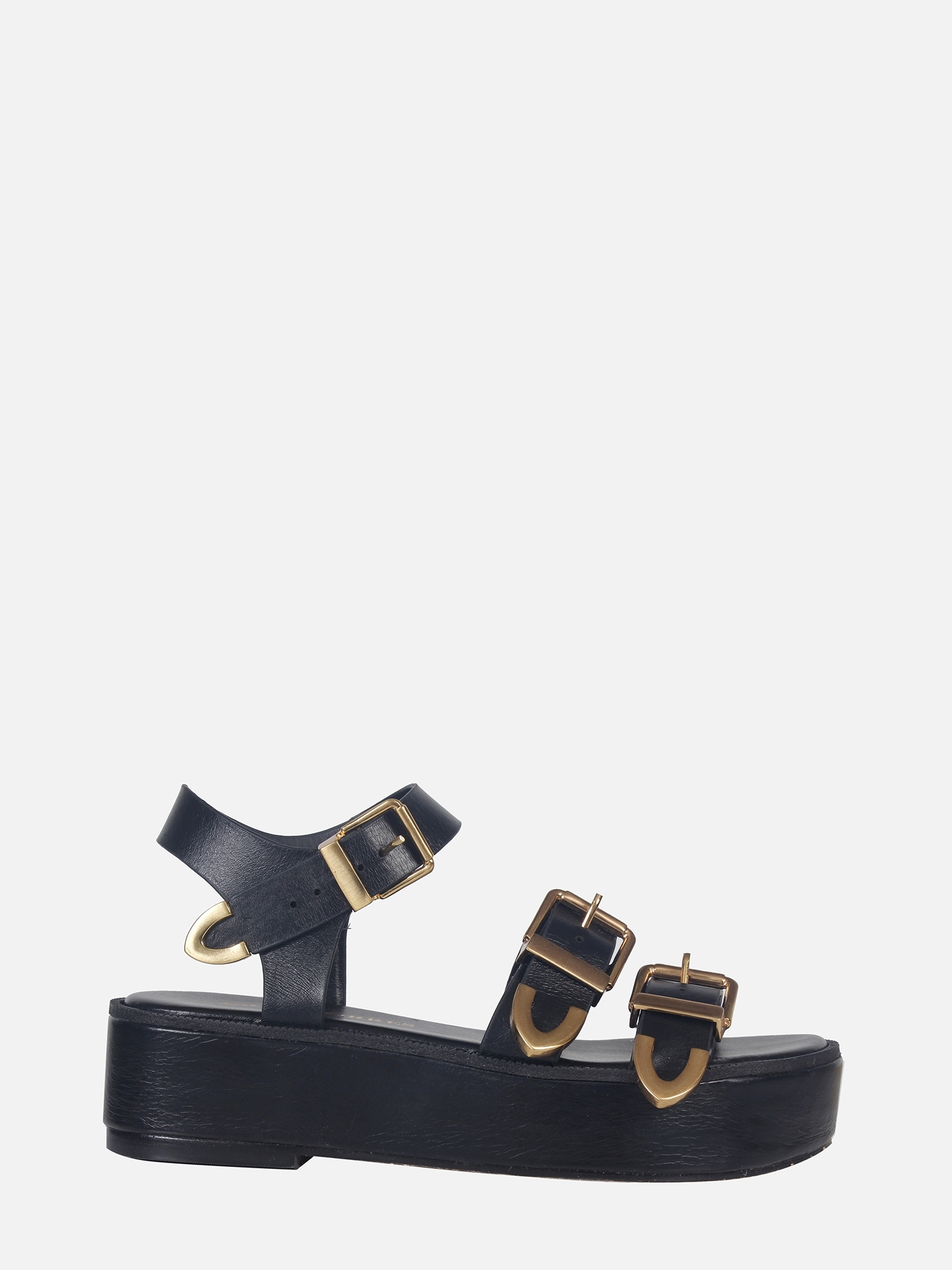 A Flatform Betina é produzida em couro. Tiras largas com fivelas laterais personalizadas que são responsáveis pelo ajuste e fechamento. Bico arredondado e salto plataforma revestido de couro.