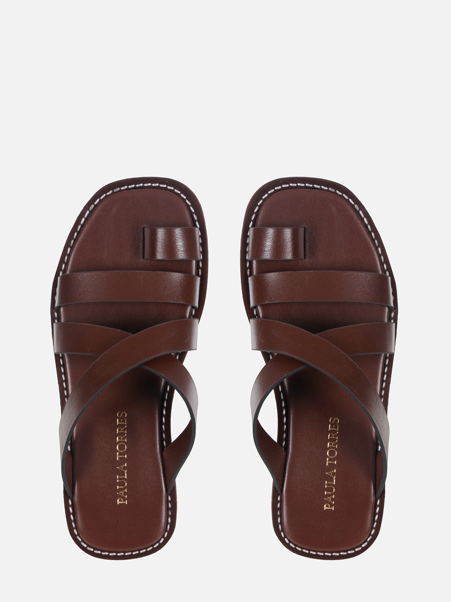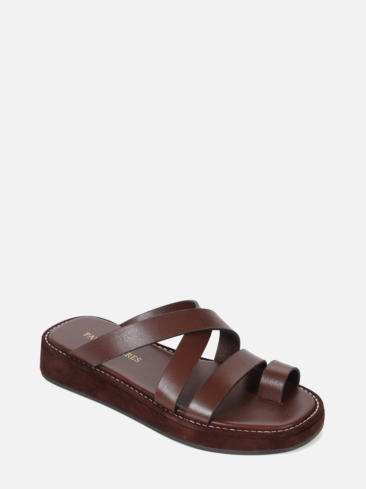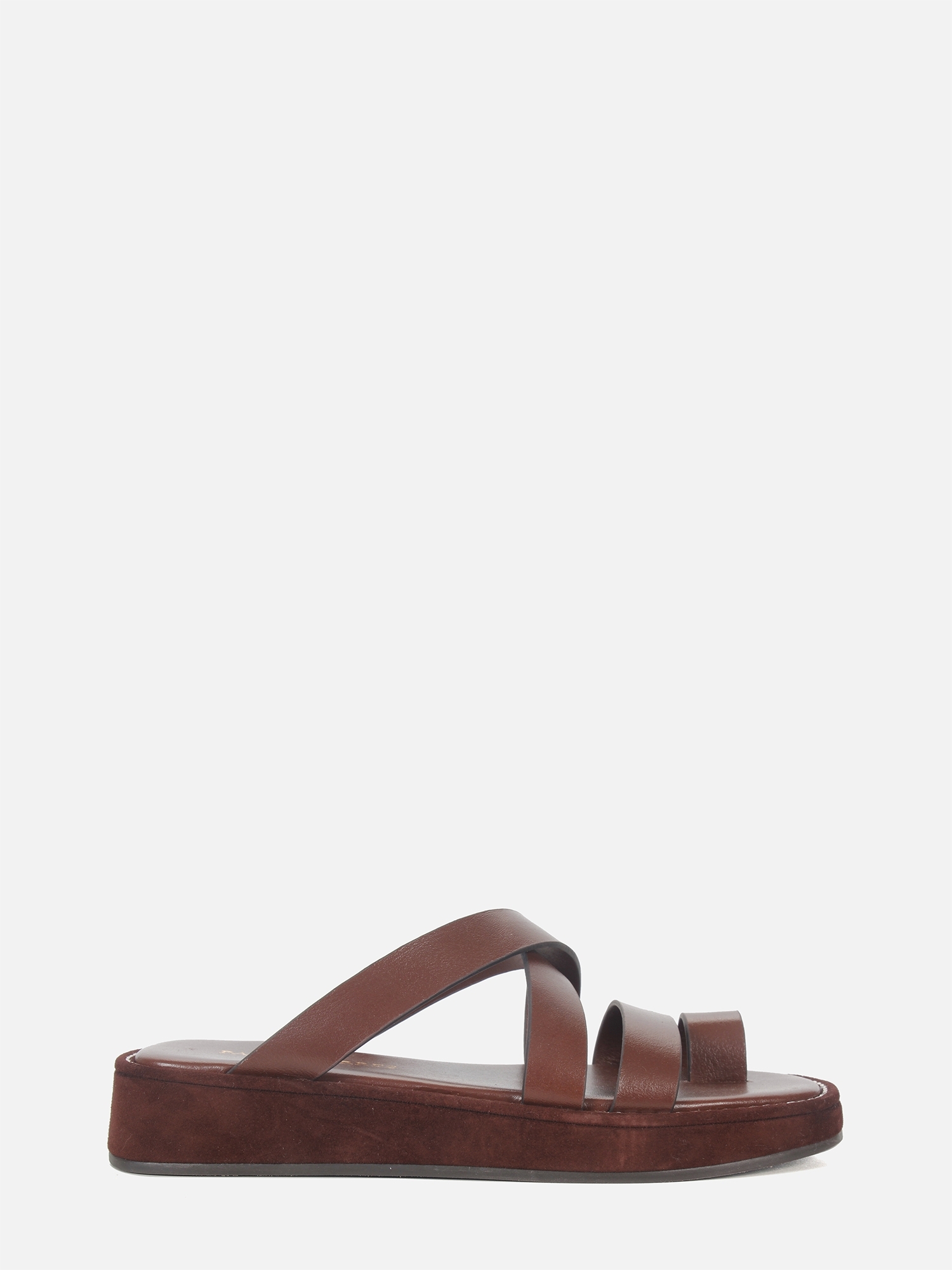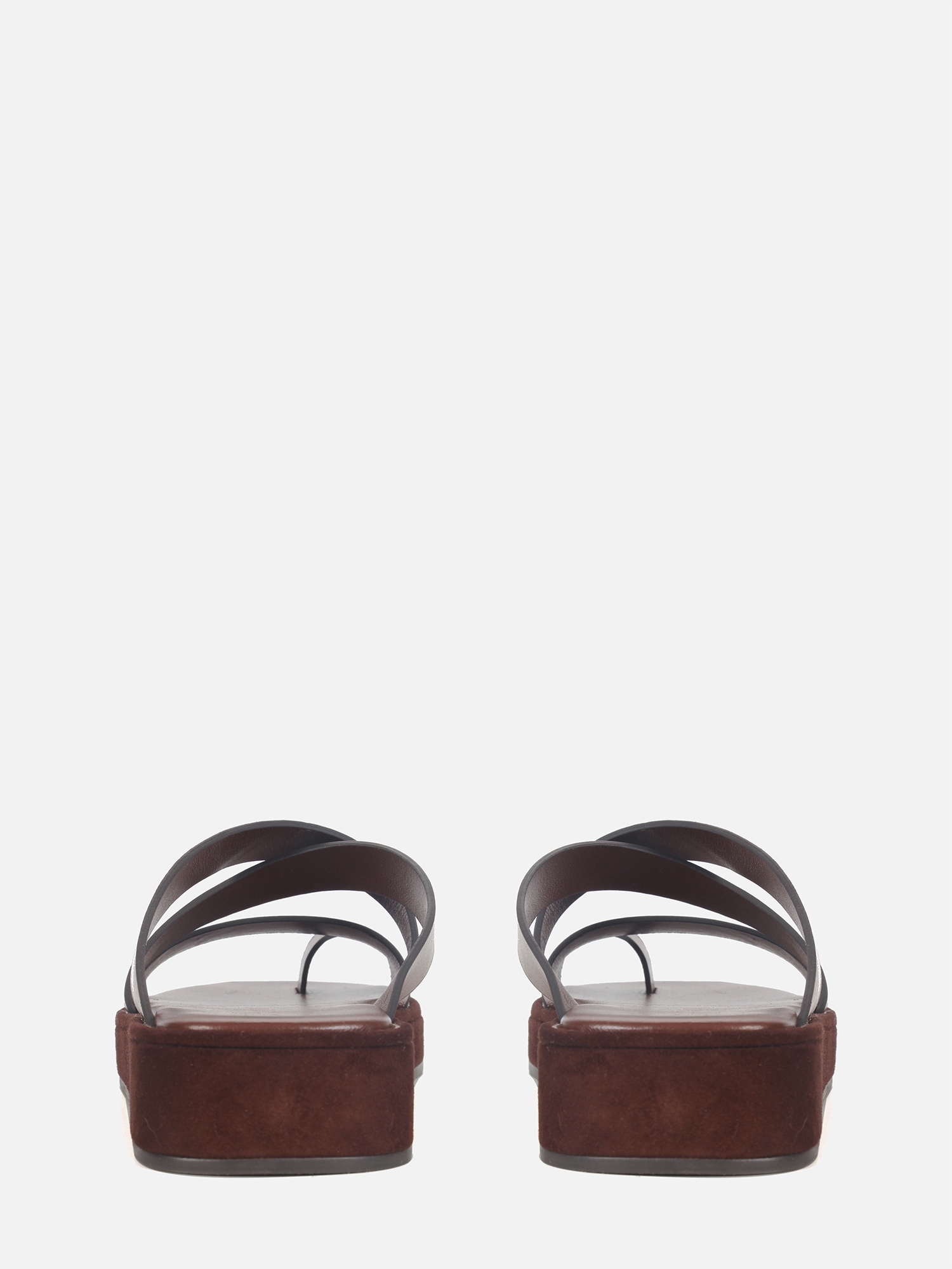 A vira da sandália flatform com tiras recebe revestimento em couro com pesponto contrastante, enquanto a forração da flatform é feita em camurça — um detalhe que valoriza o design e reforça o cuidado com os acabamentos. O solado em borracha garante leveza, conforto e estabilidade, tornando o modelo ideal para o uso diário.