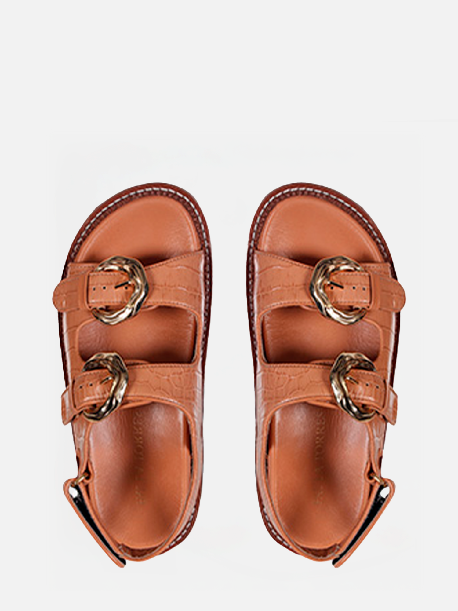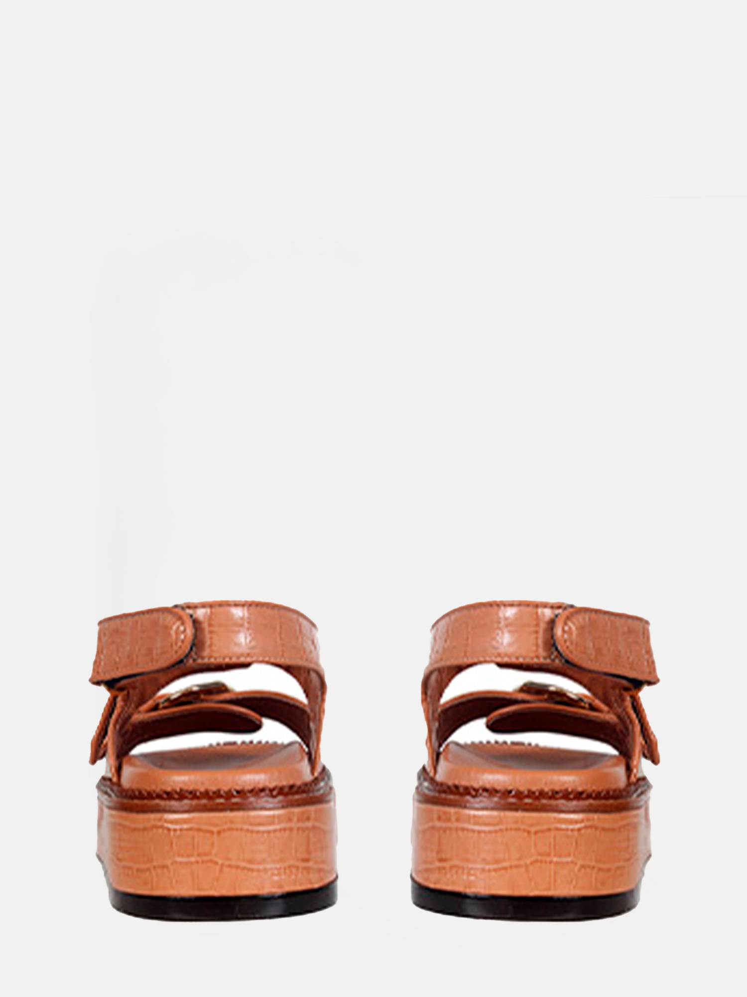 A Flatform Lavinia é confeccionada em couro com uma discreta estampa croco. O modelo apresenta bico arredondado e palmilha anatômica para conforto. Na parte superior, tiras largas com uma fivela exclusiva em metal dourado ajustam o modelo ao pé, enquanto o fechamento é feito por velcro no calcanhar. O salto plataforma é revestido em couro e possui uma vira serrilhada com pesponto contrastante, adicionando um toque de estilo único à peça.