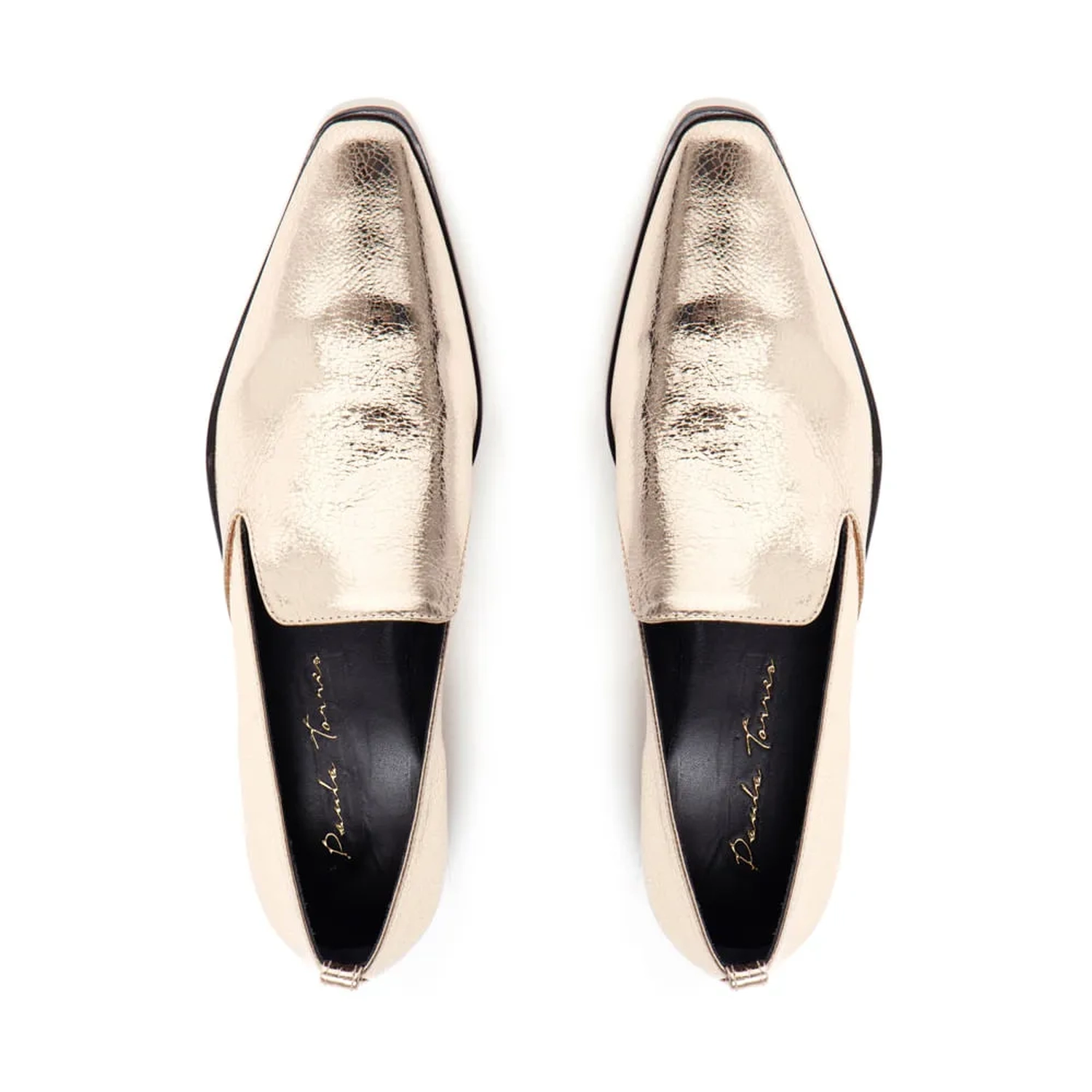 Mocassim Lola em couro texturizado e metalizado. A peça possui bico quadrado alongado, e seu diferencial está em sua forração e solado em couro. Confortável, estiloso e muito versátil, o Mocassim Lola que esteve presente nas Semanas de Moda, prova que também é perfeito para o dia a dia. Cor: Ouro