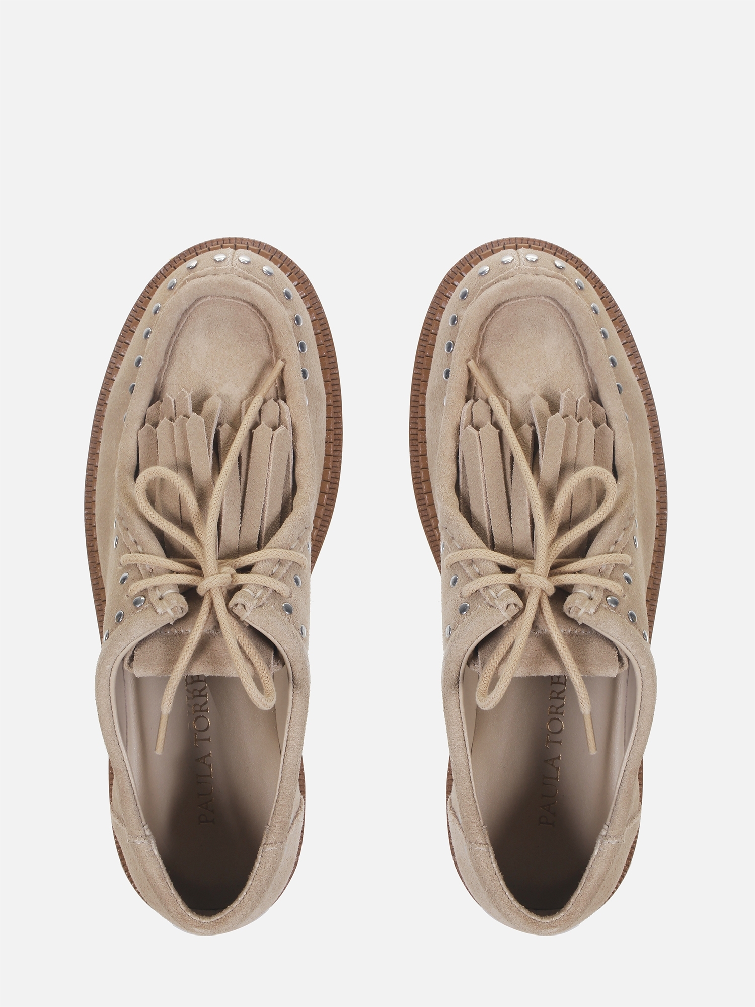 O Mocassim Orion Bege traduz o equilíbrio entre tradição e atitude. Confeccionado em camurça de alta qualidade, o modelo é inspirado no clássico Wallabee e traz bico arredondado, fechamento por amarração e um design limpo, que valoriza o conforto e a autenticidade. As franjas aplicadas na parte superior, junto às tachas metálicas, atualizam o visual com um toque contemporâneo e cheio de personalidade.