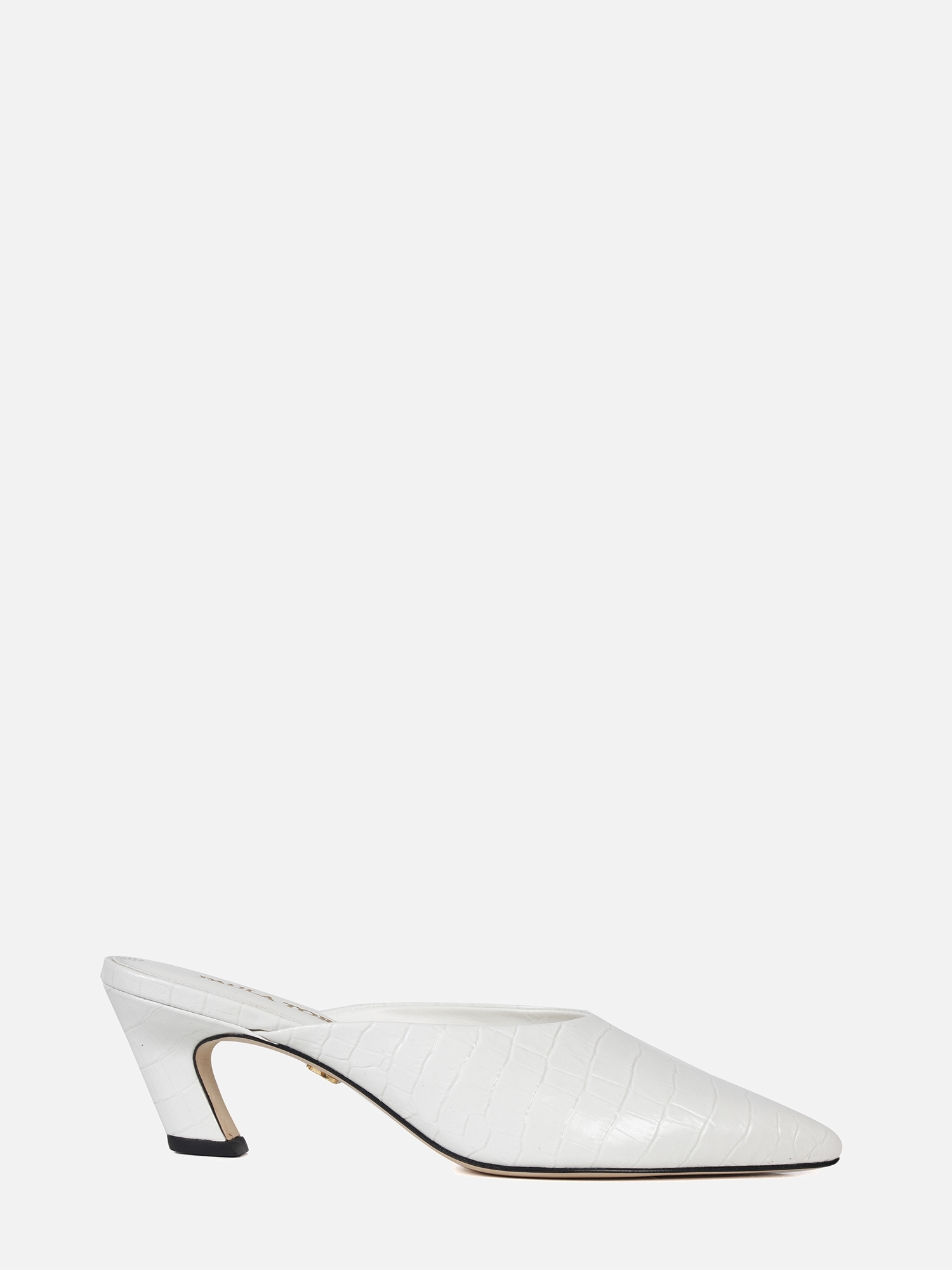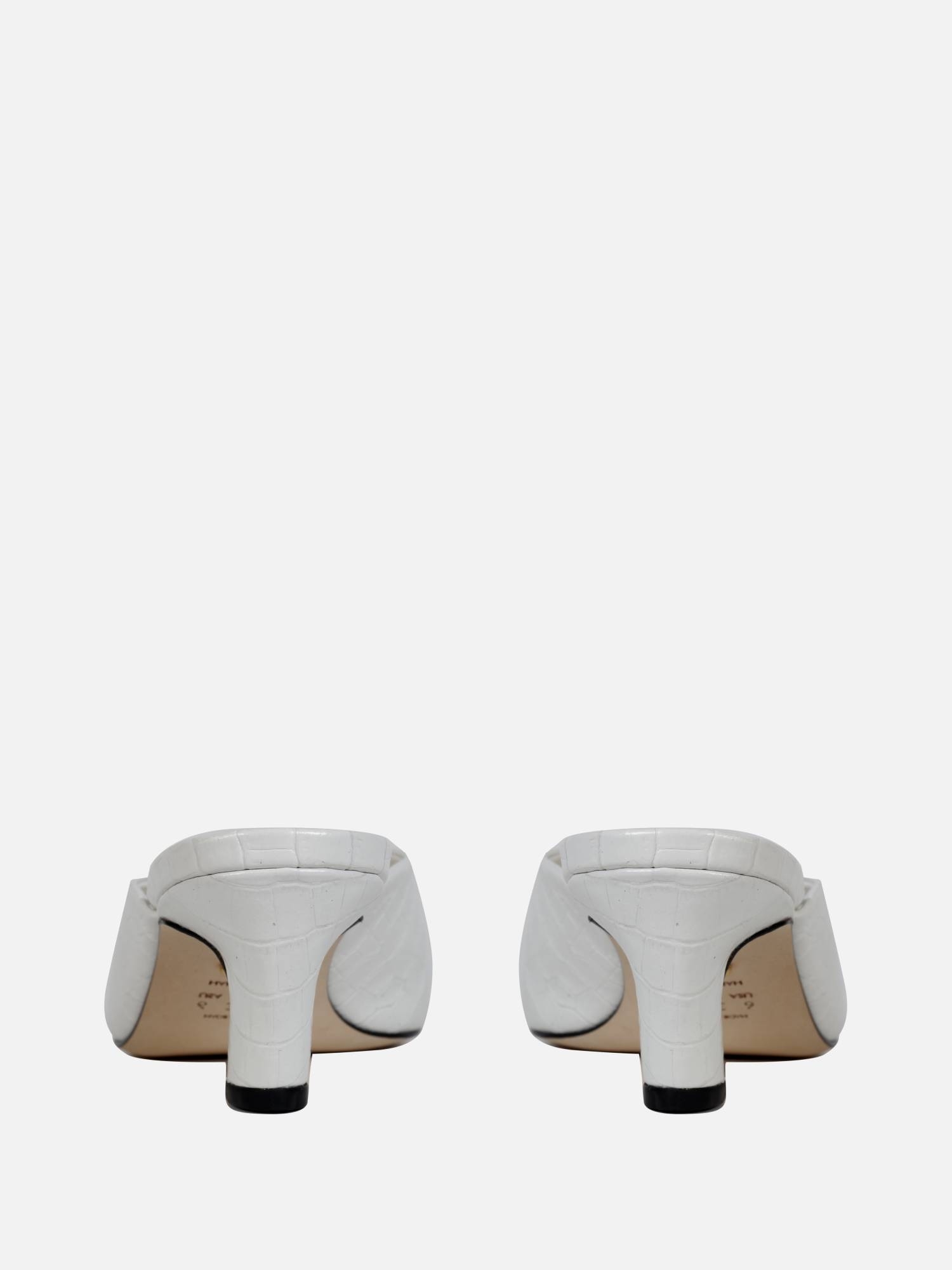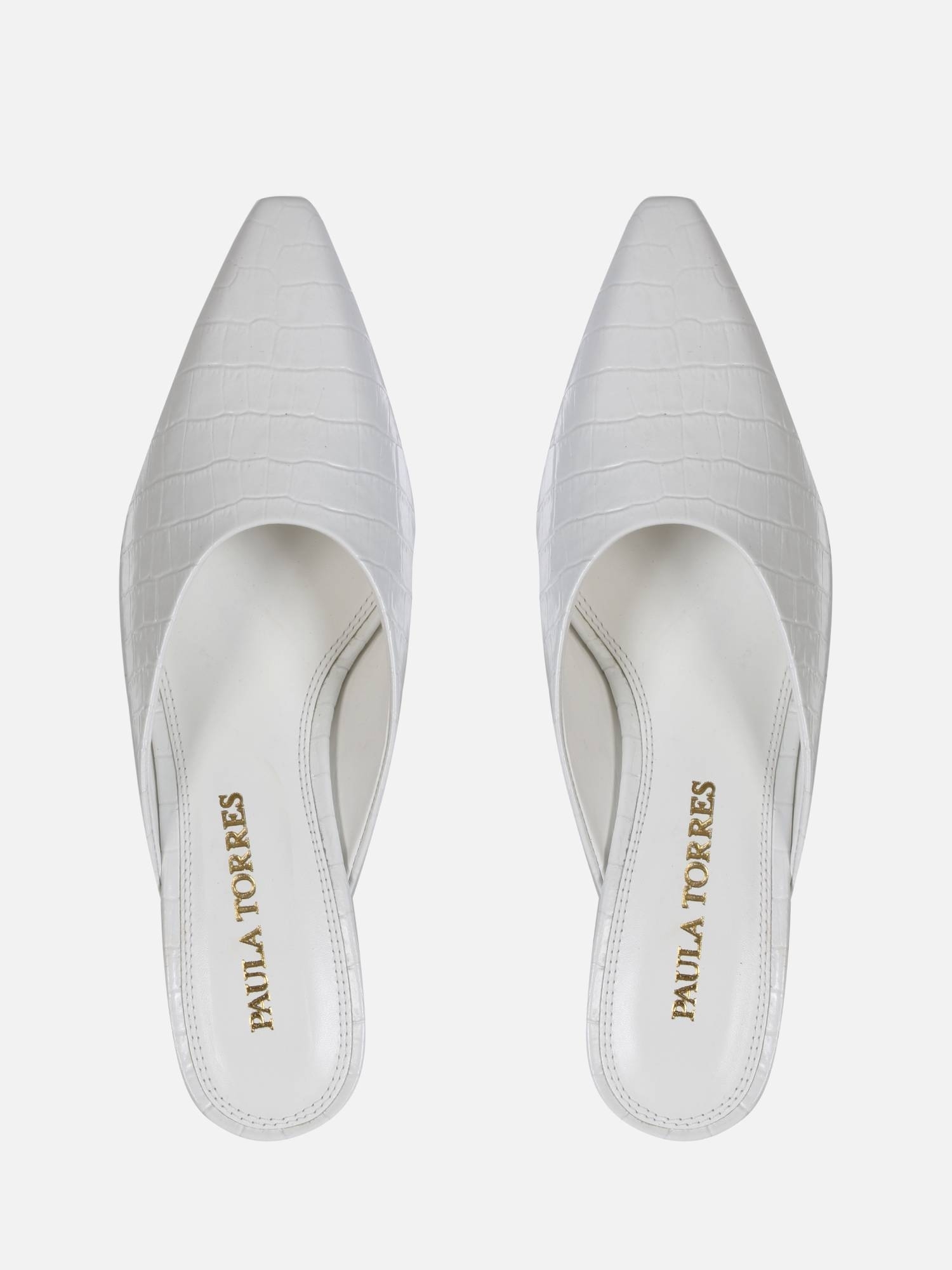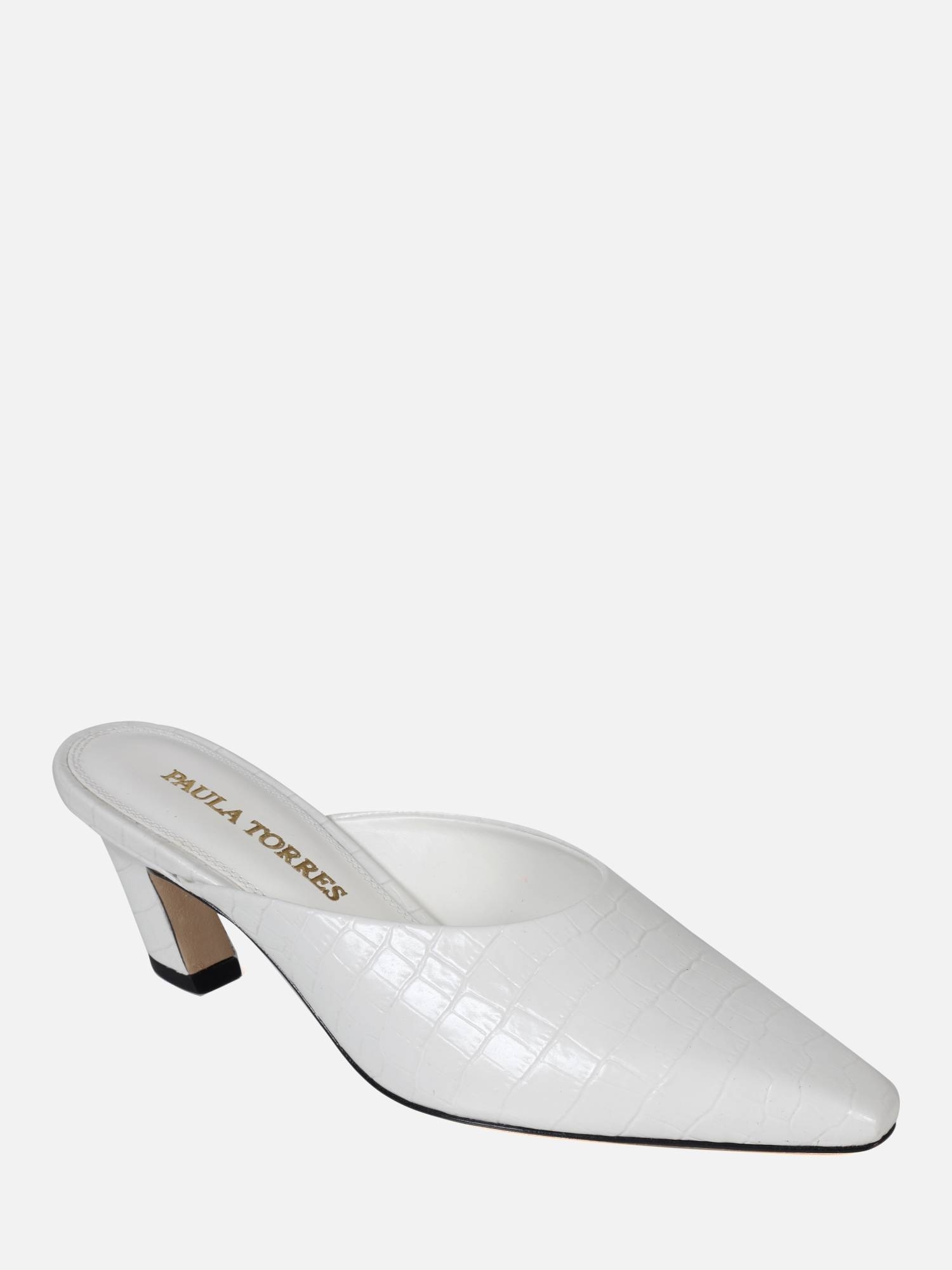 O Mule Carmela é feito em couro com superfície texturizada em croco. O modelo possui cabedal fechado de bico fino e decote arredondado, com abertura na parte de trás para facilitar o calce. Apresenta um salto médio tipo vírgula e solado em couro.