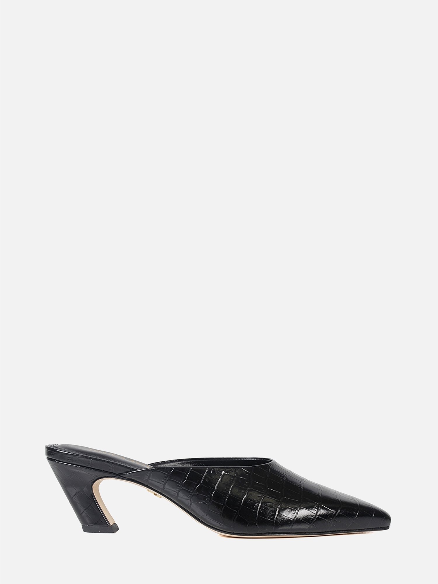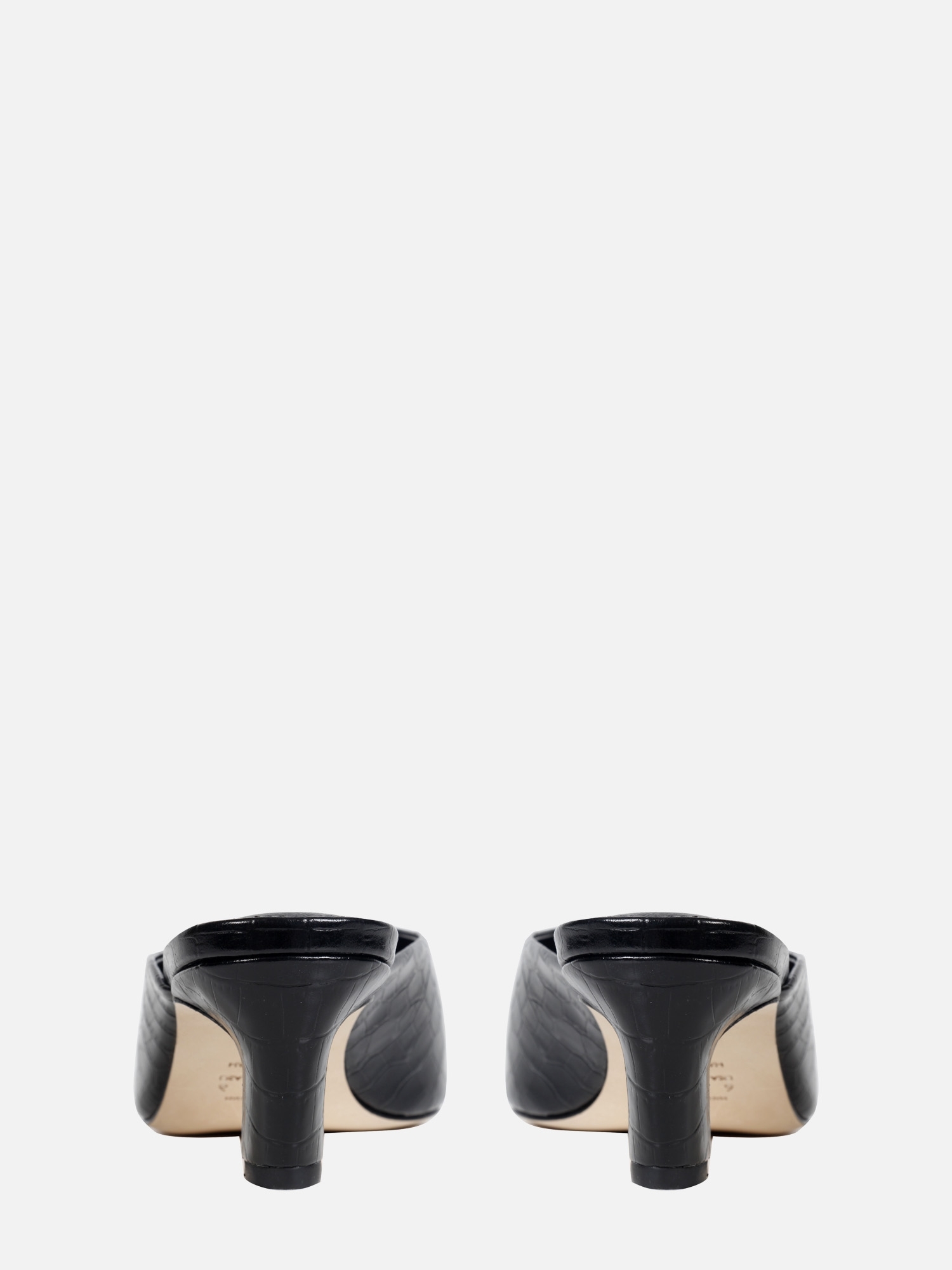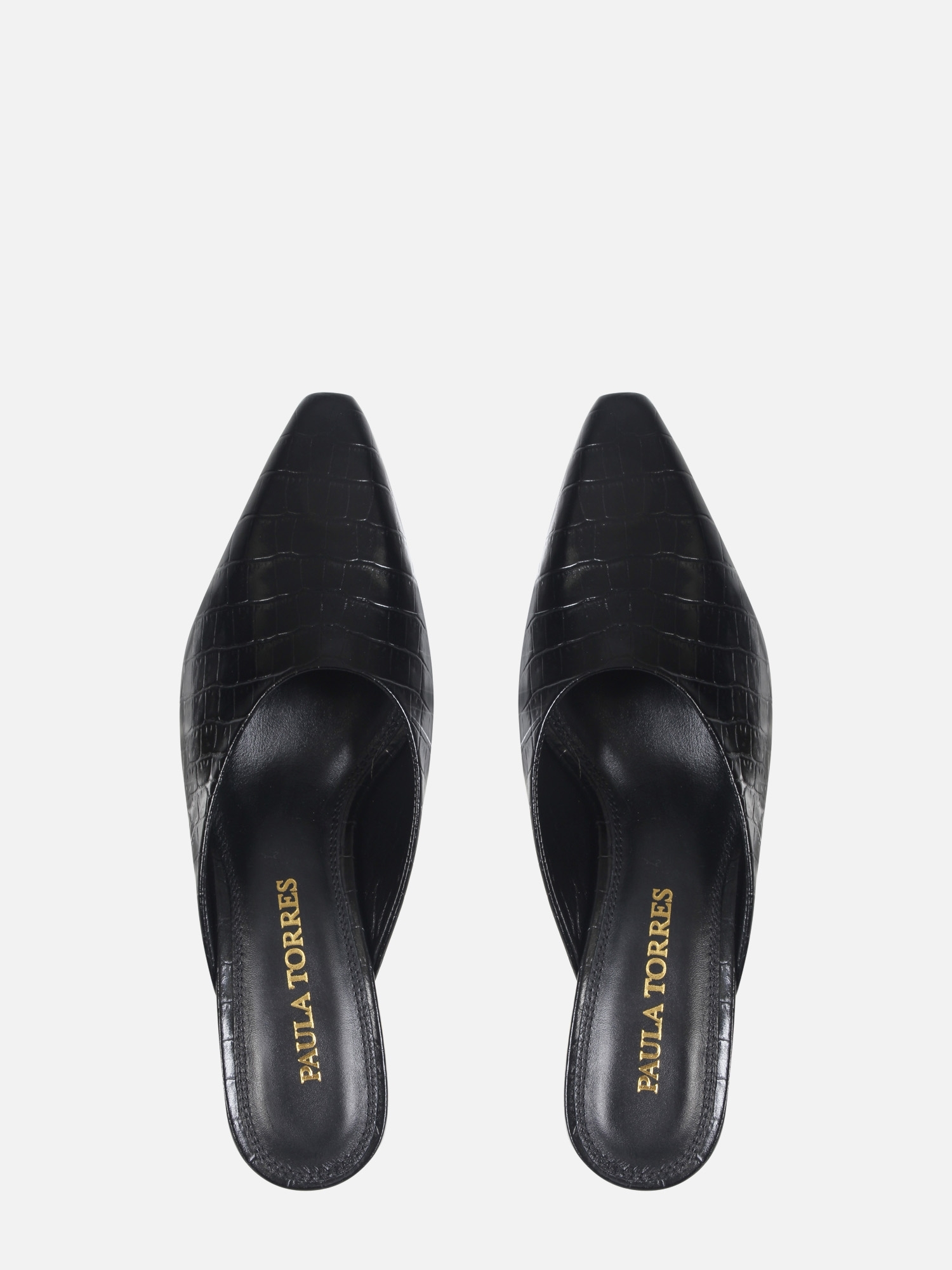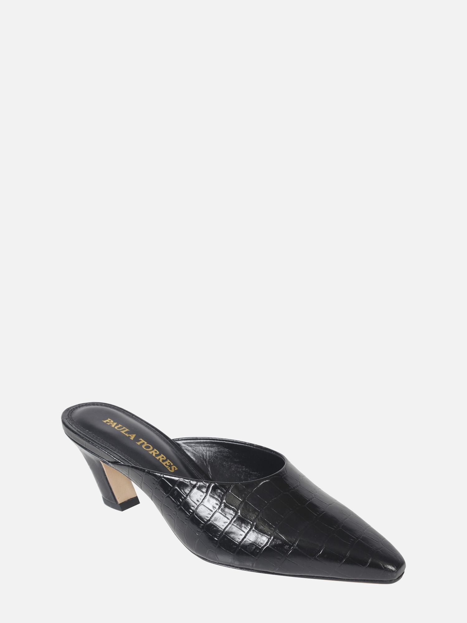 O Mule Carmela é feito em couro com superfície texturizada em croco. O modelo possui cabedal fechado de bico fino e decote arredondado, com abertura na parte de trás para facilitar o calce. Apresenta um salto médio tipo vírgula e solado em couro.