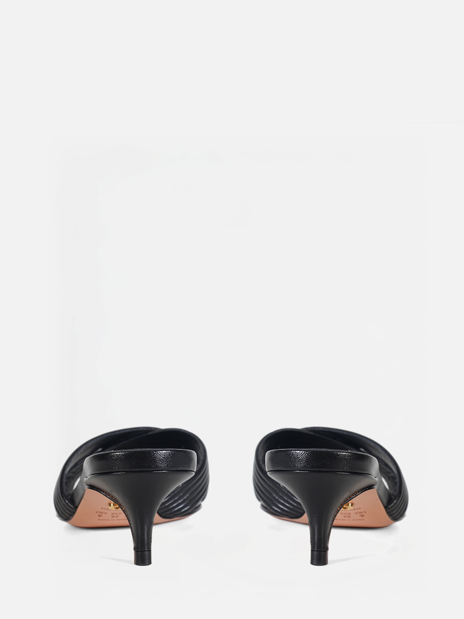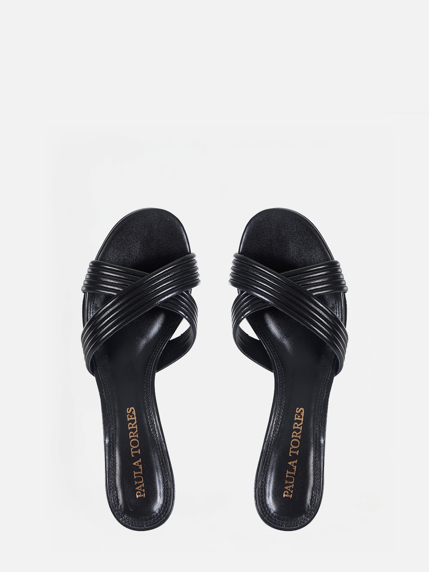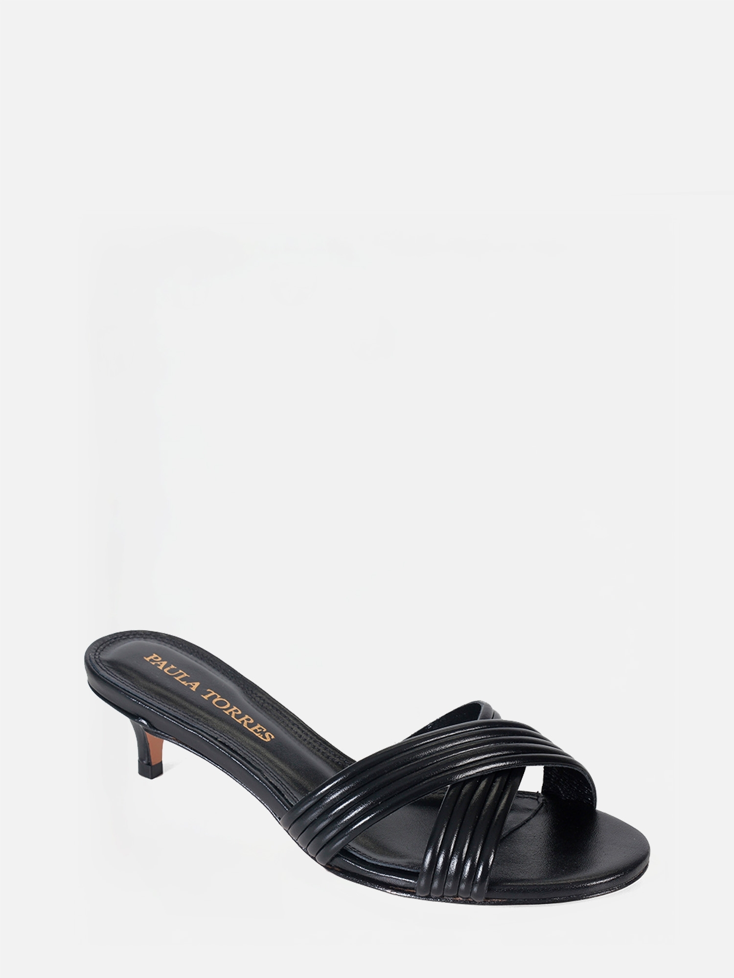 A Mule Duda é confeccionada em couro. O modelo apresenta um salto baixo fino e bico arredondado, destacando-se pelo detalhe superior em formato de "X", revestido por tiras de couro com efeito canelado. O solado em couro assegura durabilidade e um acabamento sofisticado.