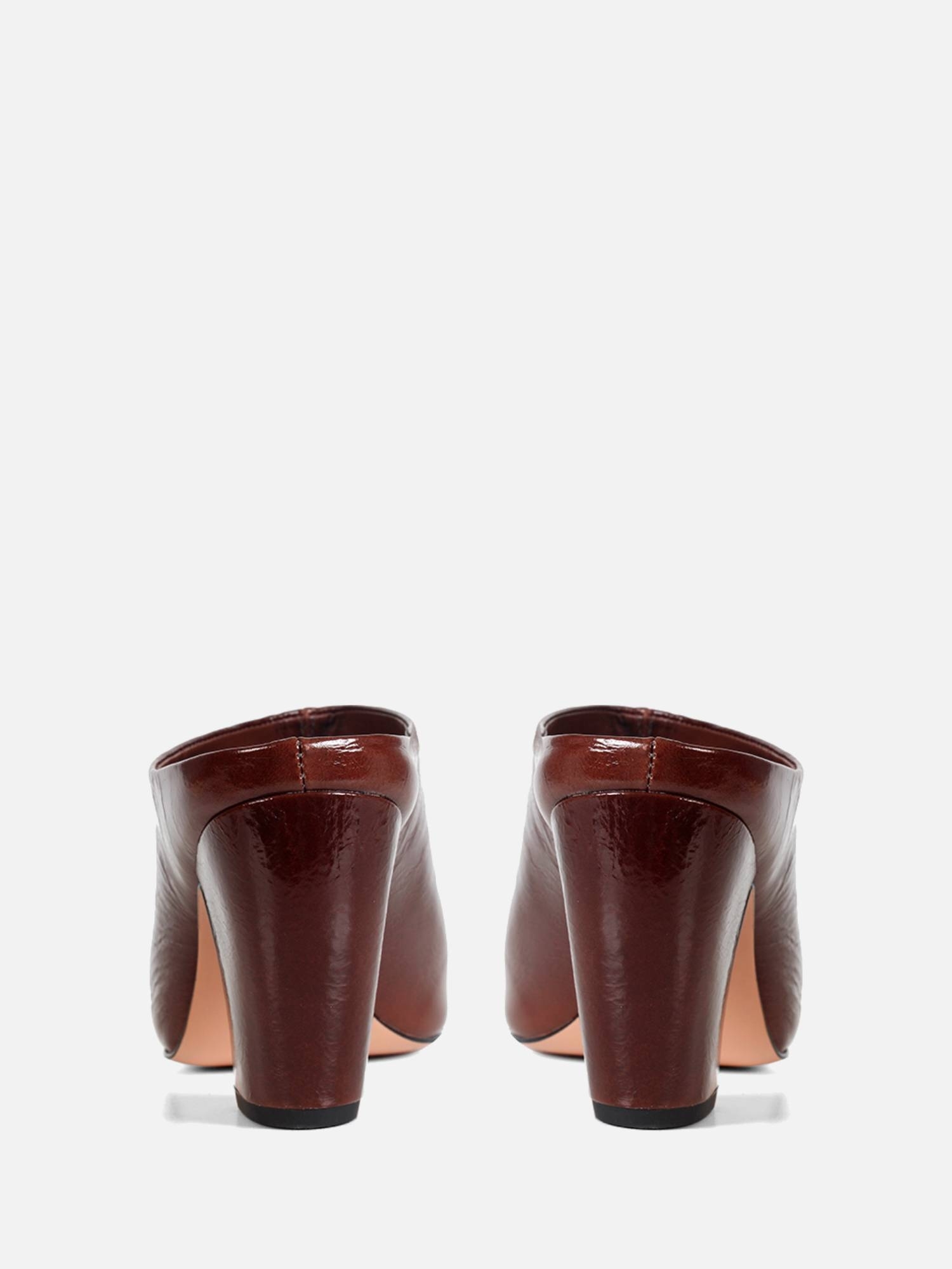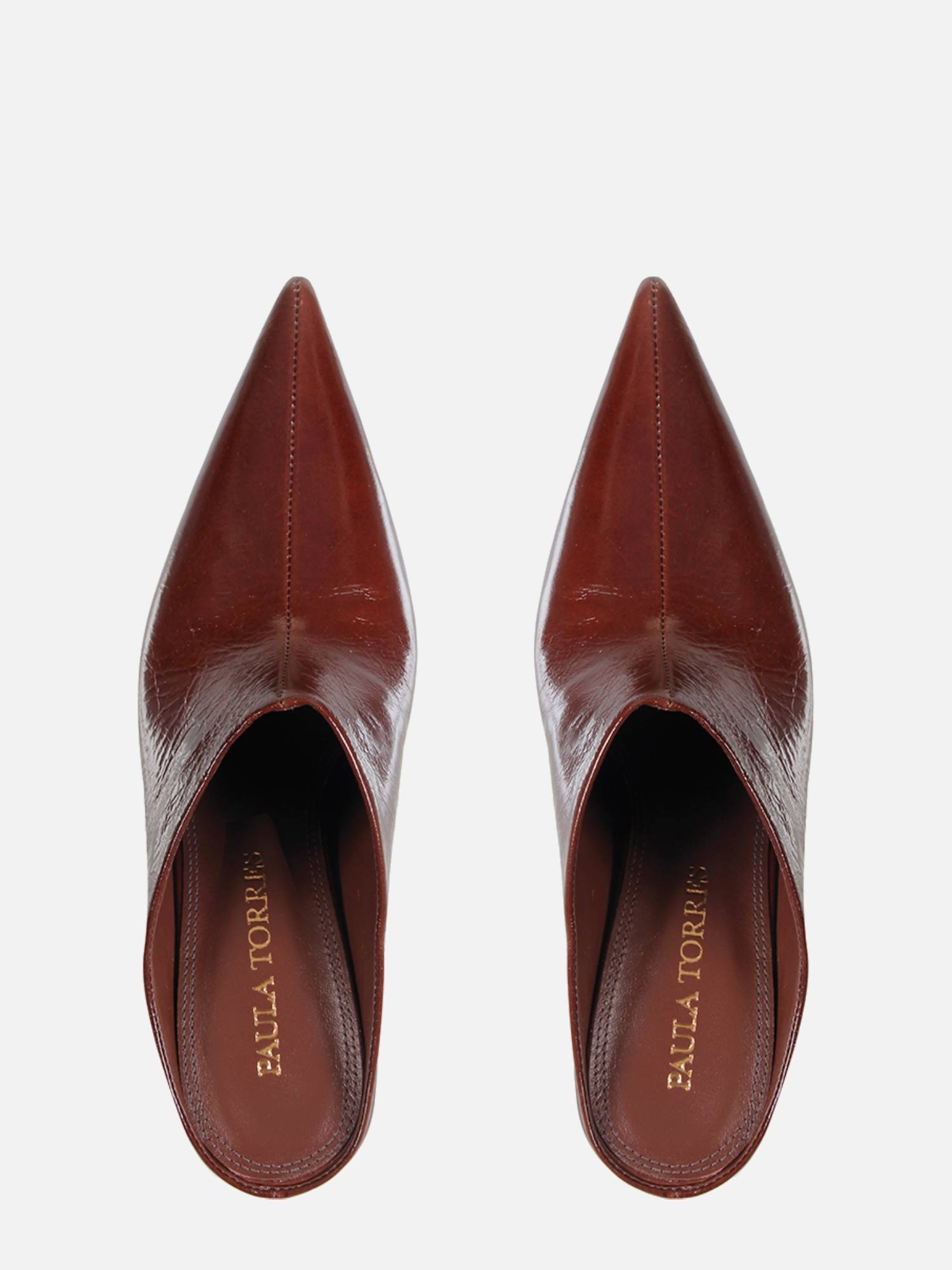 A Mule Julia é produzida em couro macio com um toque de brilho. O modelo de bico fino e salto bloco tipo vírgula proporciona estabilidade e elegância. O cabedal fechado, com costura vertical, é complementado por uma abertura na parte traseira, facilitando o calce. O solado em couro garante durabilidade e um acabamento refinado.