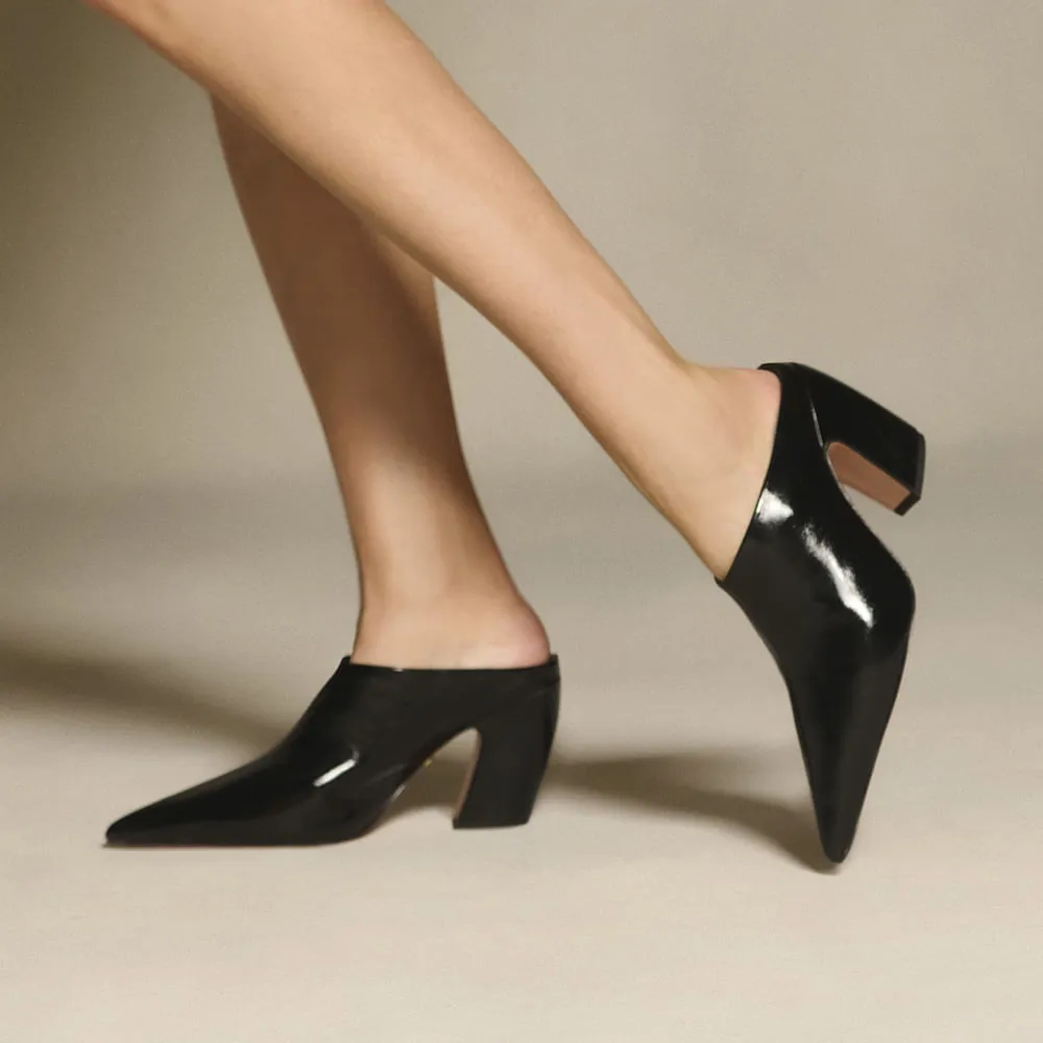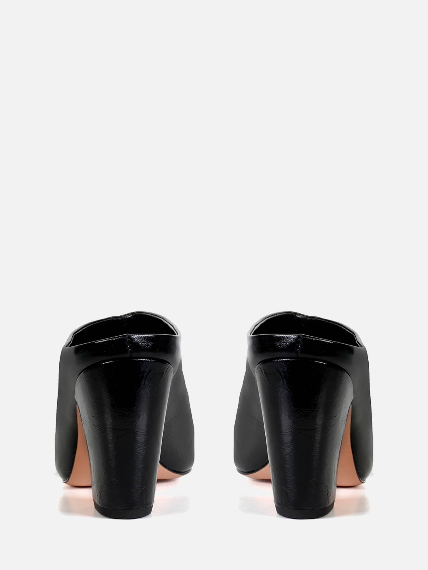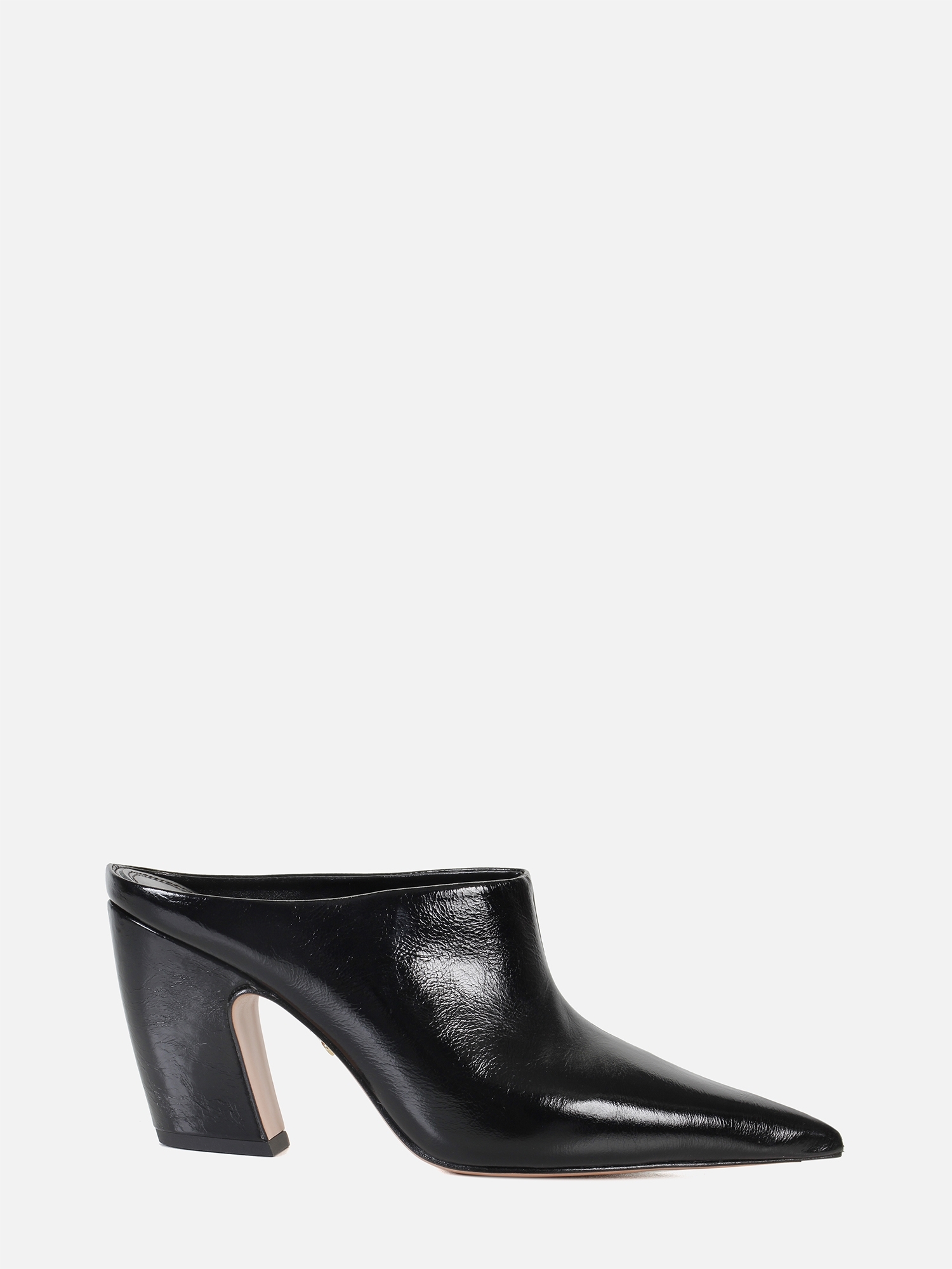 A Mule Julia é produzida em couro macio com um toque de brilho. O modelo de bico fino e salto bloco tipo vírgula proporciona estabilidade e elegância. O cabedal fechado, com costura vertical, é complementado por uma abertura na parte traseira, facilitando o calce. O solado em couro garante durabilidade e um acabamento refinado.