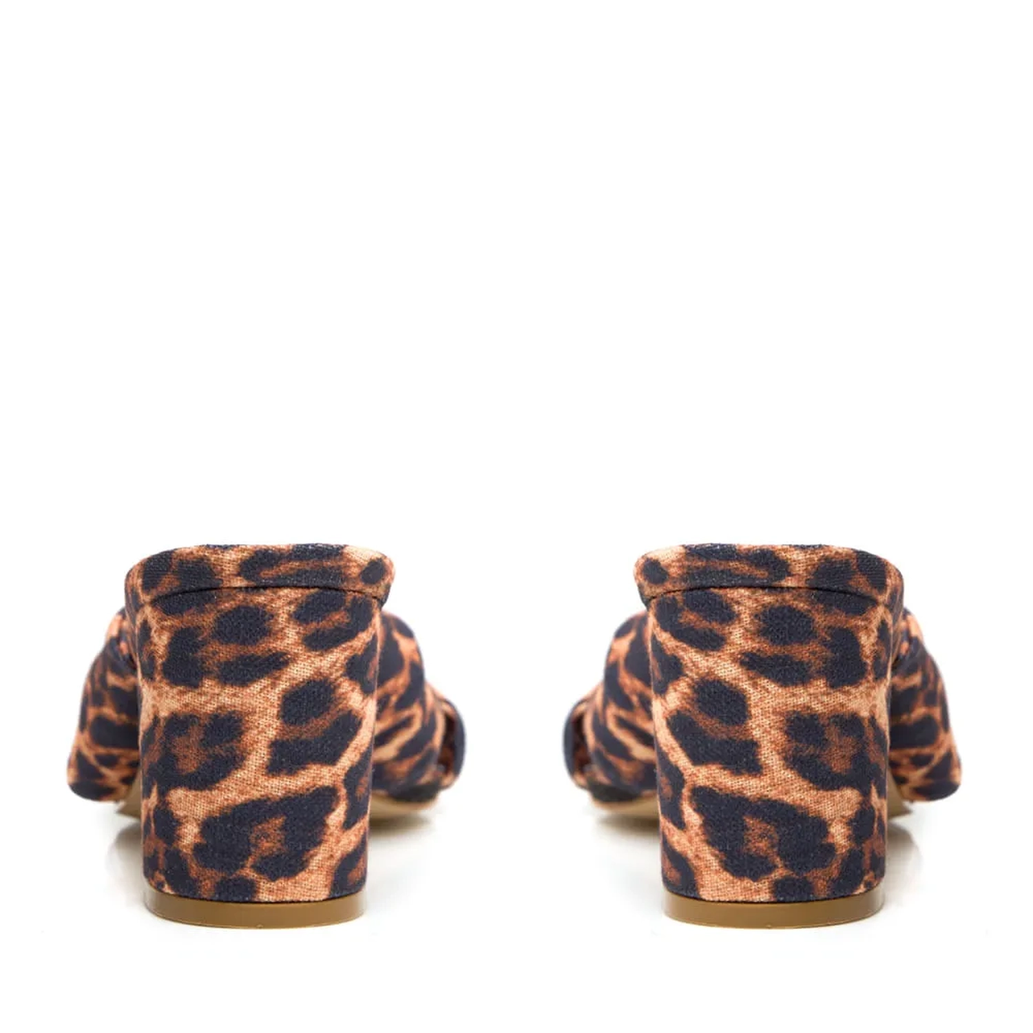 O Mule Lia é produzido em tecido com estampa animal. De tiras largas com detalhe em nó, salto bloco e bico arredondado. É a junção perfeita entre o moderno e todo conforto presente no DNA Paula Torres.