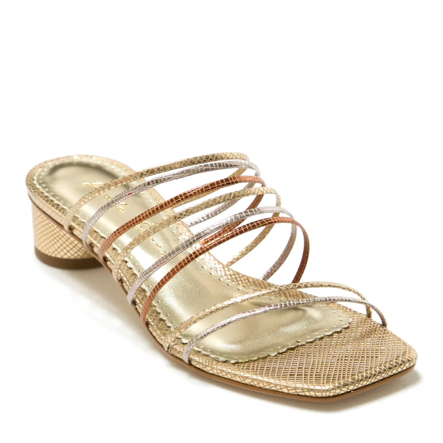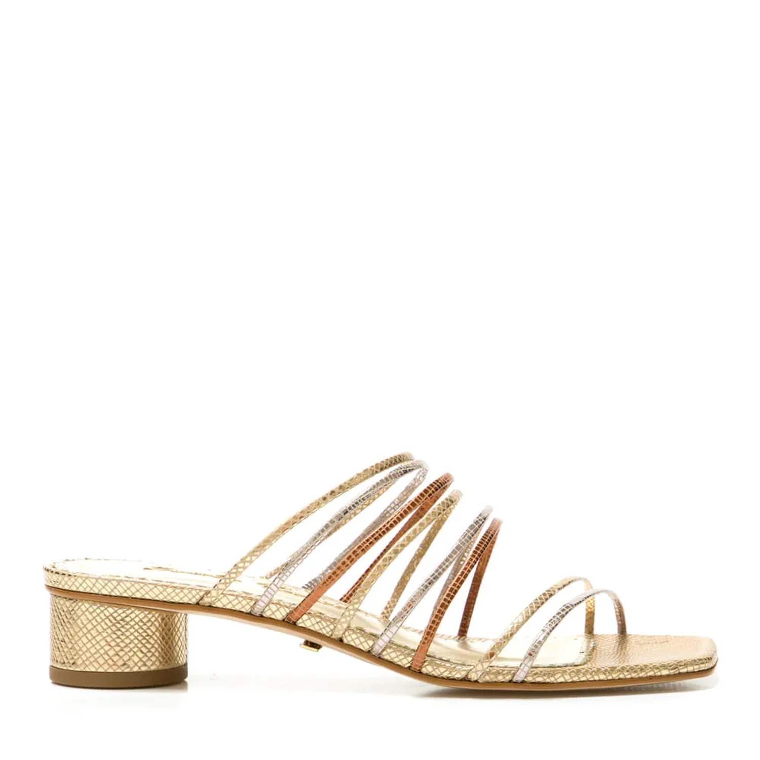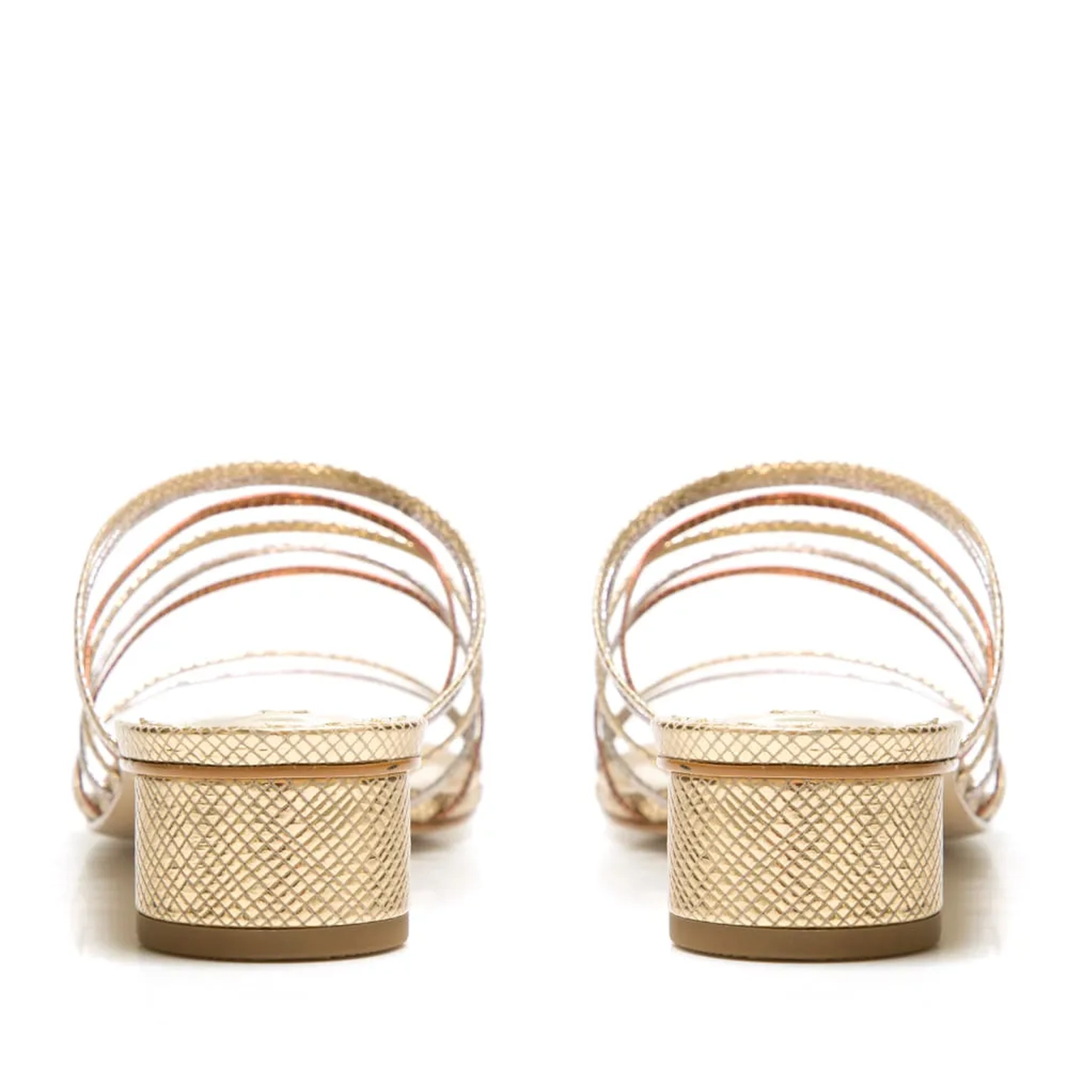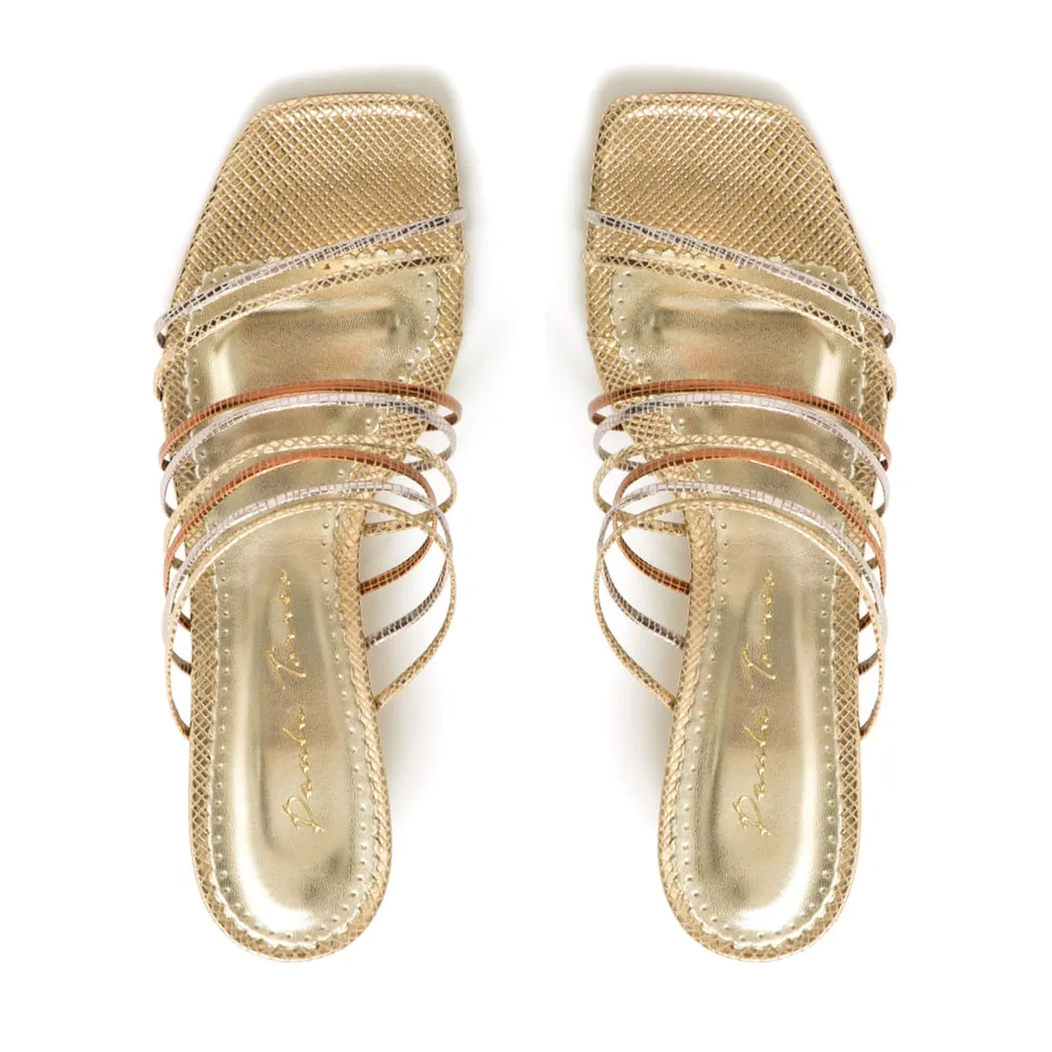 O Mule Madrid é confeccionado em couro metalizado. Sua modelagem com tiras finas, salto redondo e bico quadrado unem o moderno e o conforto presente no DNA Paula Torres.