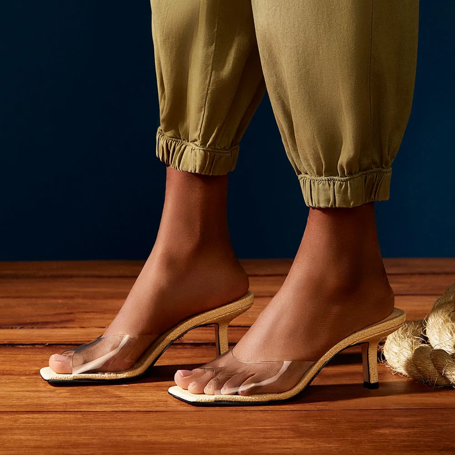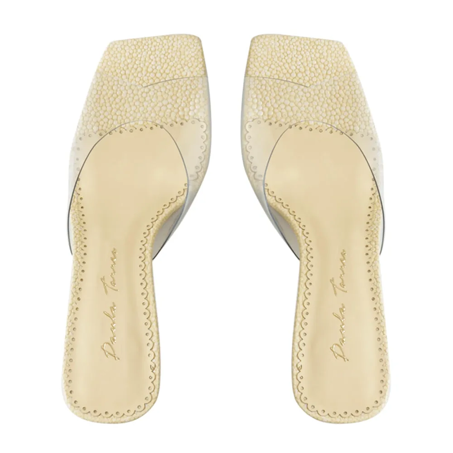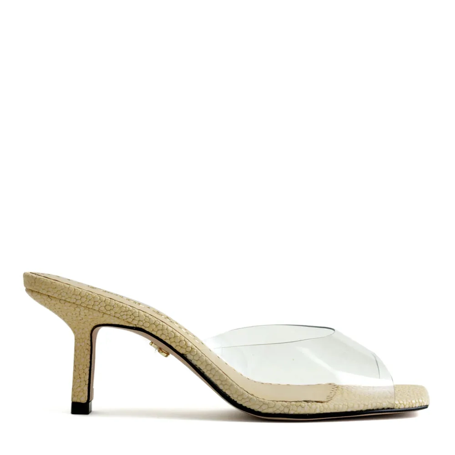 O Mule Meg é confeccionado em couro. Modelagem em bico quadrado e salto fino. Estética minimalista, apresentando um cabedal de vinil, tendência Verão 22.