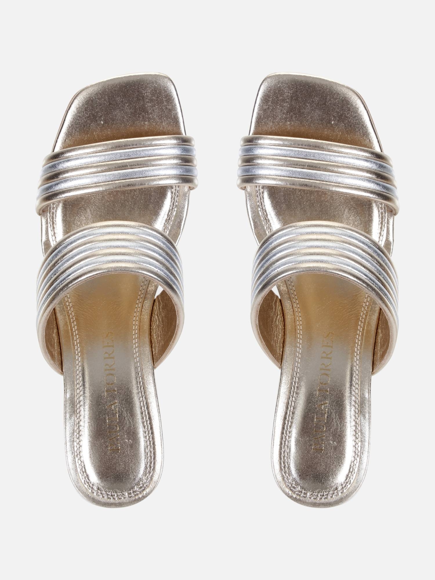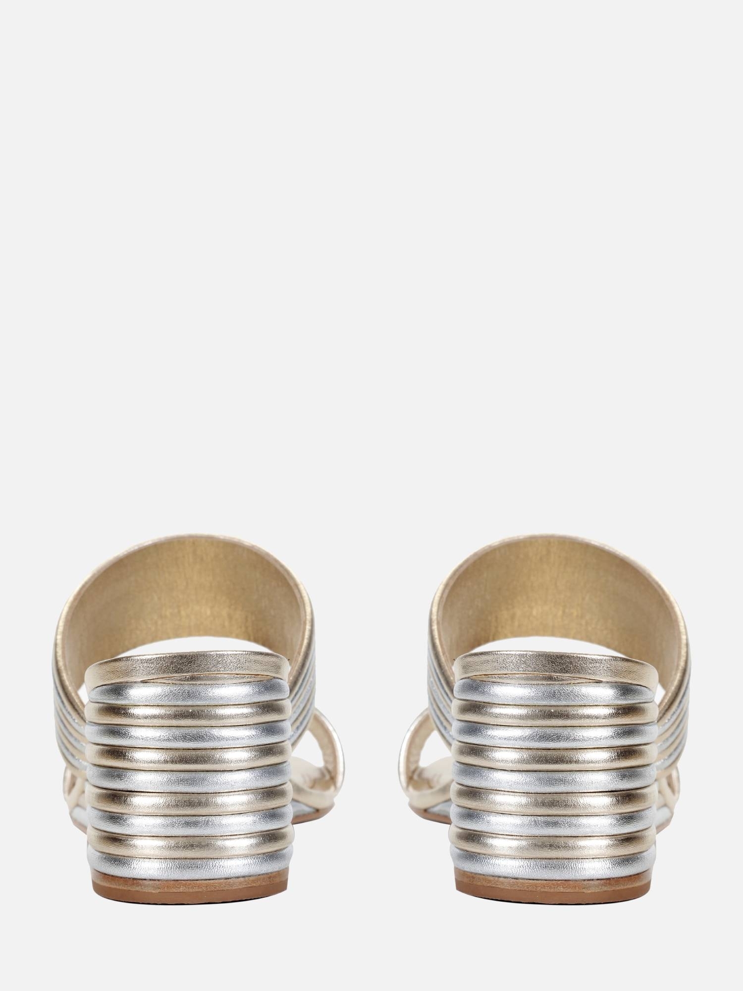 O mule Nina é produzido em couro metalizado. Ele possui duas tiras largas que envolvem o peito do pé, proporcionando estabilidade ao caminhar. Tanto o cabedal quanto o salto Anabela são revestidos com finas tiras de couro, que criam um efeito canelado elegante, combinando as cores prata e saturno. O solado também é feito de couro, completando o visual refinado do modelo.