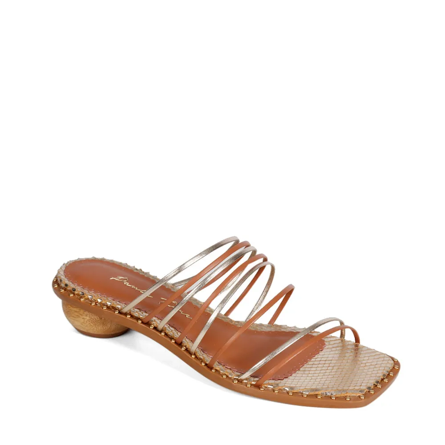 O Mule Pietra é confeccionado em couro. Modelagem em bico quadrado e salto redondo. Cabedal formado por tiras finas metalizadas. Base com tachas metalizadas ao redor de toda palmilha. Uma peça moderna, com muito estilo, totalmente Verão 22!