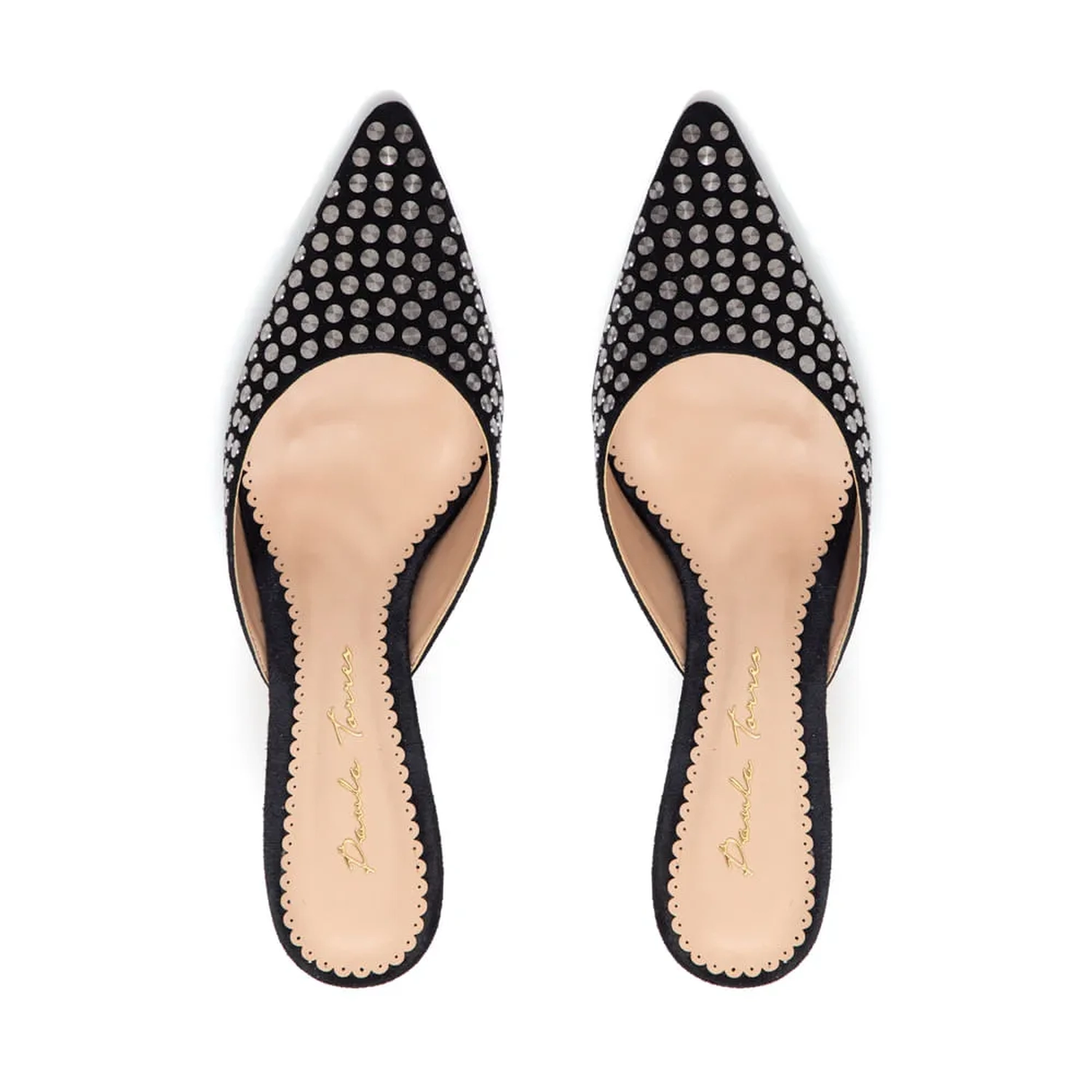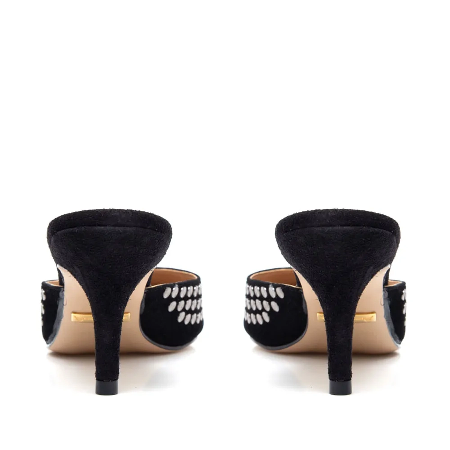 Mule de camurça e aplicação de tachas. Modelo clássico de salto alto e fino, neutro e atemporal. Aquele básico mas com muito estilo e personalidade, pra dar um up num visual mais clean, e deixar a produção ainda mais sofisticada. Cor: Preto