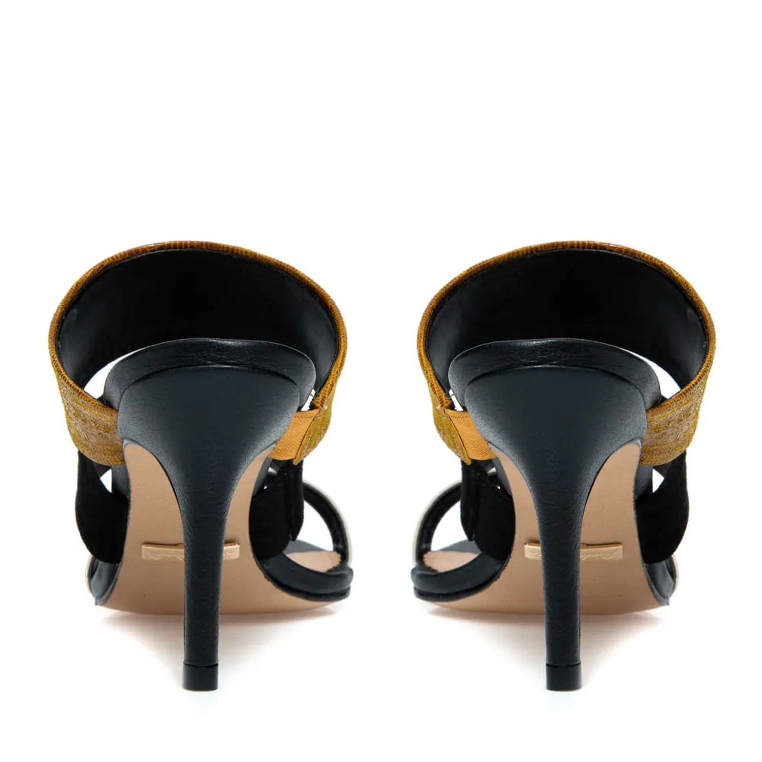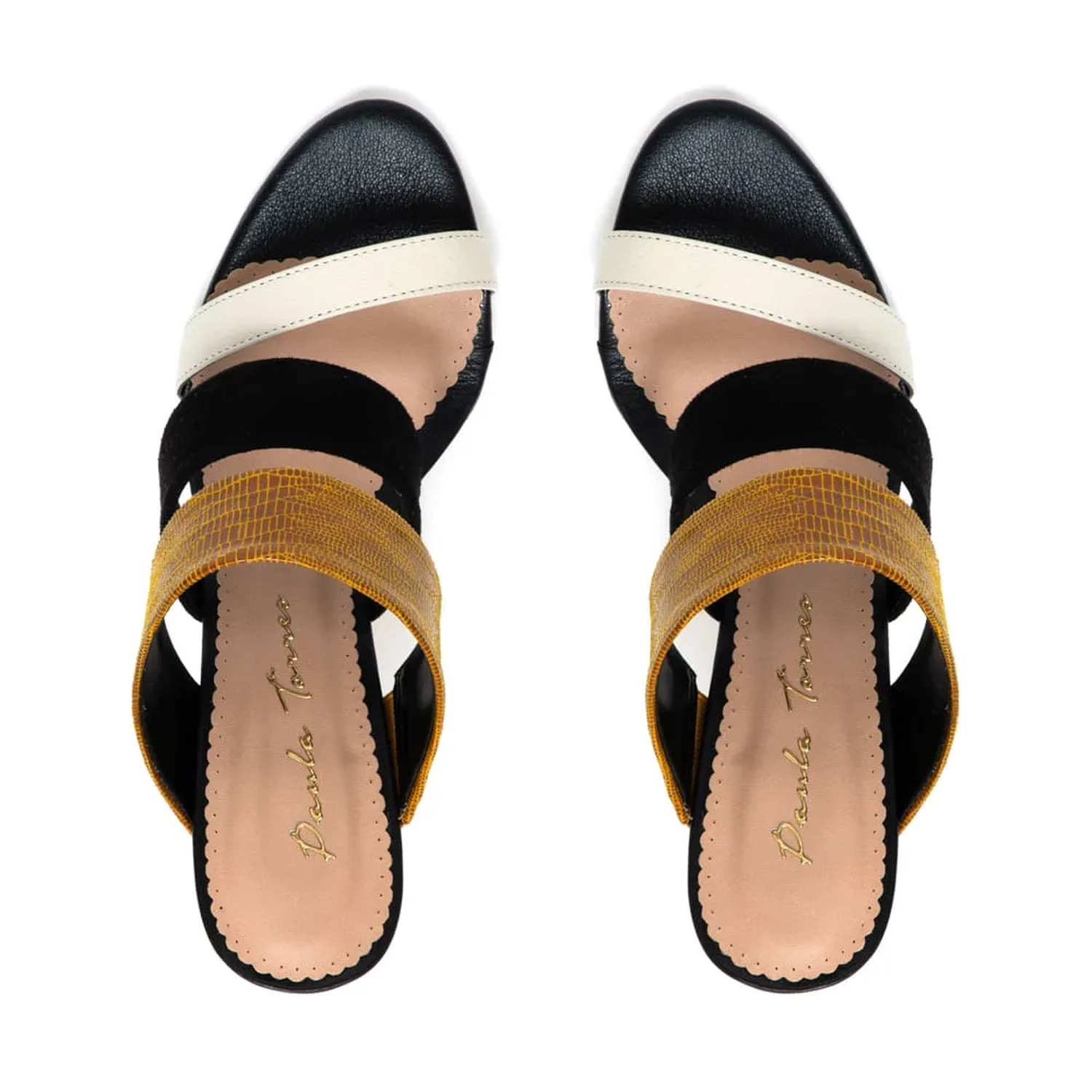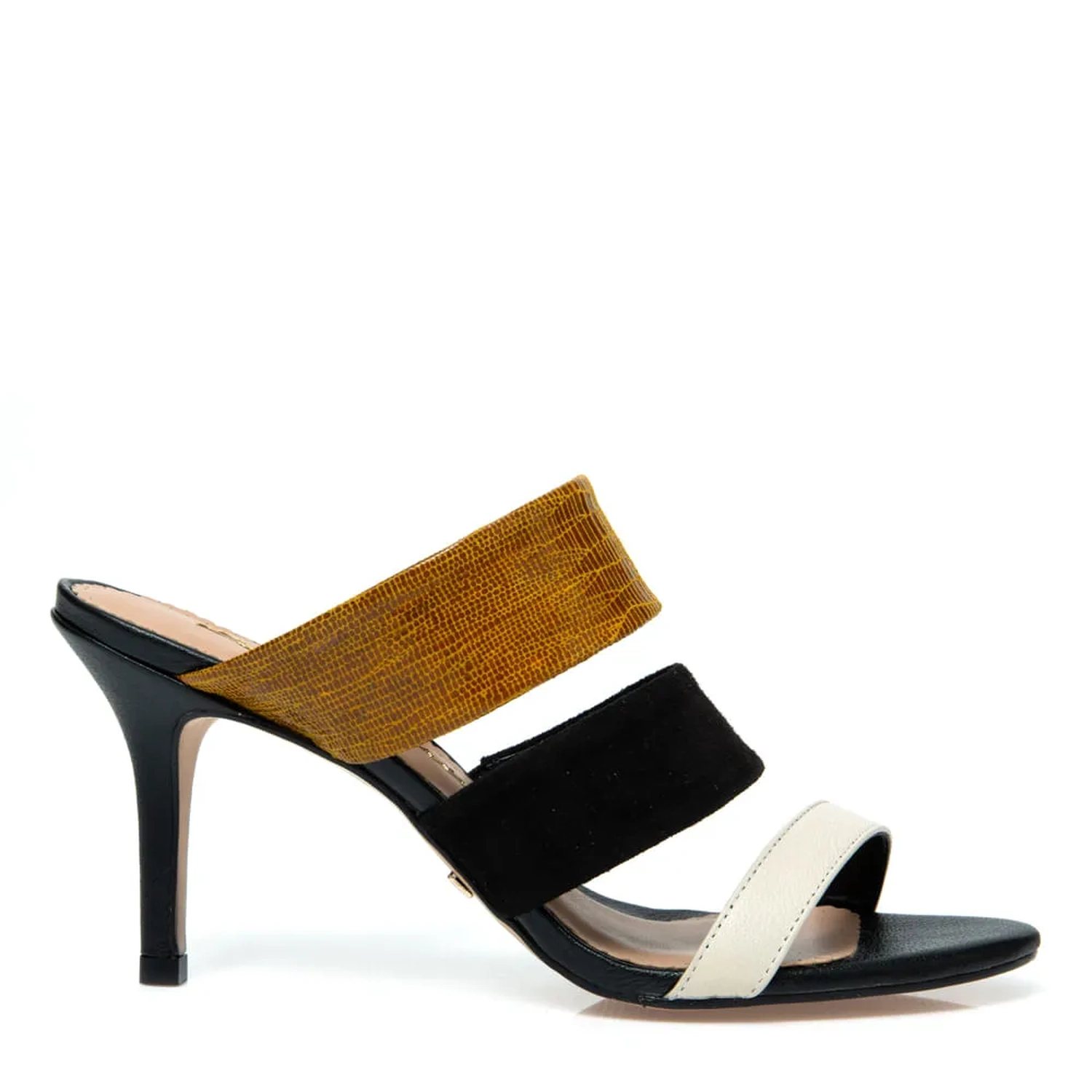 Mule moderno de salto fino, mesclando três cores básicas e fácil de combinar. Ele faz a diferença na produção, dando destaque para os pés e deixando seu look mais elegante e sofisticado.