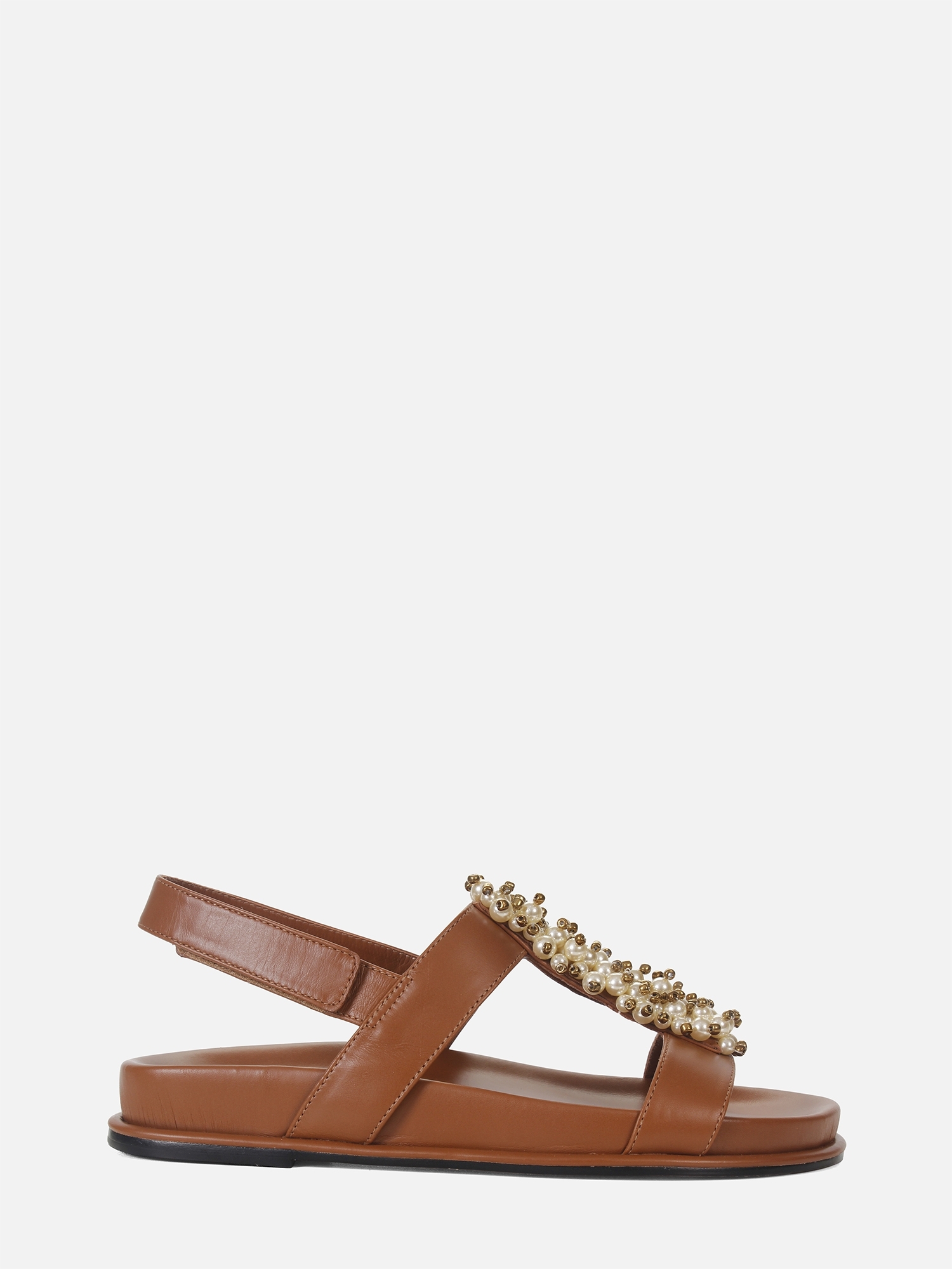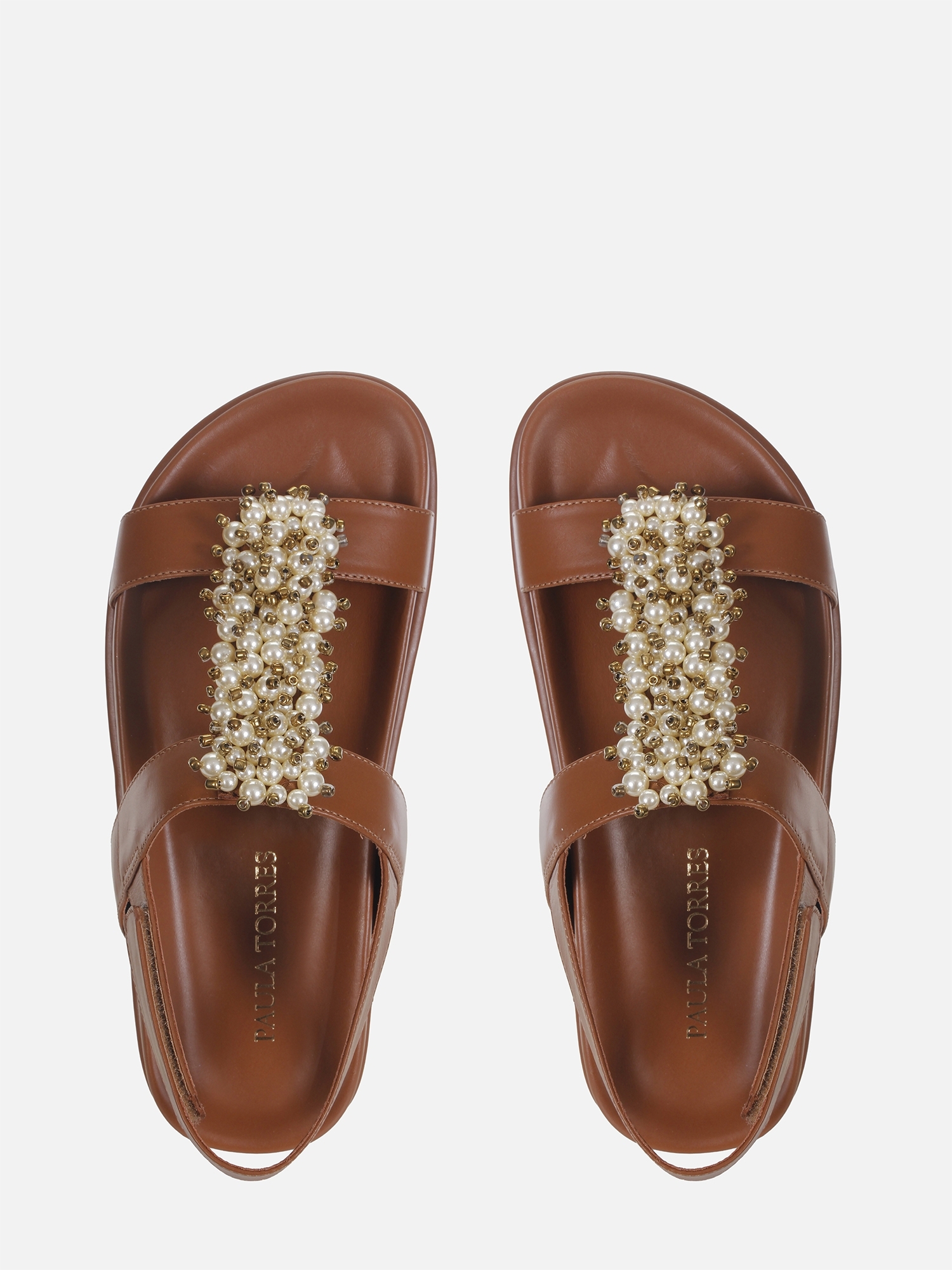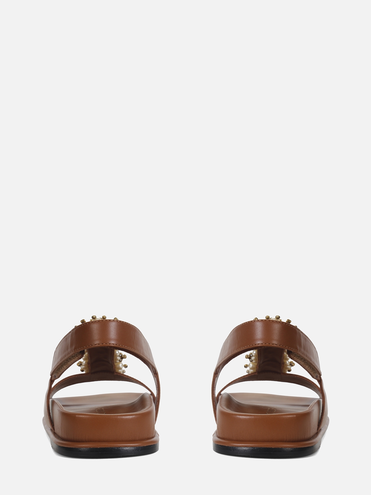 A Sandália Papete Feminina Clara une conforto e sofisticação em um design contemporâneo. Confeccionada em couro, o modelo apresenta tiras largas que garantem firmeza e praticidade, além de uma tira central adornada por pérolas e esferas douradas, que adicionam brilho e elegância.